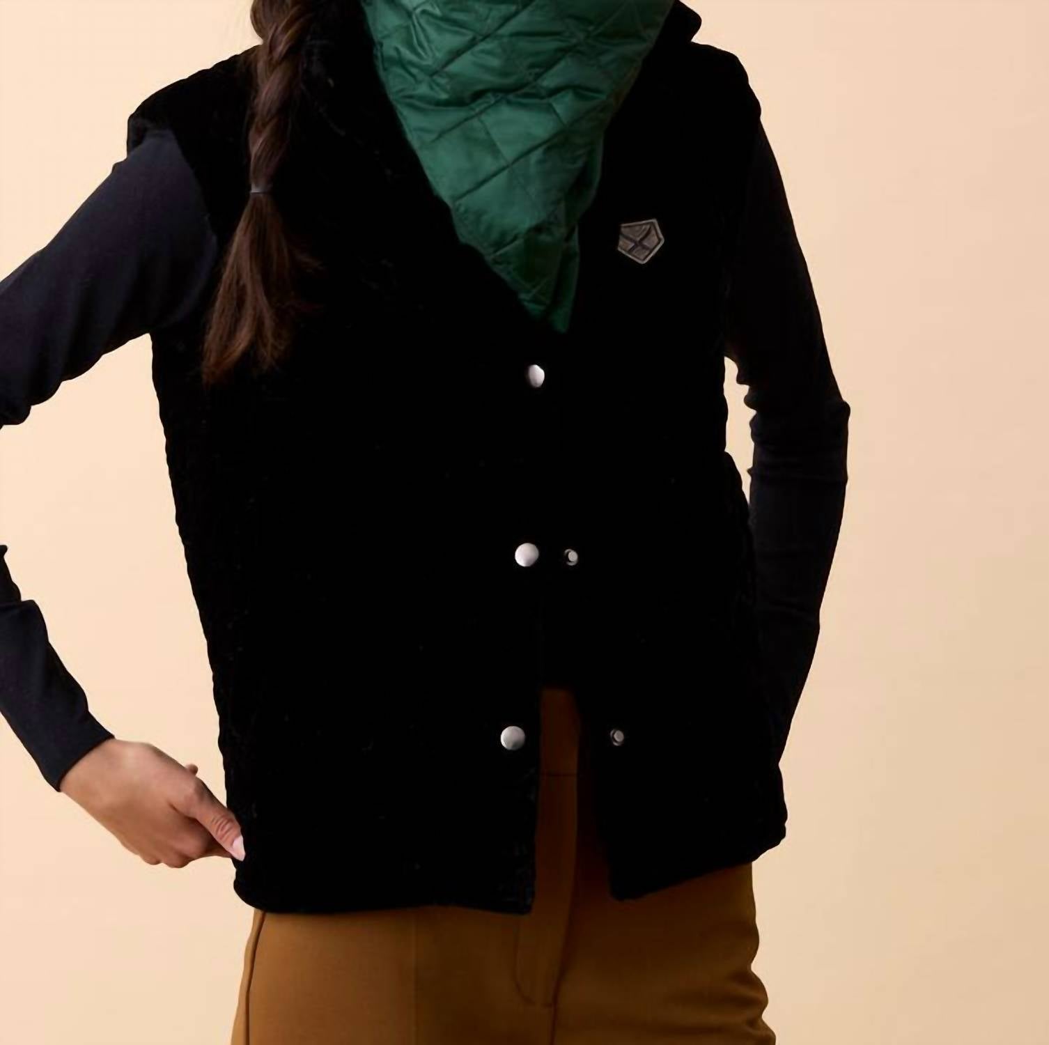 Throw this vest over an all black outfit for a perfectly polished look. Discover the Black Velvet Vest by Powder Puff Collection, a chic addition to any women's wardrobe. Crafted from a luxurious cashmere blend, this sleeveless vest highlights a sophisticated collar and solid pattern for a timeless look. With a convenient snap closure, it's designed for effortless elegance. Note: No specific care instructions provided.