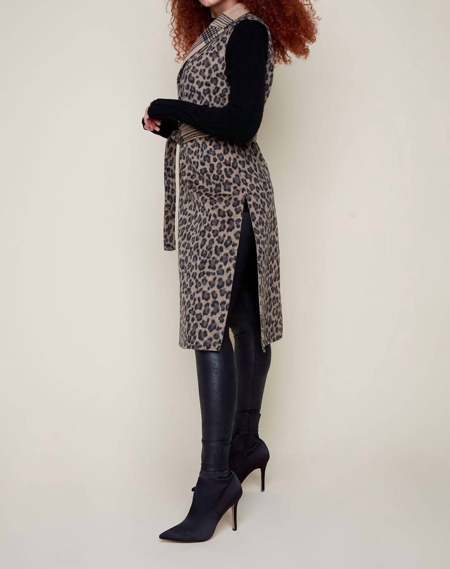 Throw this vest over an all black outfit for a perfectly polished look. Presenting the Reversible Belted Vest by Renuar, a chic addition to your wardrobe tailored for the fall season. This tan combo vest offers a sleeveless design with stylish side slits and a tie closure for an elegant fit. Crafted from a luxurious blend of 49% Wool, 42% Polyester, 5% Acrylic, 2% Nylon, and 2% Spandex, it suits any animal pattern enthusiast. It embodies the trend of Quiet Luxury, making it perfect for both travel and Thanksgiving occasions.