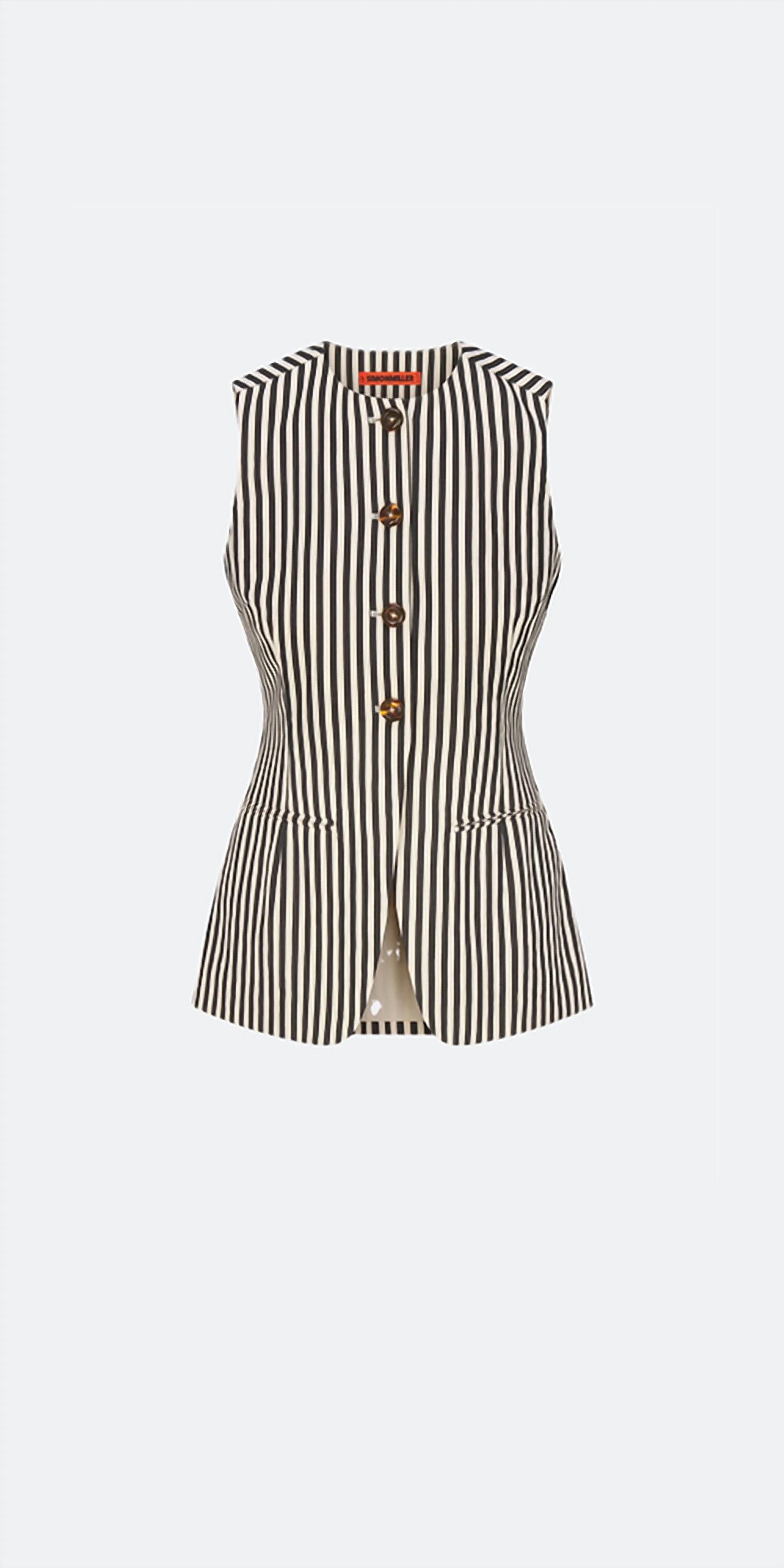 That extra layering piece you didn't know you needed! The Del Mar Linen Vest by SIMON MILLER is a chic addition to any wardrobe, perfect for summer soirées and holiday parties. This sleeveless vest features a refined black and macadamia micro stripe pattern, expertly crafted from 55% linen and 45% cotton with a 100% cotton lining. Its design includes a classic button closure, a curved hem, and practical front slip pockets. Model is 5'5" and wears a size 2, ensuring a true-to-size fit.