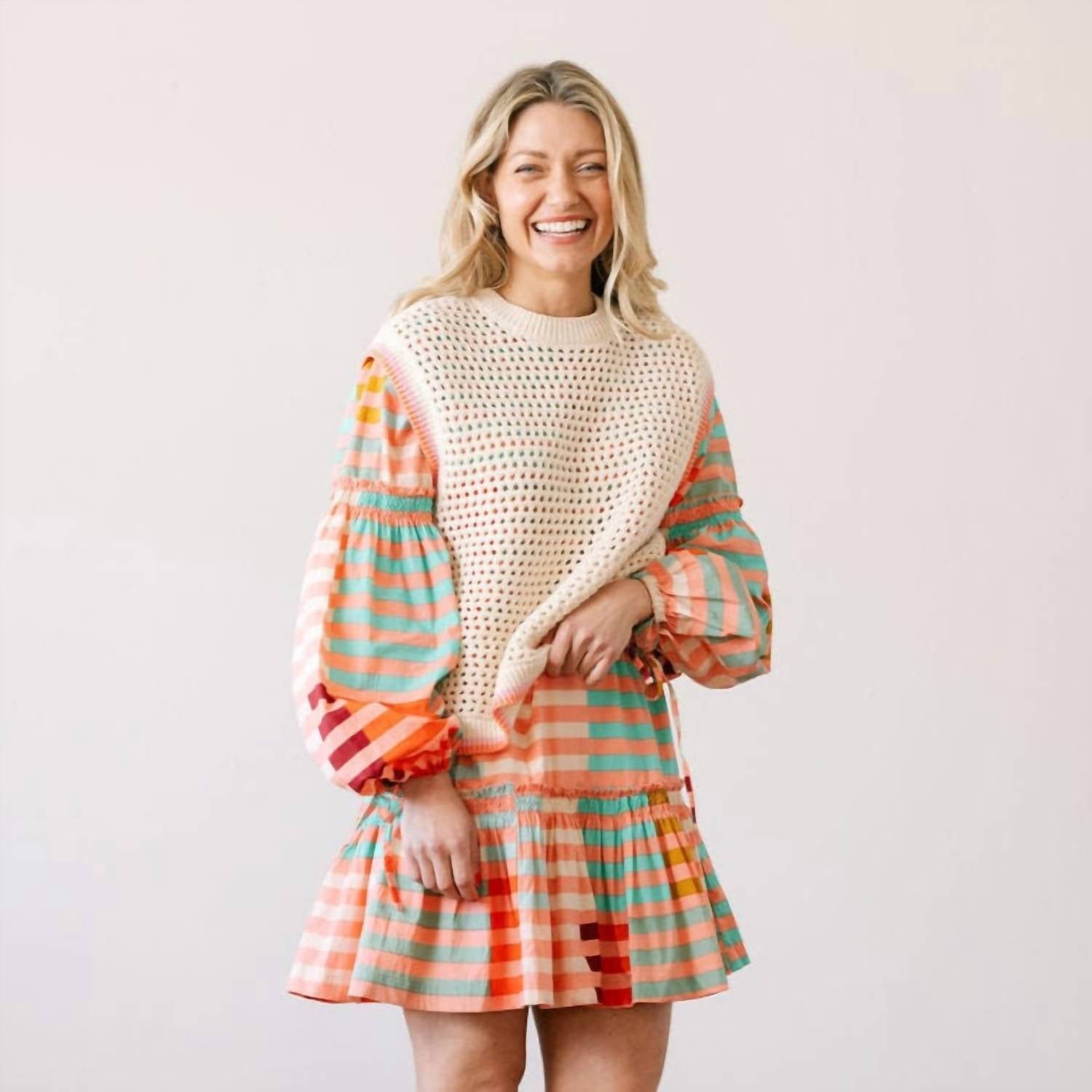 A vest so versatile you can mix and match it with almost any outfit and it will feel brand new every time. Elevate your wardrobe with the Kennedy Sweater Vest by Sunshine Tienda, presented in a captivating peach hue. This sleeveless vest boasts a textured open knit design with vibrant pink and orange trim, adding a joyful pop of color. Crafted from 100% Tanguis Cotton and made in Peru, it features a chic cropped length with a classic crewneck and pull-on closure. For best care, hand wash and lay flat to dry, perfect for maintaining this versatile piece.