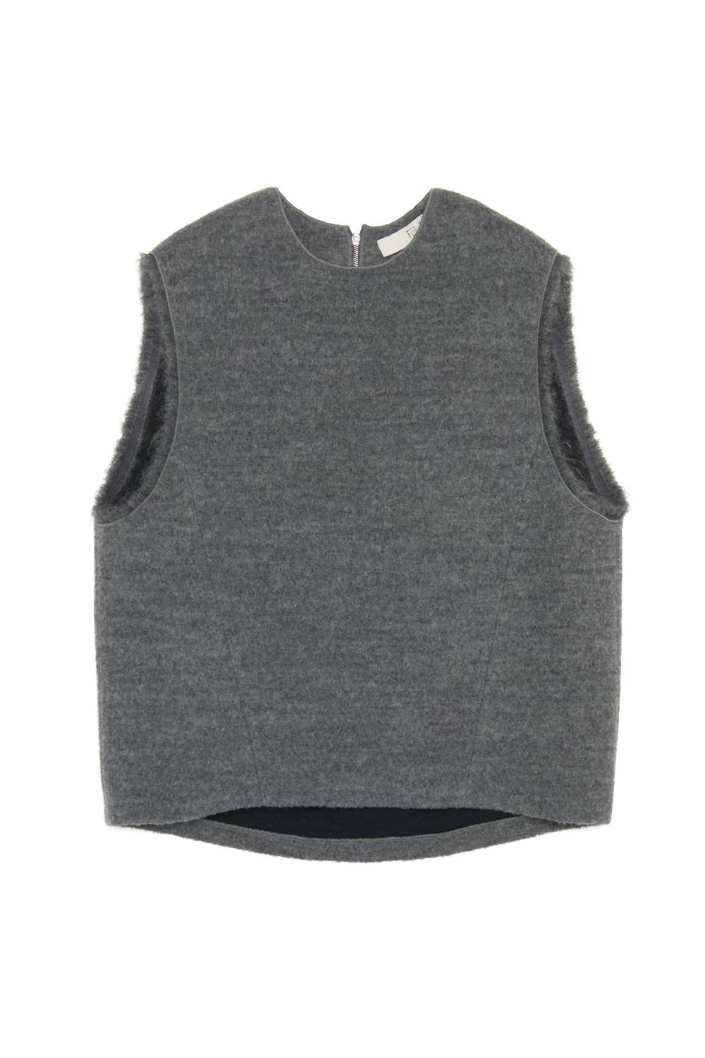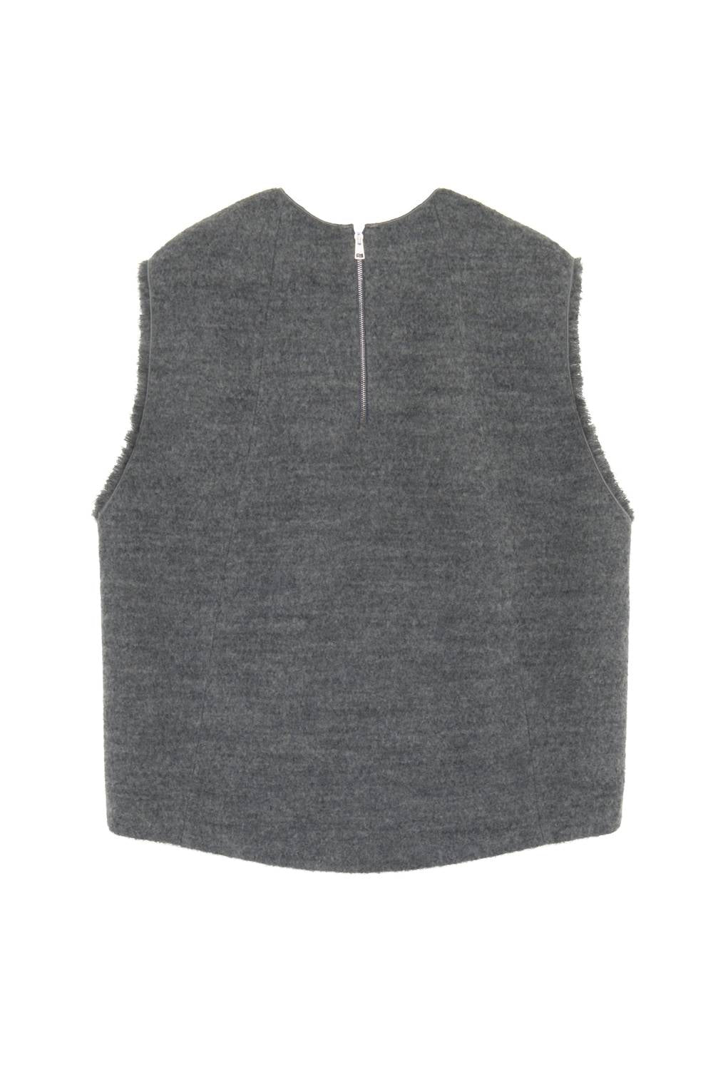 That extra layering piece you didn't know you needed! Presenting the Cardo Vest by Tela, a stylish sleeveless layer perfect for winter travel and streetwear trends. Crafted in Europe, this vest boasts a solid gray design with a crewneck and is made from a luxurious blend of 61% wool and 39% viscose. Its convenient zip closure adds practicality to its sleek silhouette. Note: Care instructions are not specified.