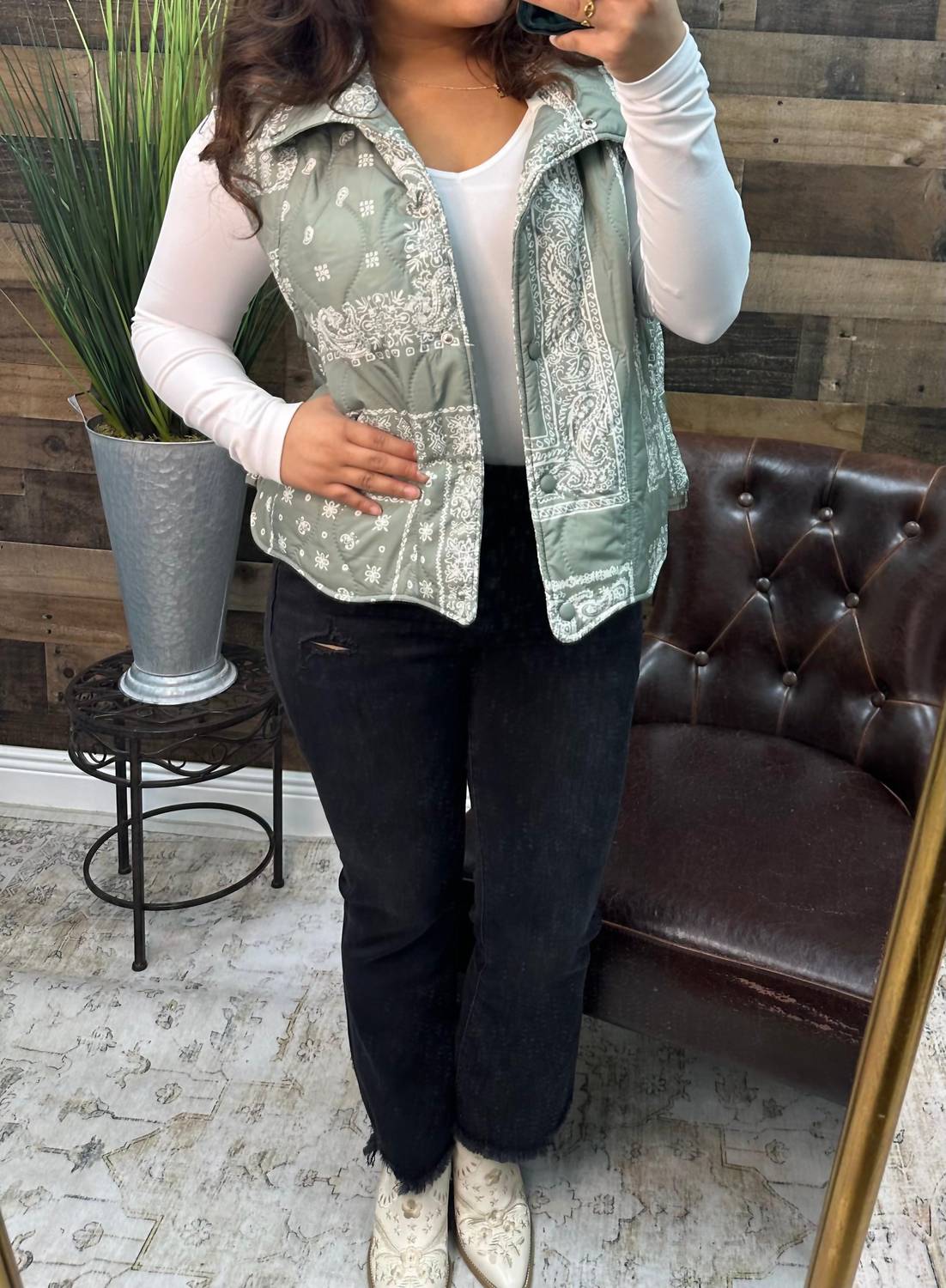 That extra layering piece you didn't know you needed! Introducing the Umgee Bandana Print Quilted Vest Top, perfect for vacation layering. This sleeveless vest in sage green boasts a comfortable cotton material and a cozy high stand-up collar. The snap button front adds convenience, while the playful scalloped edge provides a unique twist. Designed with a quilted pattern, it offers warmth ideal for the fall season.