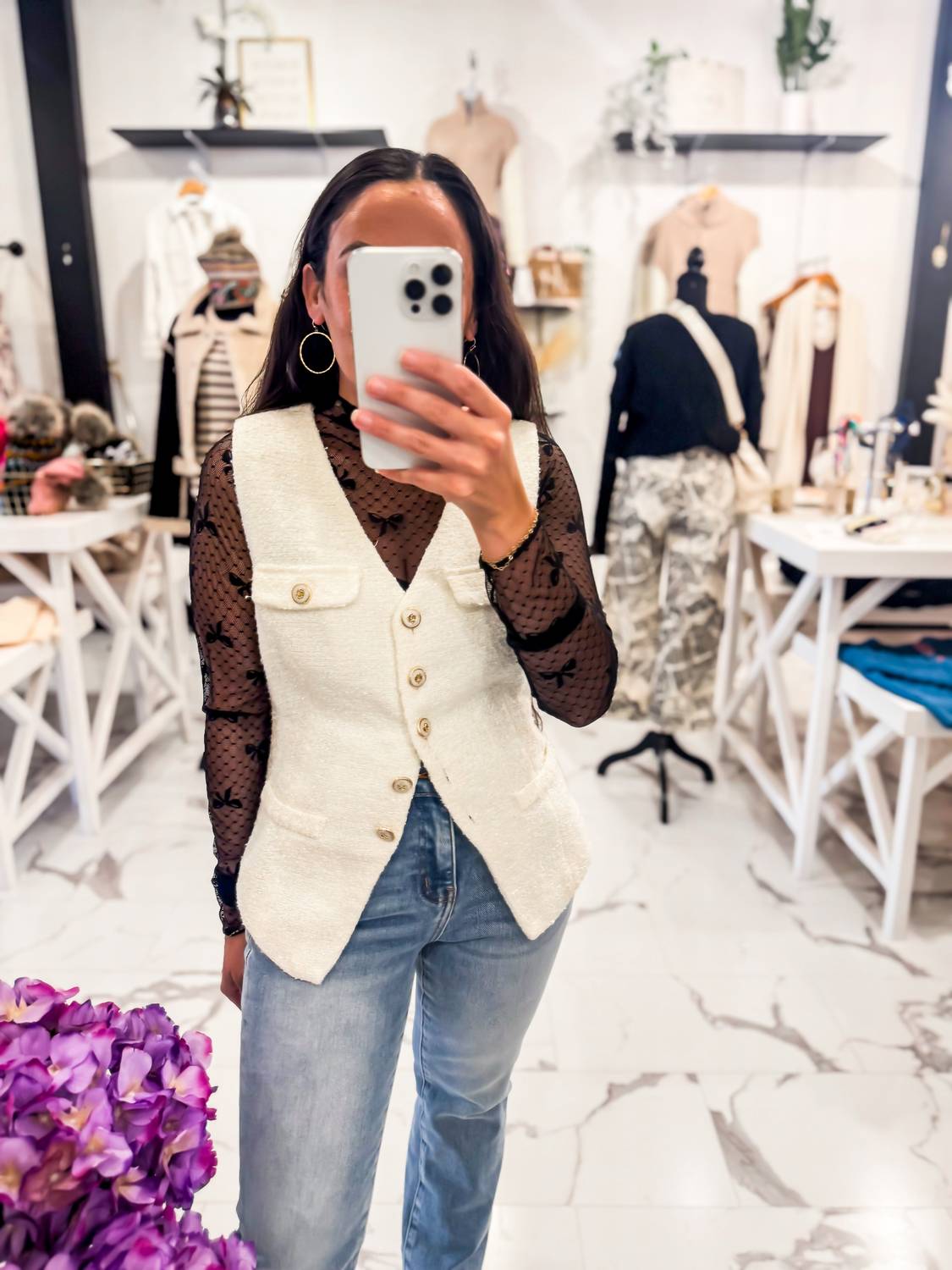 Throw this vest over an all black outfit for a perfectly polished look. The Women's The French 75 Tweed Vest by Zoe and Claire is an elegant addition to your wardrobe, boasting a sleeveless design and crafted from wool. This cream vest is made from textured tweed and features a flattering tailored silhouette with a deep V-neckline. The stylish gold-tone button closure and faux pockets enhance its sophisticated appeal, while its relaxed fit and pointed hem ensure comfort and style. Care for this garment by machine washing and laying flat to dry; model wears a size small at a height of 4'10", dress size 4, showcasing the vest's true-to-size fit.