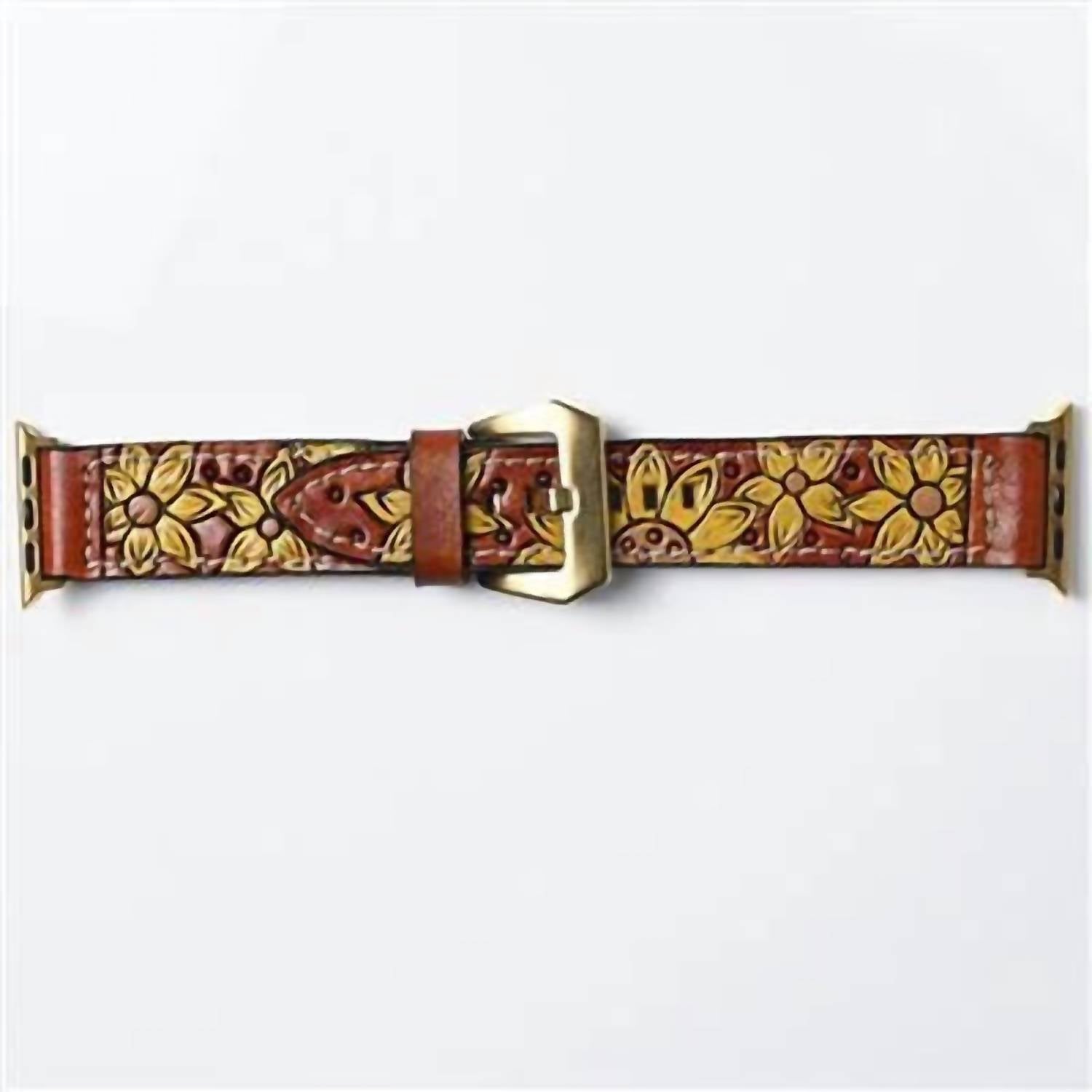 Discover the Women's Watch Strap from American Darling, a perfect blend of craftsmanship and elegance. Skillfully crafted with hand-tooled, carved, and painted vegetable-tanned American cowhide leather, this strap promises durability with its genuine full-grain leather that ages gracefully. Featuring high-grade stainless steel metal fittings, it provides both strength and style. Available in multiple sizes—41 for straps between 38mm to 41mm, and 45 for straps between 42mm to 45mm, this multi-colored watch strap is an excellent addition to any iWatch.