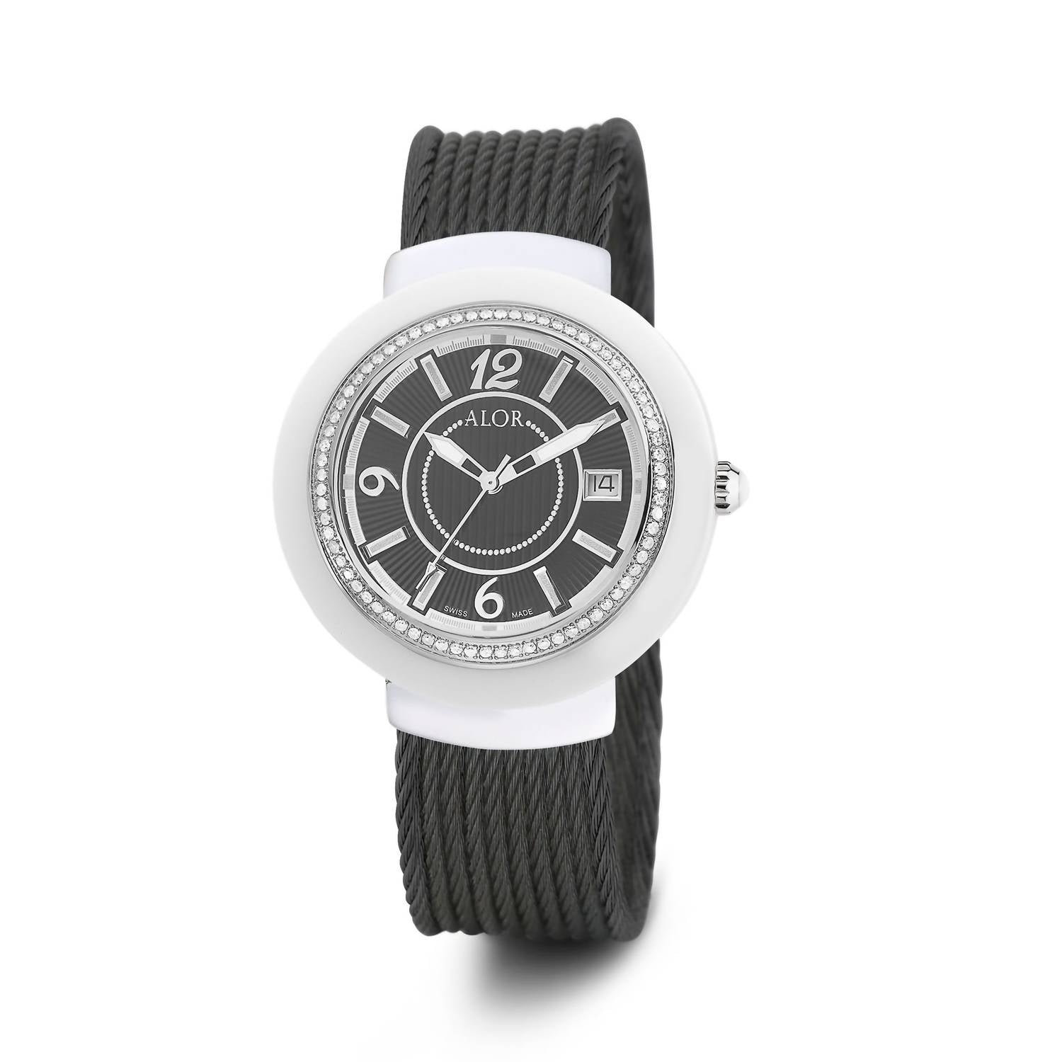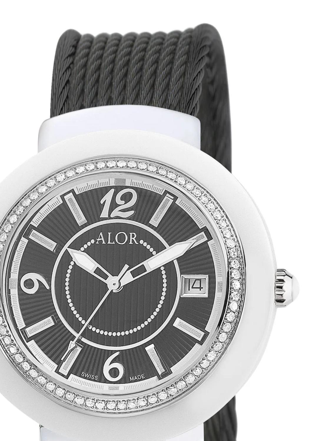 Discover the elegance of the ALOR 0.73 Cts Cable Diamond Watch, Swiss-made with superior craftsmanship. This exquisite timepiece showcases a 43mm black dial complemented by a ceramic and stainless steel bezel and adorned with silver Arabic markers. The double curved sapphire crystal and cabochon crown add refined details. Featuring 0.73 total carats of diamonds, it's not just a watch but a statement of luxury, with water resistance up to 3ATM. Imported design.