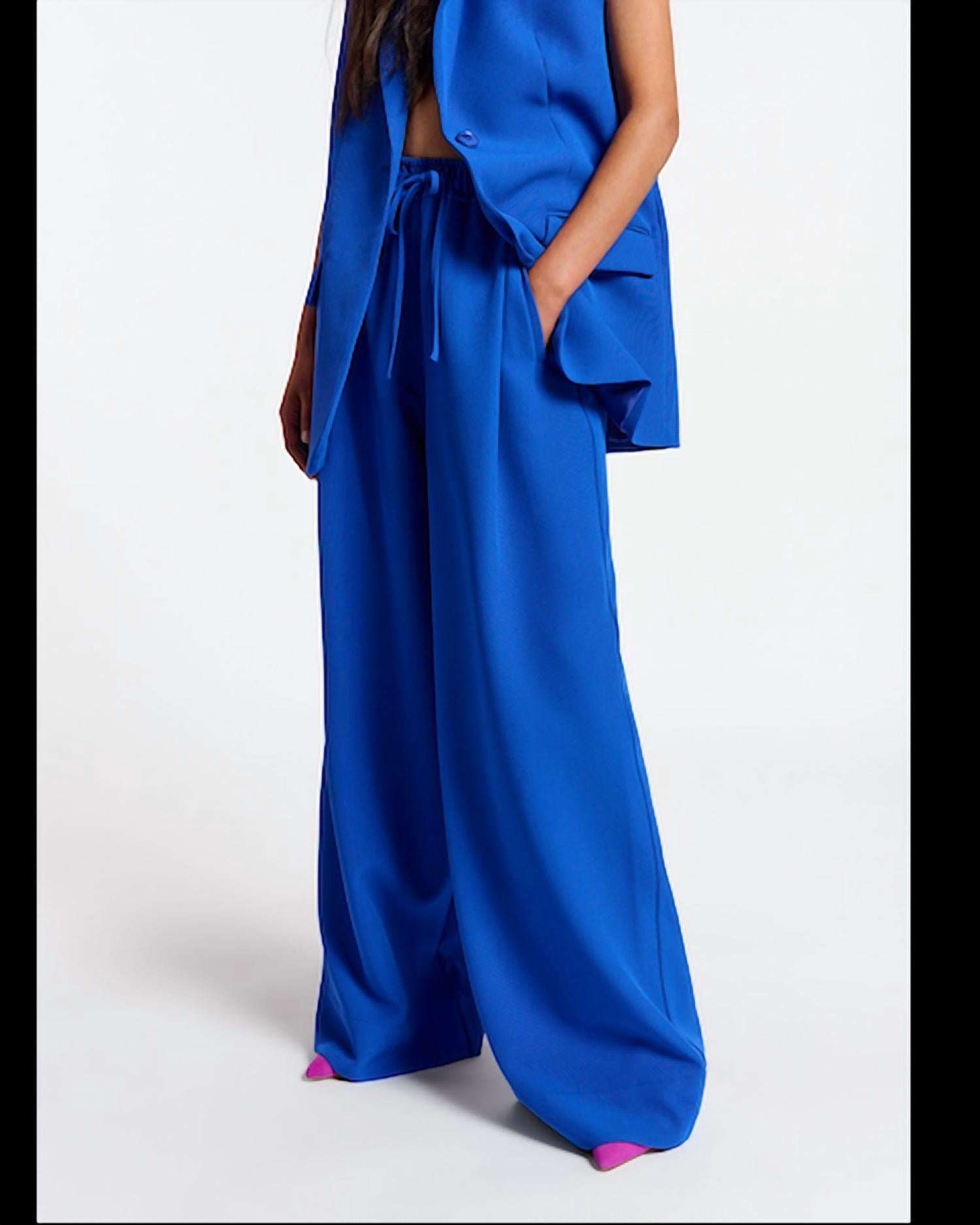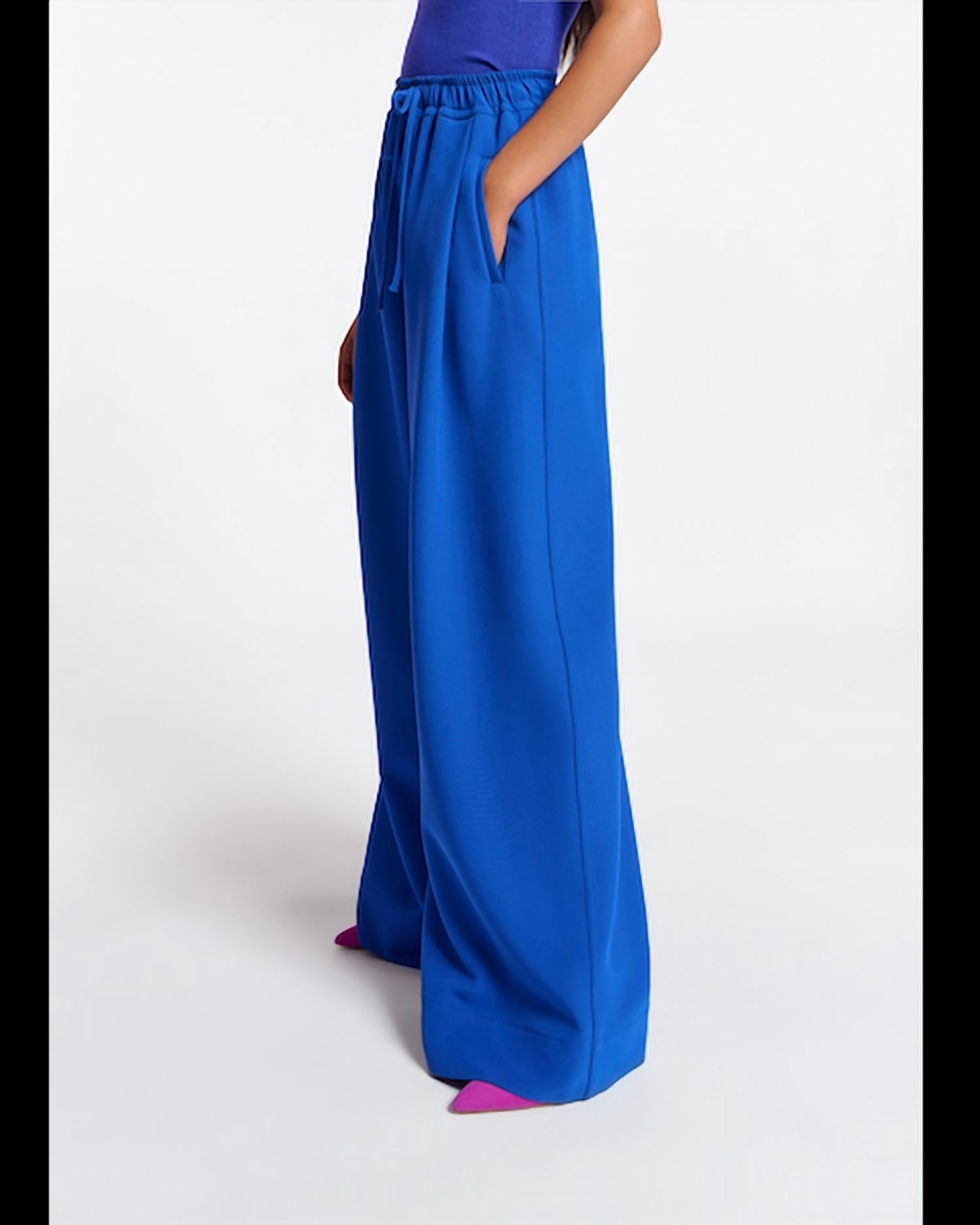 Meet the ESSENTIEL ANTWERP Dana High Waist Pants, a sophisticated addition to your wardrobe in a stunning blue shade. These high rise pants feature a wide leg design and an elasticated waistband with a tie closure for a relaxed fit that's perfect for a graceful silhouette. Made from recycled polyester, they boast a heavyweight, stretchy fabric that promises both comfort and style. Ideal for spring workwear occasions or engagements, these pants include convenient pockets to complete their practical appeal.