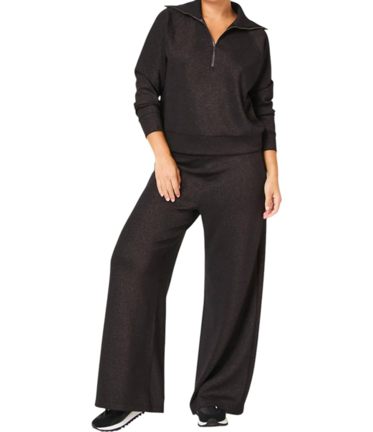 Wide leg style with a 20" approximate leg opening. Relaxed fit with contoured back for a flattering rear view. Mid-rise waist for a comfortable, flattering fit. Full-length design for versatile styling. Comfortable fabric ideal for all-day wear. 47% Polyester, 38% Modal, 11% Metallic, 4% Elastane.