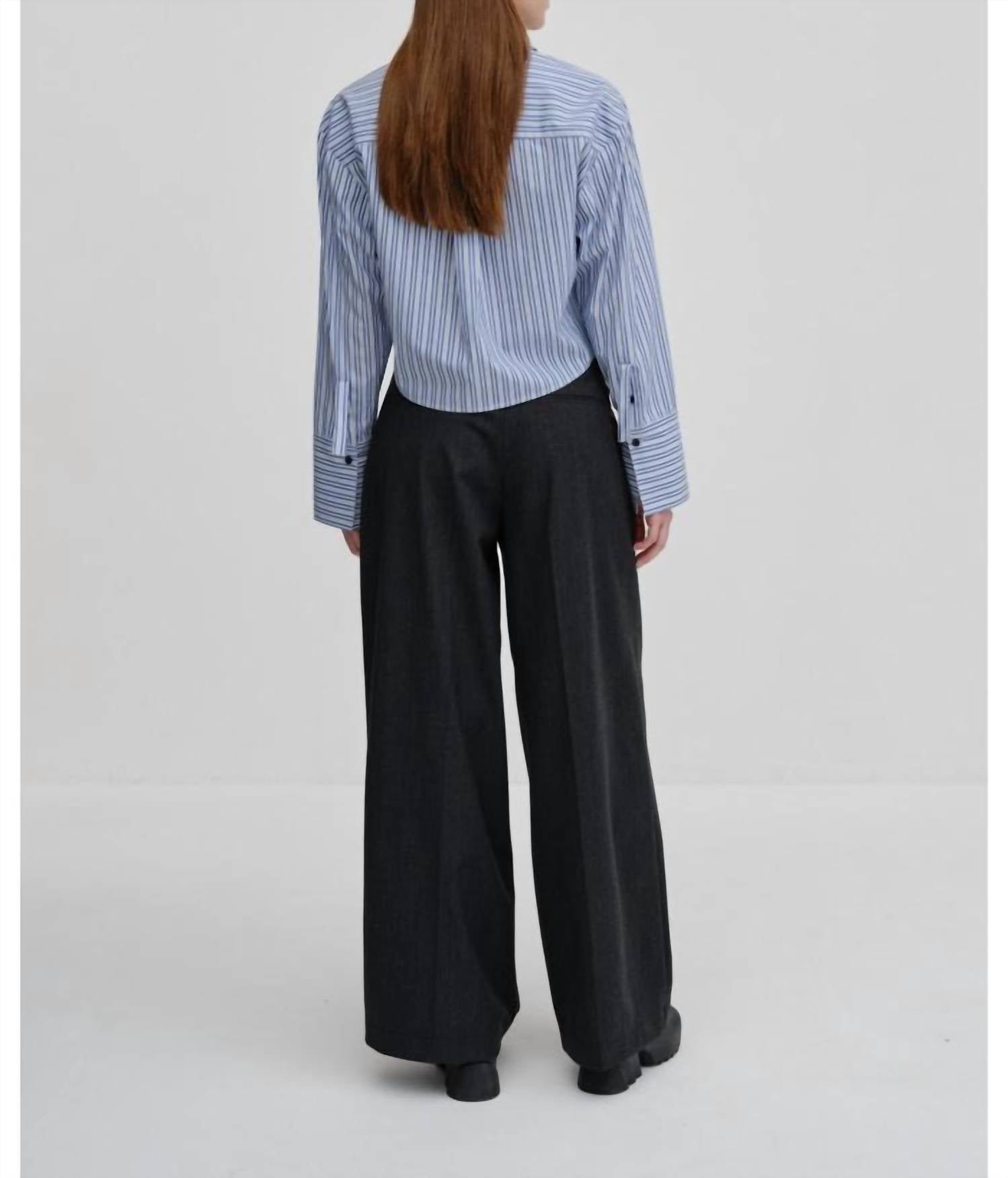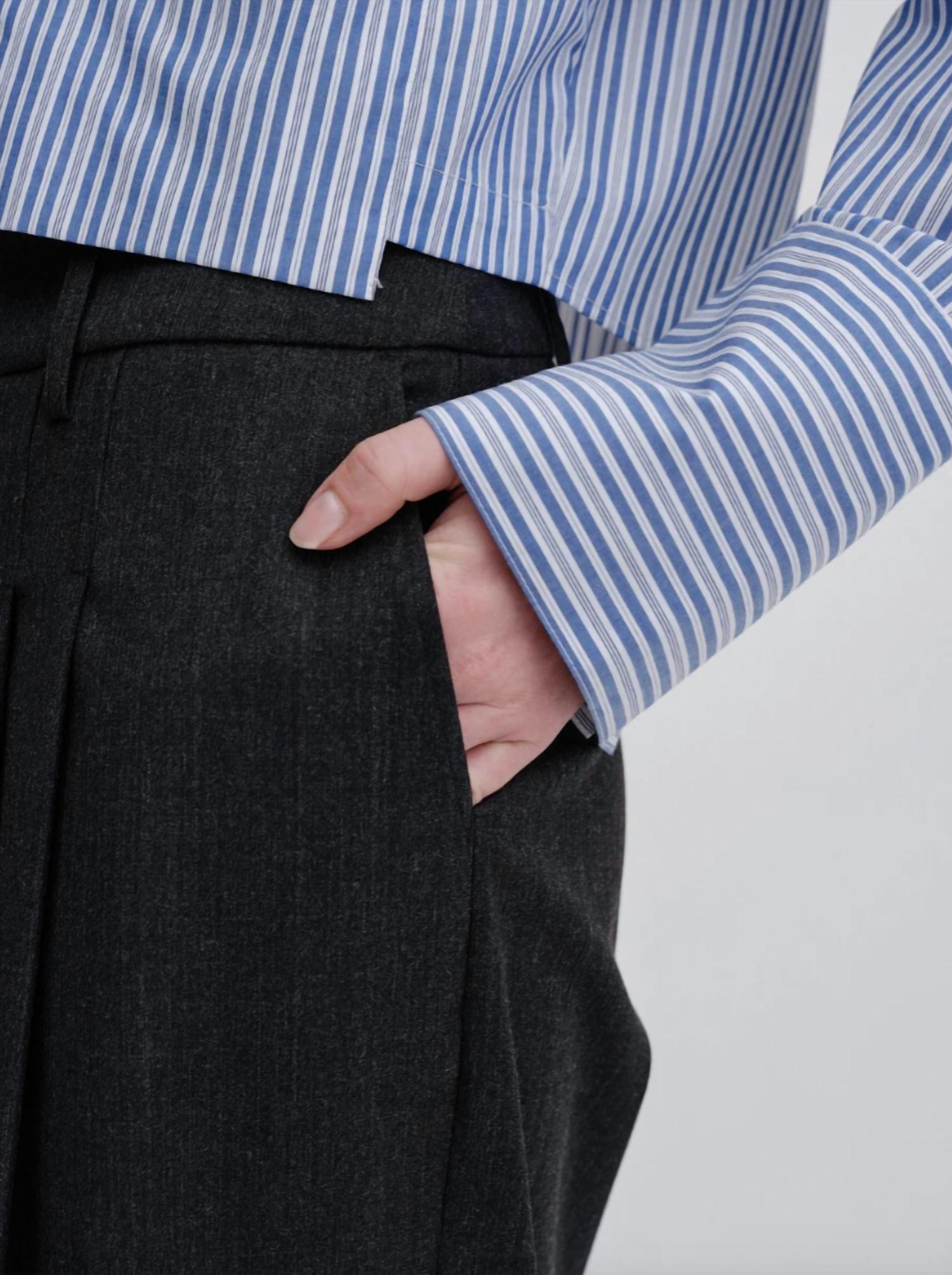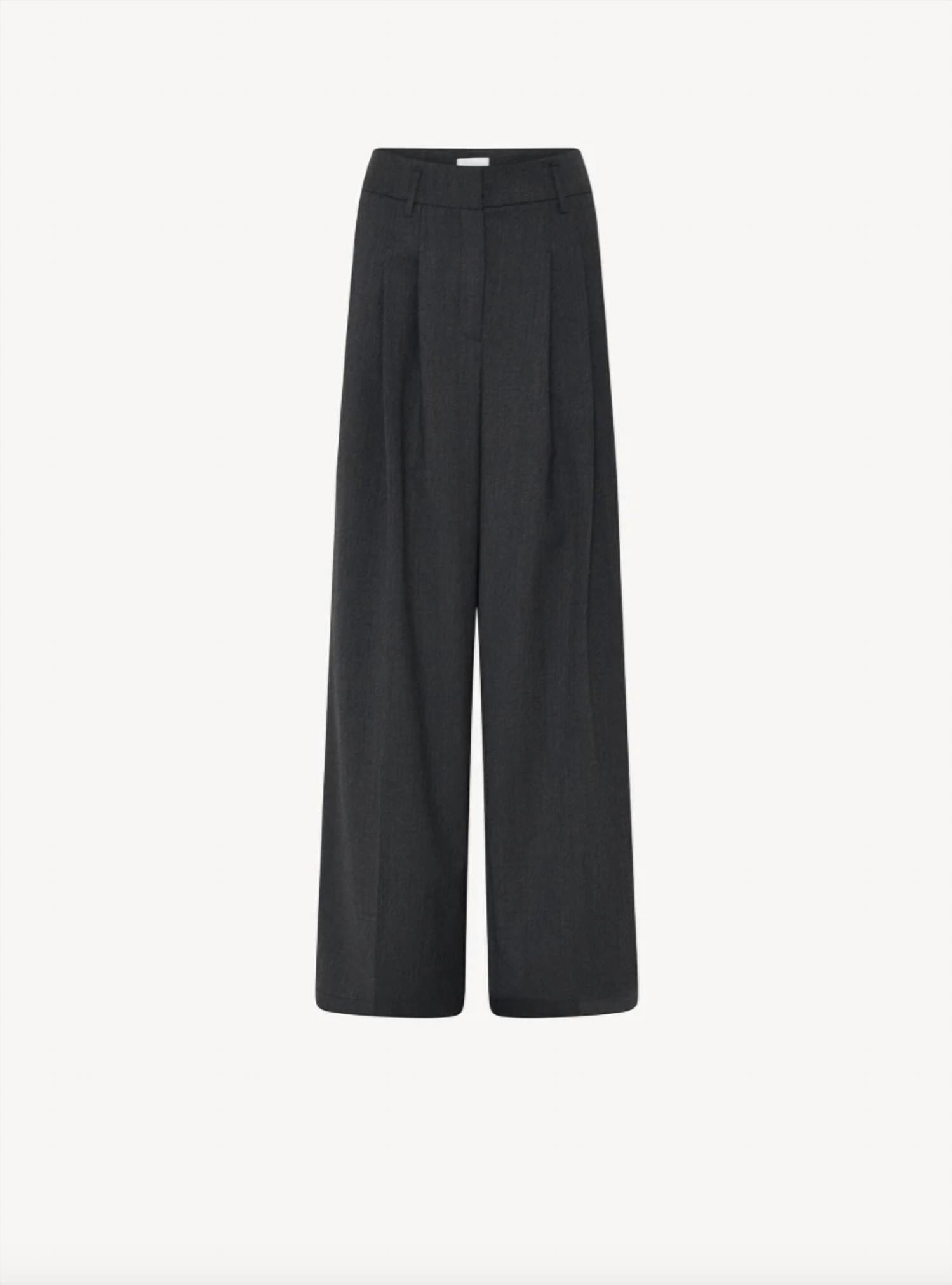 Casual suit pants with a relaxed fit, featuring a mid-rise waist and wide leg with press crease. They come with slanted pockets in front and paspel pockets at the back. * Casual suit pants * Relaxed fit * Mid-rise waist * Straight leg * Front and back pockets * Press folds at front & back * Dark grey 58% Polyester, 21% Virgin Wool, 18% Viscose, 3% Elastane Sizing: 32 = US 2 34 = US 4 36 = US 6 38 = US 8 40 = US 10