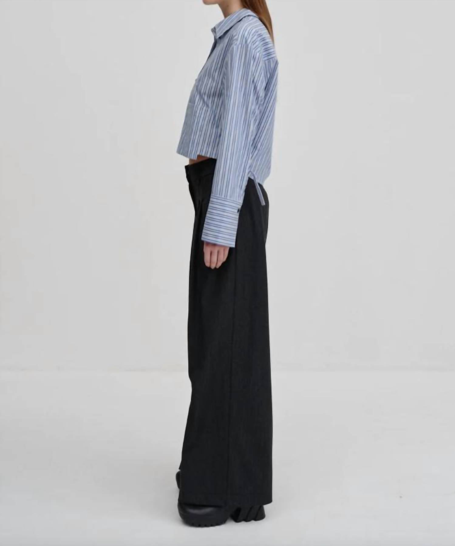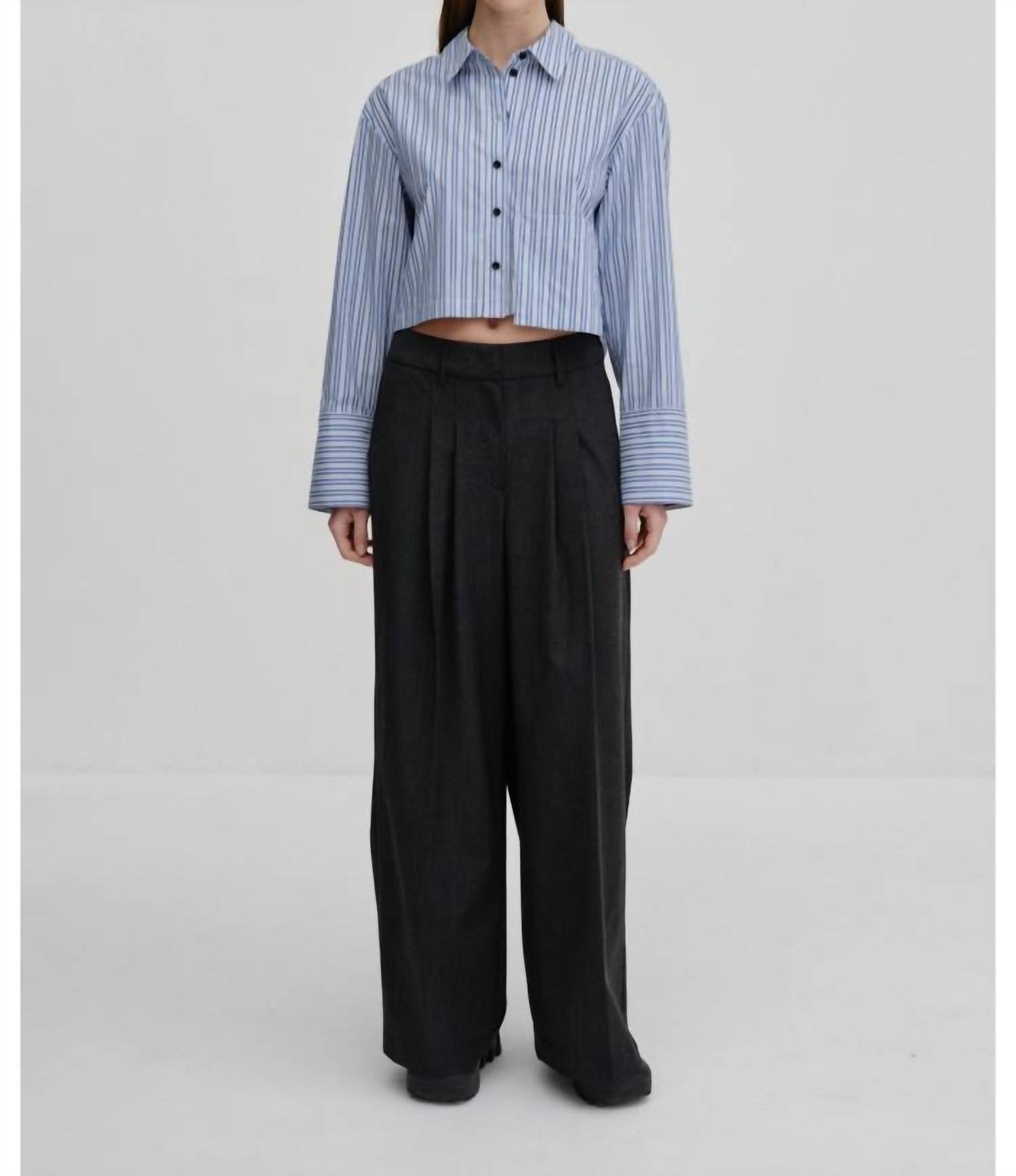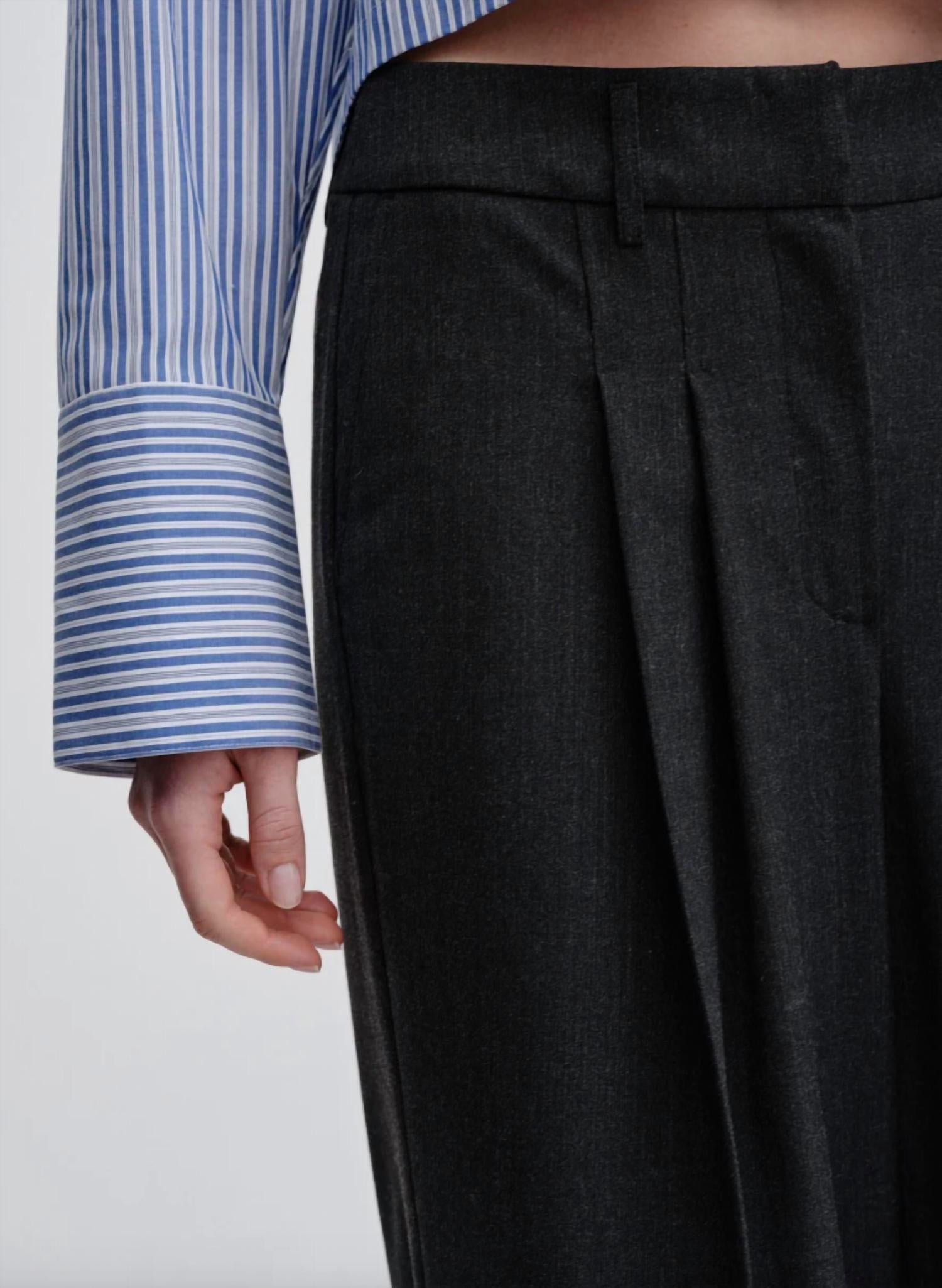 Casual suit pants with a relaxed fit, featuring a mid-rise waist and wide leg with press crease. They come with slanted pockets in front and paspel pockets at the back. * Casual suit pants * Relaxed fit * Mid-rise waist * Straight leg * Front and back pockets * Press folds at front & back * Dark grey 58% Polyester, 21% Virgin Wool, 18% Viscose, 3% Elastane Sizing: 32 = US 2 34 = US 4 36 = US 6 38 = US 8 40 = US 10