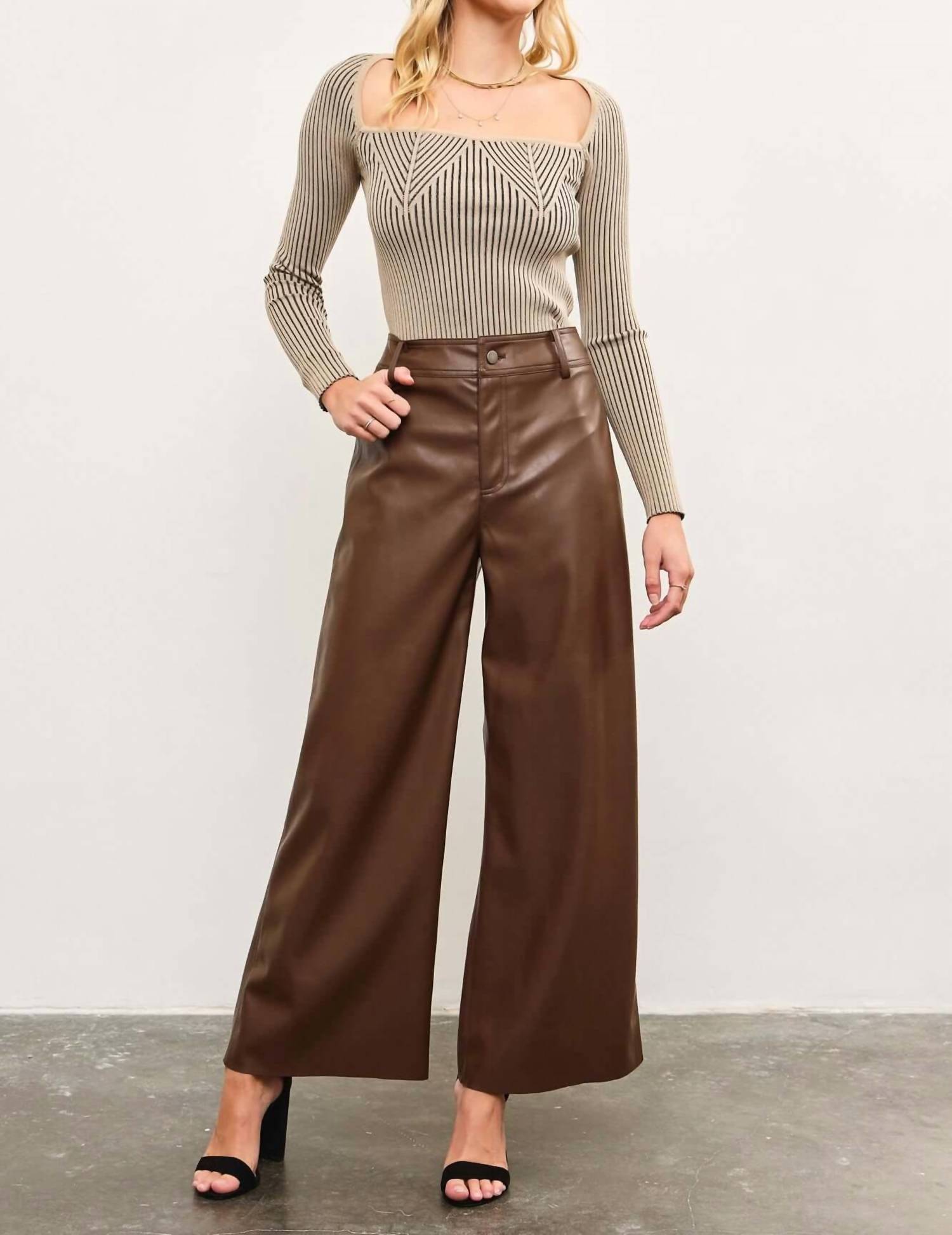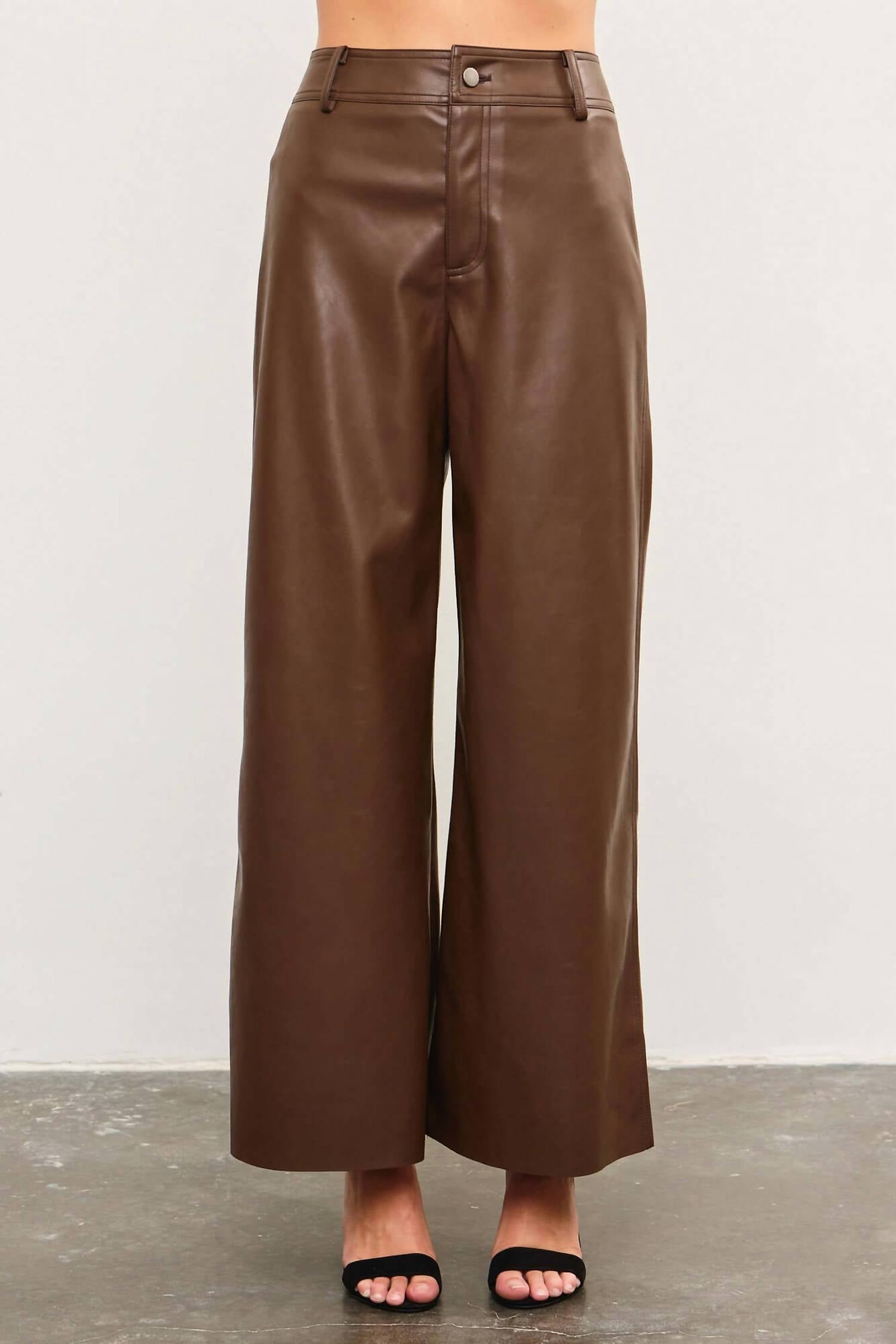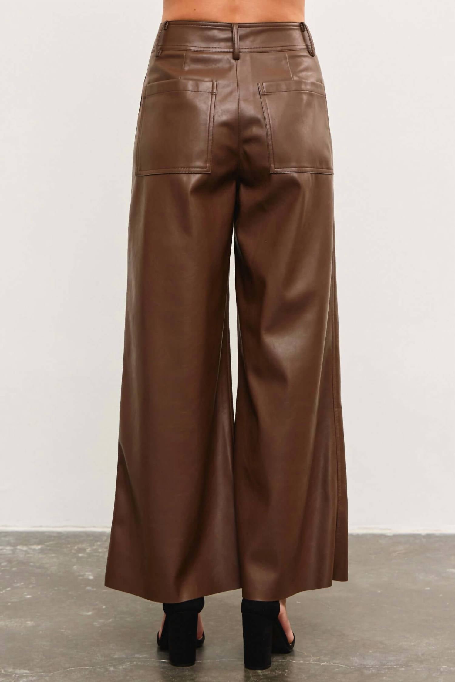These pants boast a wide-leg style and a relaxed fit, featuring both front and back pockets for practicality. Crafted from 55% PU and 45% polyester, these high-rise pants come with a convenient zip closure. True to size, their slightly cropped length ensures they pair perfectly with any footwear.