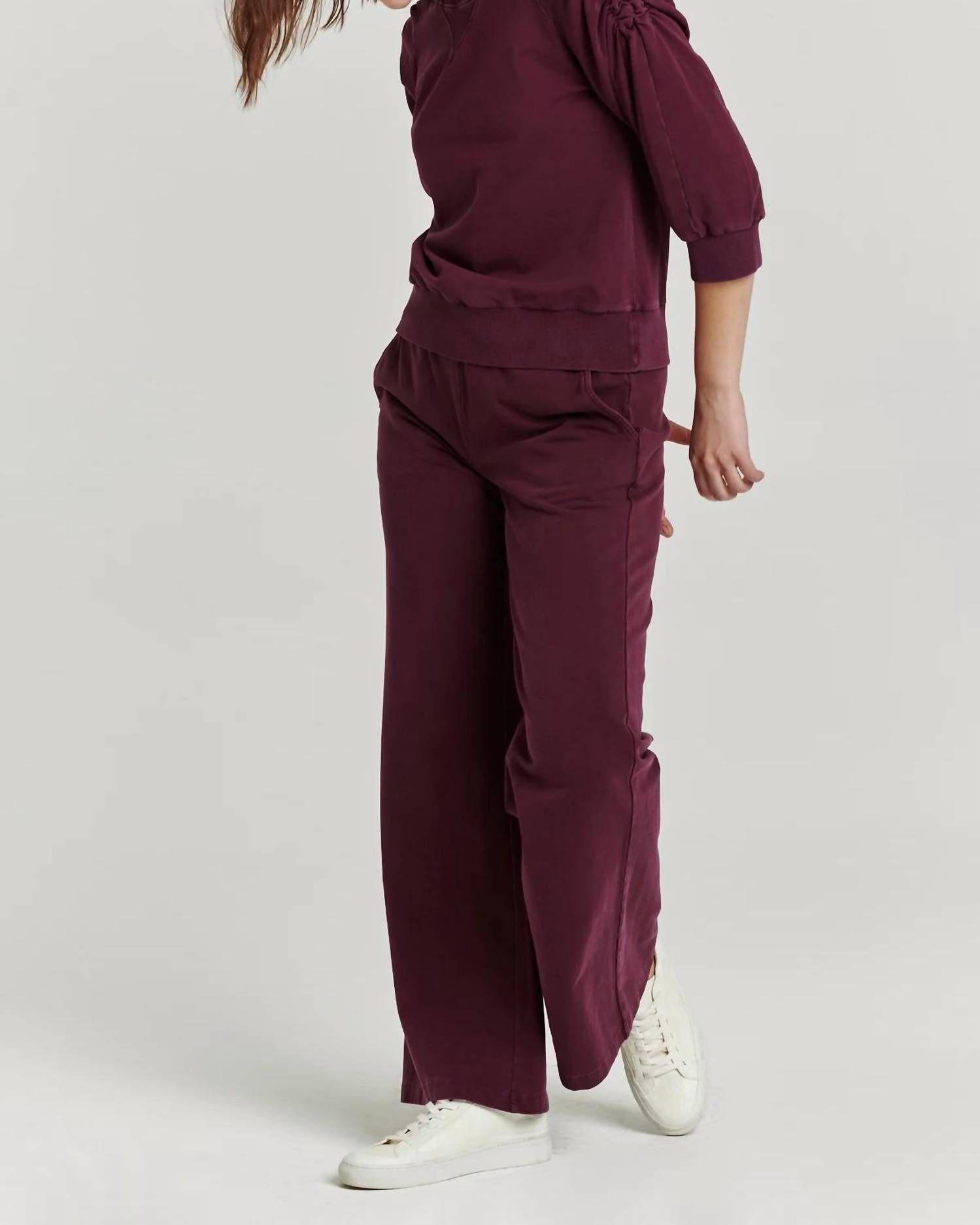 Experience ultimate comfort with the Quincy Wide Leg Terry Pant by Another Love, designed in a sophisticated prune color. Featuring a relaxed fit and a high-rise, pull-on style, these pants offer both style and ease with their slant pockets and drawcord elastic waist. Made from a soft cotton blend of 95% cotton and 5% spandex, they boast an 11.5" front rise, 23" leg opening, and a 31" inseam in size small. Care for these solid wide-leg pants is simple: machine wash cold and tumble dry low.
