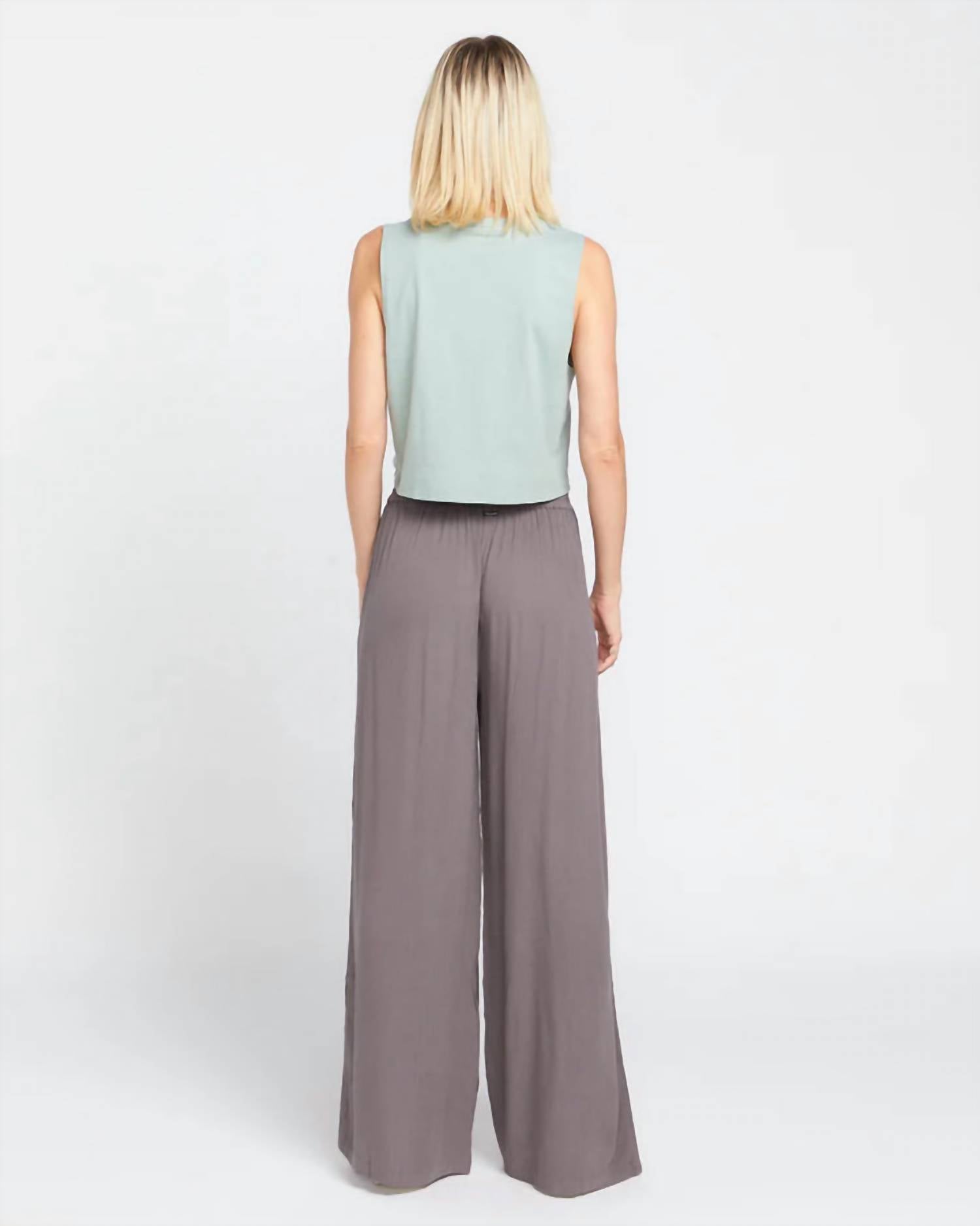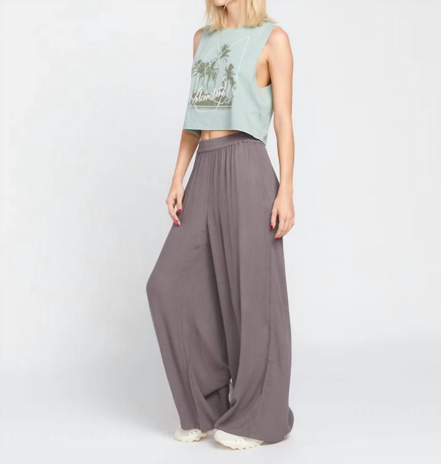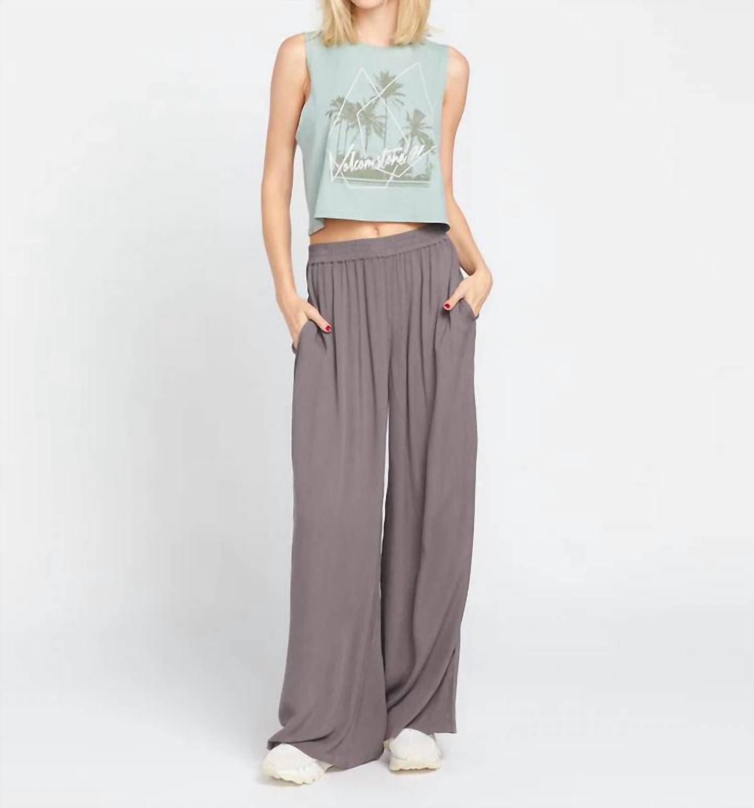 Embrace coastal vibes with the Stoneshine Junki Pants by VOLCOM, designed for a relaxed and stylish beach day. These wide-leg pants, showcased in dark grey, feature a high-rise elasticized waistband for easy pull-on wear, and are crafted from 100% viscose crinkle gauze for a silky smooth feel. With practical slash pockets and mini side slits at the outseams, these beach pants offer a boho chic look, perfect for pairing with a tank and sandals. Care is simple with hand wash and lay flat to dry instructions, and they boast a 29.5" inseam for an elongated silhouette.