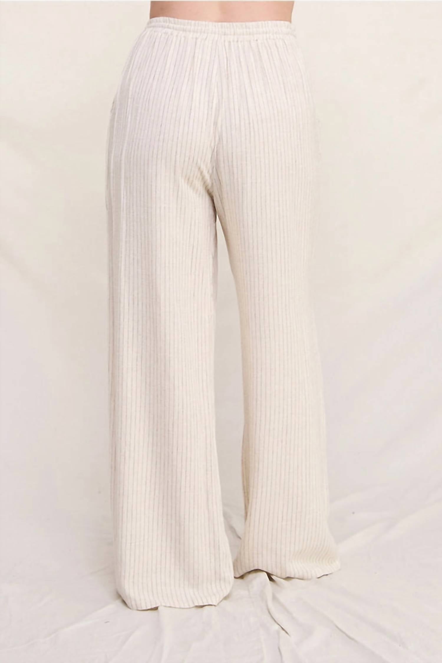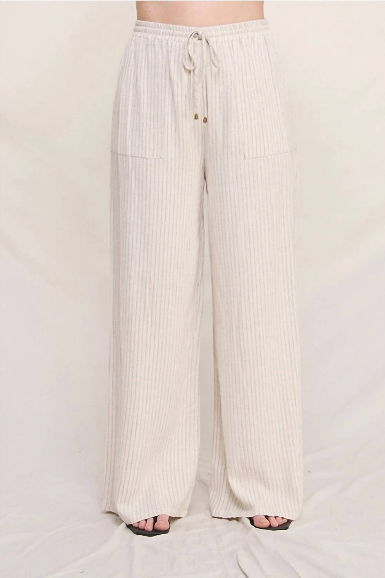 Introducing the Striped Linen Smock Waist Pants Plus by ALLIE ROSE, tailored for curvy figures in a chic Natural stripe pattern. These wide-leg pants feature a relaxed fit with a high-rise smocked waistband for adaptable comfort, complemented by practical pockets. Made from breezy linen, they offer a pull-on closure ideal for warm spring days and versatile enough for both casual and holiday party settings. Please note that specific care instructions are not available.