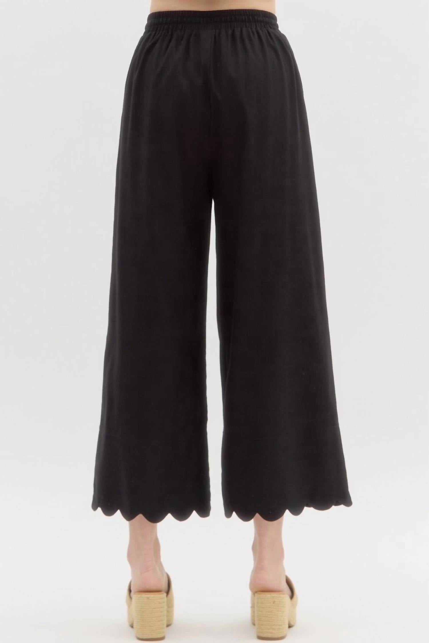 Introducing the Scallop Hem Wide Leg Pant by Entro, perfect for a relaxed yet stylish look. These mid-rise, ankle-length pants feature a high-waist design with a scallop hem and a drawstring adjustable elasticated waistband for ultimate comfort. Crafted from a lightweight linen blend (40% Linen, 40% Viscose, 10% Cotton, 10% Polyester), they are woven and lined, making them non-sheer. Complete with pockets, these pants are a must-have for summer holiday parties, and the model is 5'10" wearing size small.