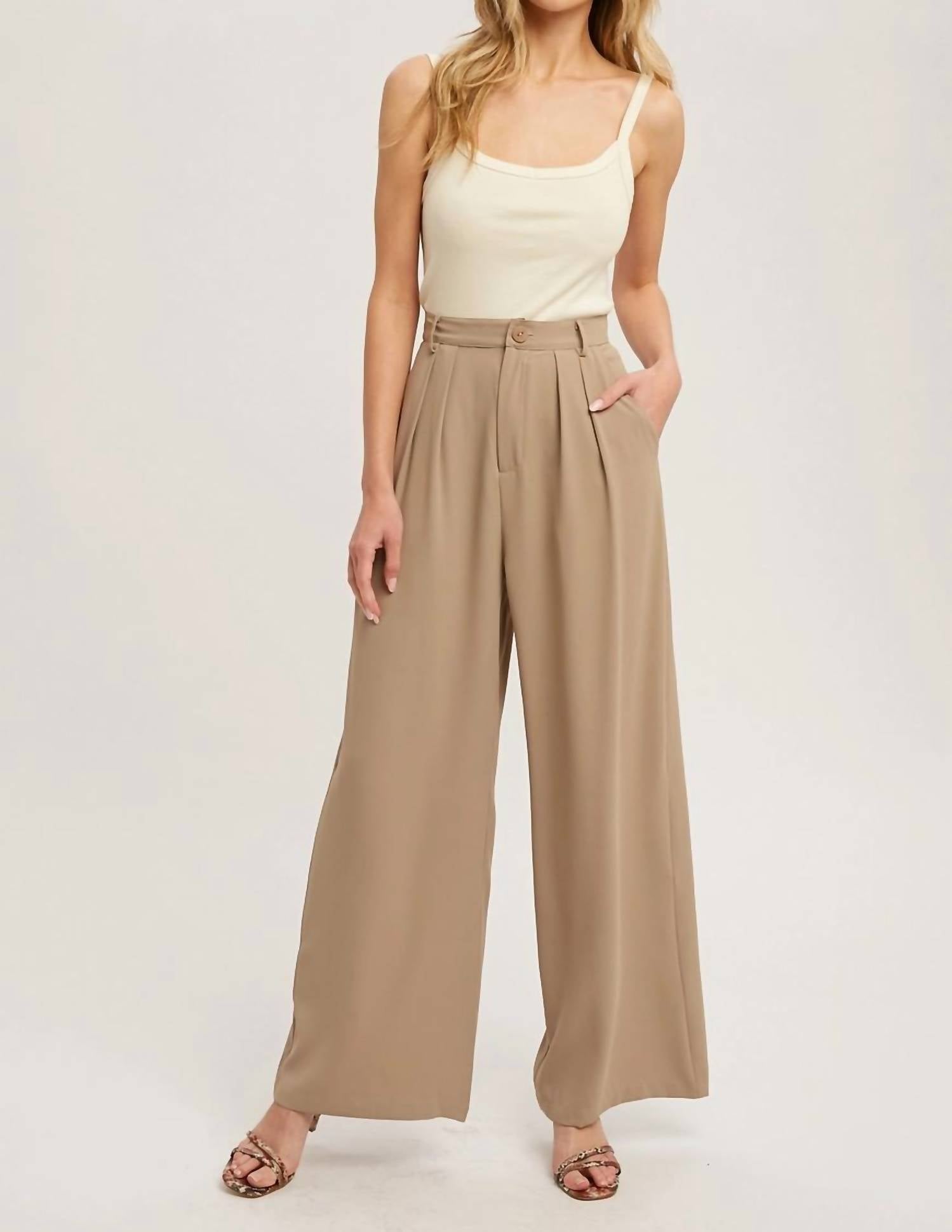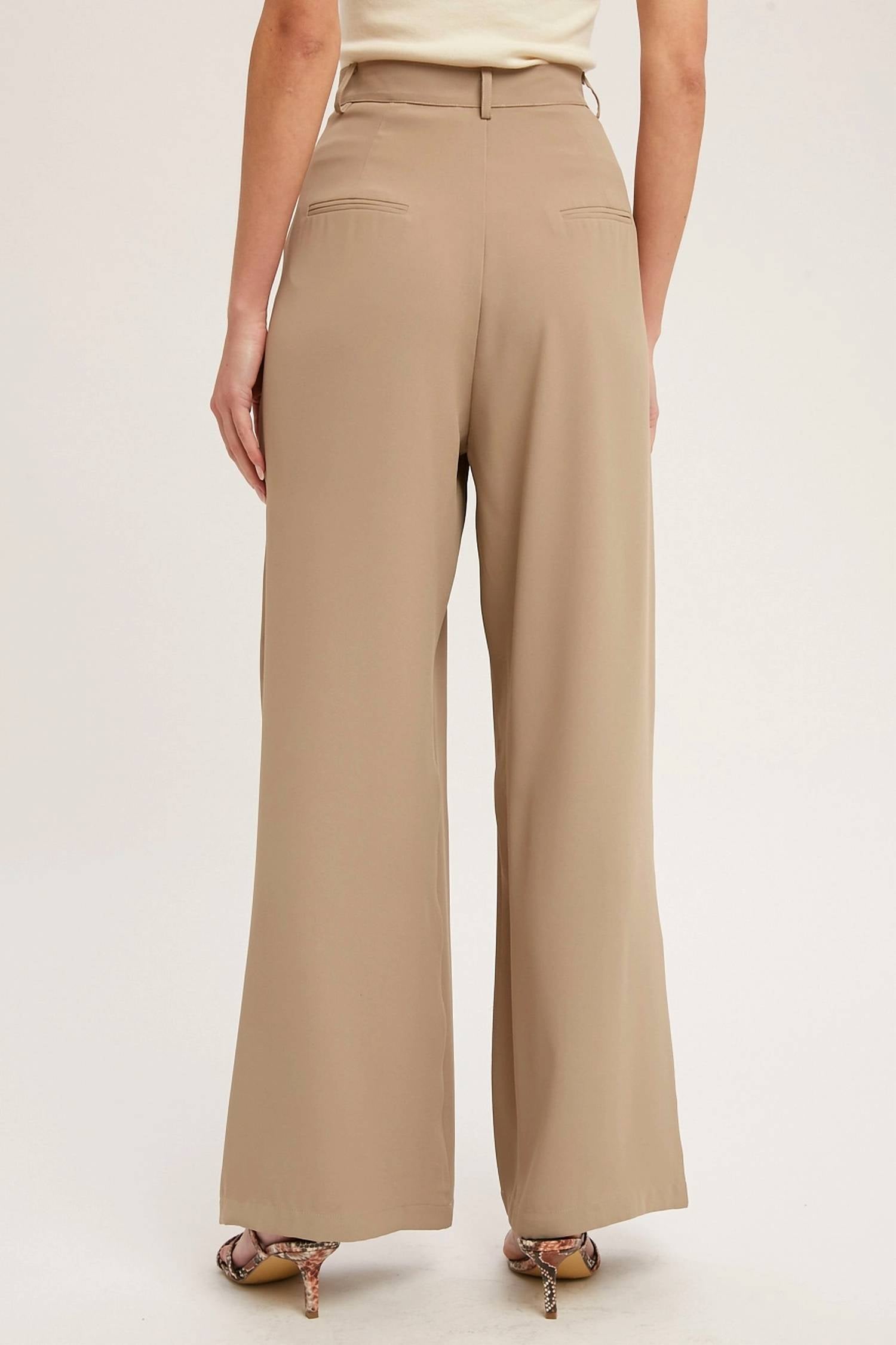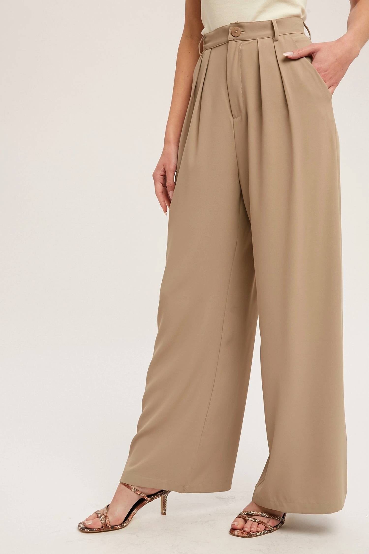 Woven pants features a slim fitting in the waist with a relaxed fit in the leg, side slant pockets, faux back pocket, zip fly with button closure, pleated details at waistline, relaxed silhouette. Cool, comfy and versatile!
