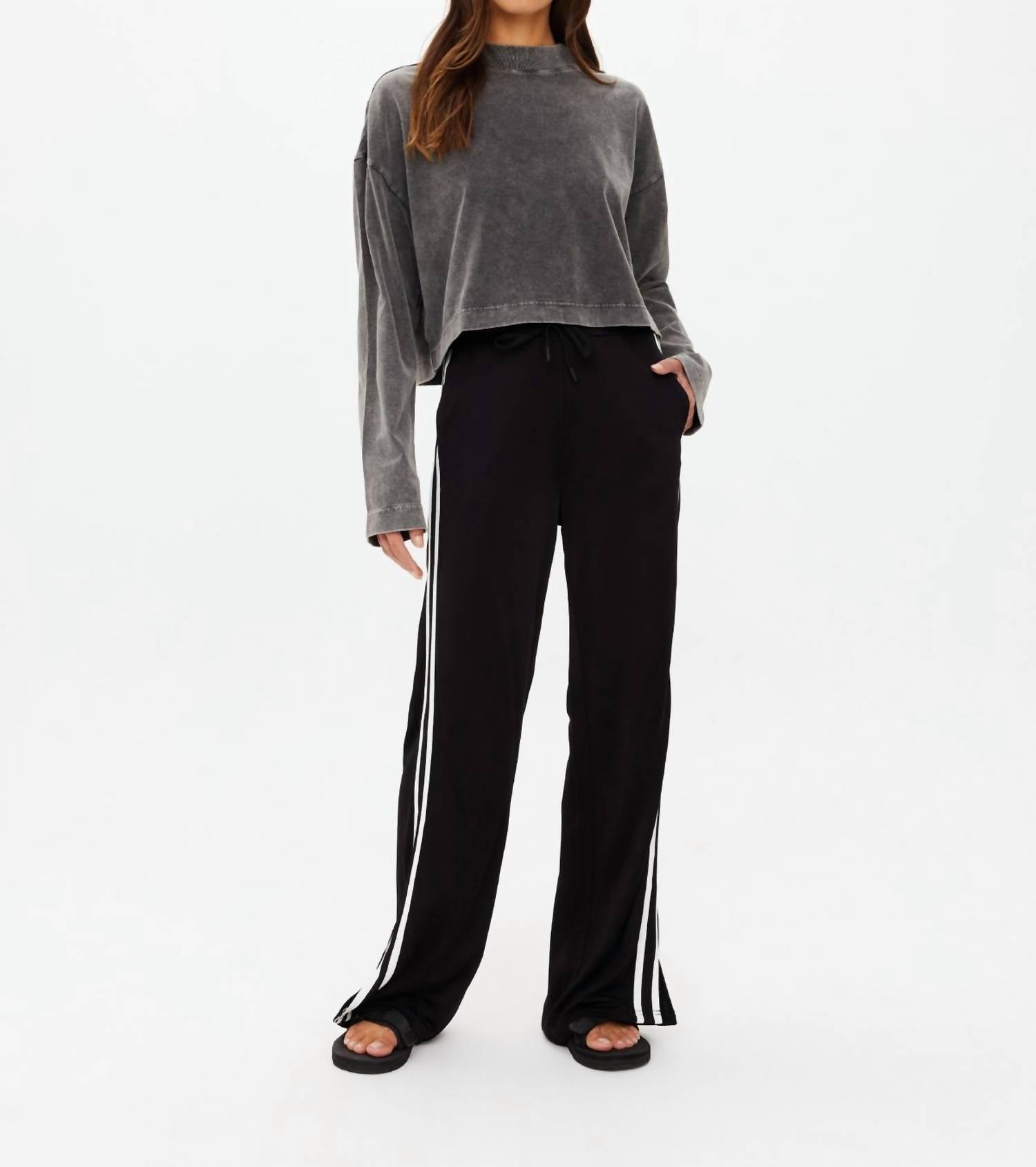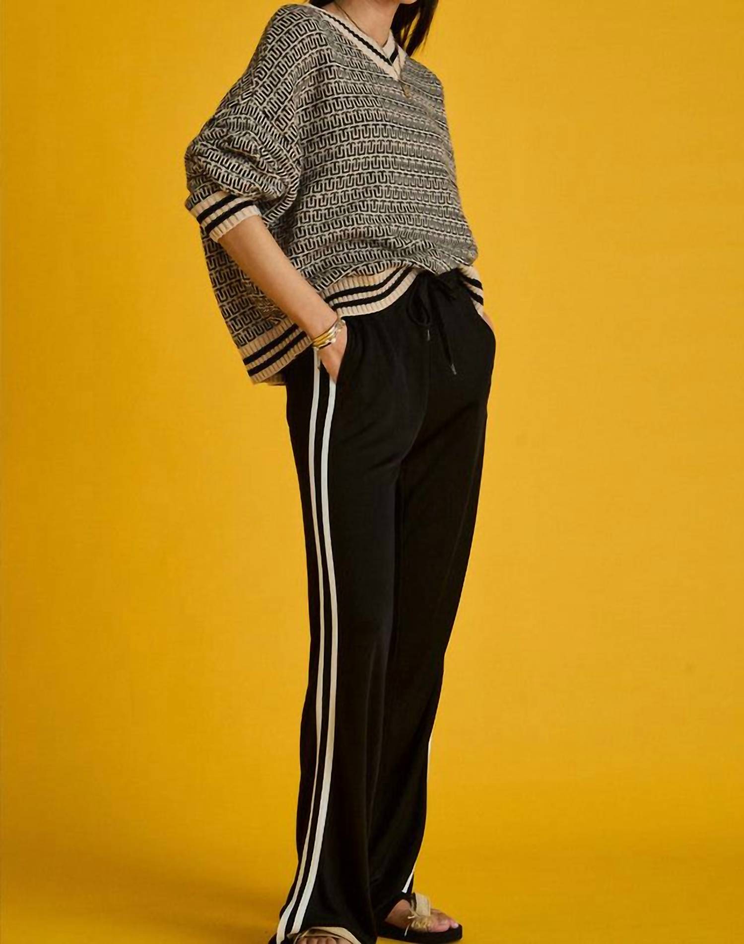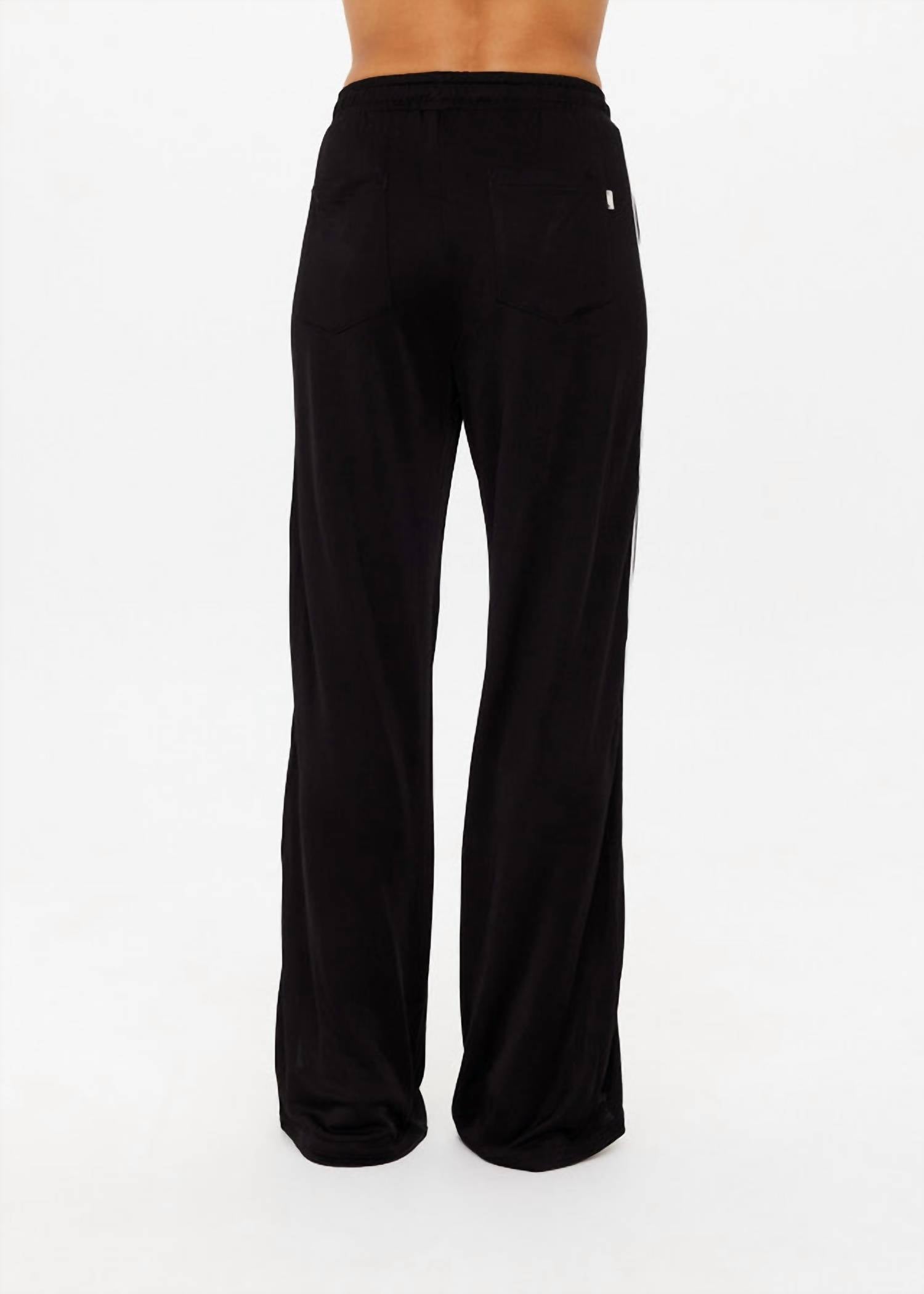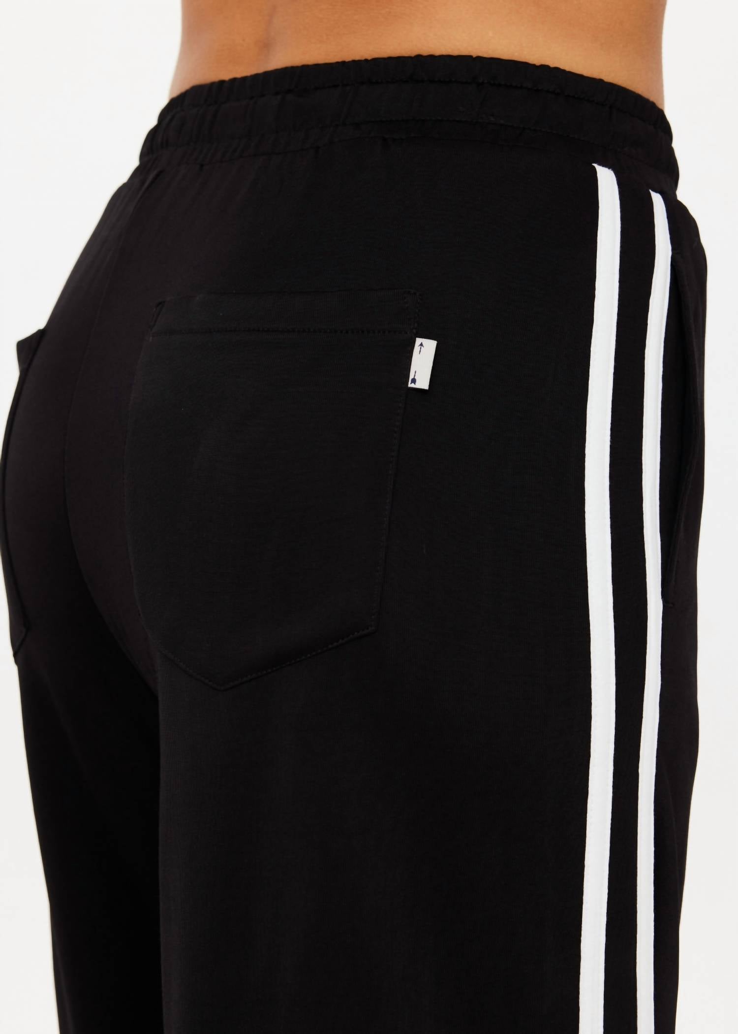 Introducing the Roma Pants by THE UPSIDE, a perfect blend of style and comfort for your wardrobe. These high-rise, wide-leg pants feature an elasticated waist for a relaxed fit and are crafted from a luxurious viscose blend with chic cream stripe details along the sides. With practical front and back pockets and a convenient pull-on closure, these pants are designed for versatility from vacation relaxation to everyday athleisure looks. Care instructions include a cold machine wash with similar colors, turning inside out, and line drying in the shade, with no need for ironing or dry cleaning. 45% Rayon 41% Viscose 14% Nylon.