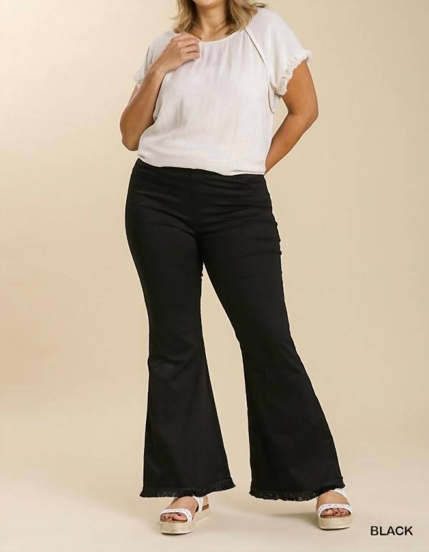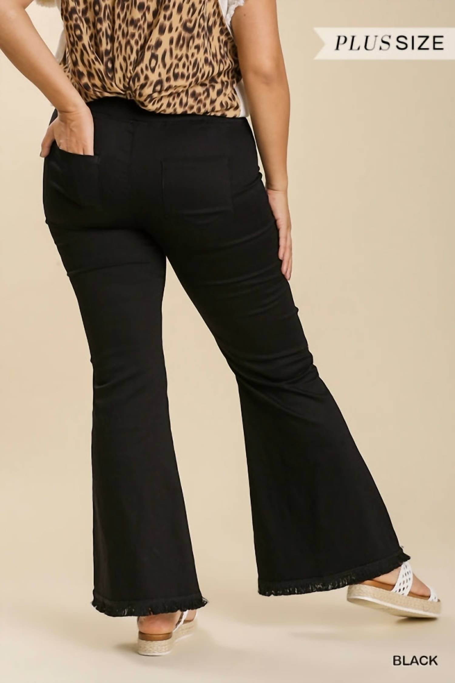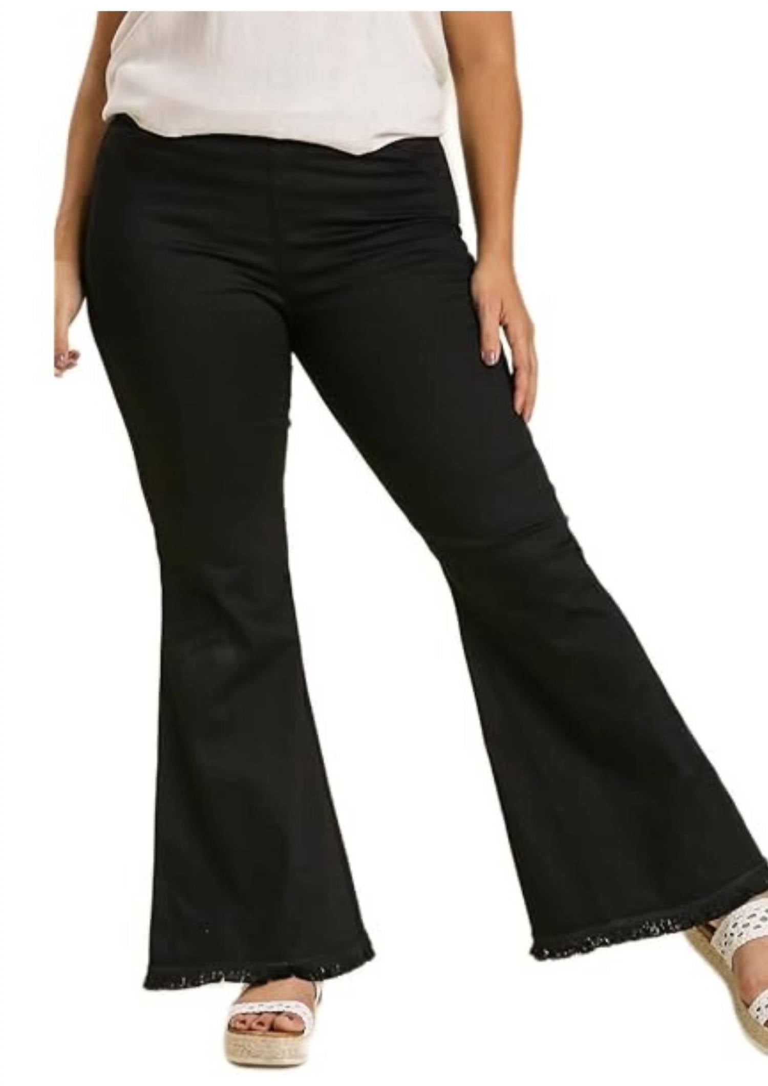 Step into comfort with the Stretch Wide Flare Leg Pants by Umgee, a stylish addition to any wardrobe. Featuring a high rise, relaxed fit with a solid pattern, these pants are crafted from a cotton blend of 97% cotton and 3% spandex. Designed with a convenient pull-on closure and frayed hem, they include functional pockets for everyday utility. Just machine wash and tumble dry for easy care – ideal for the minimalist woman who enjoys a touch of flair in black.