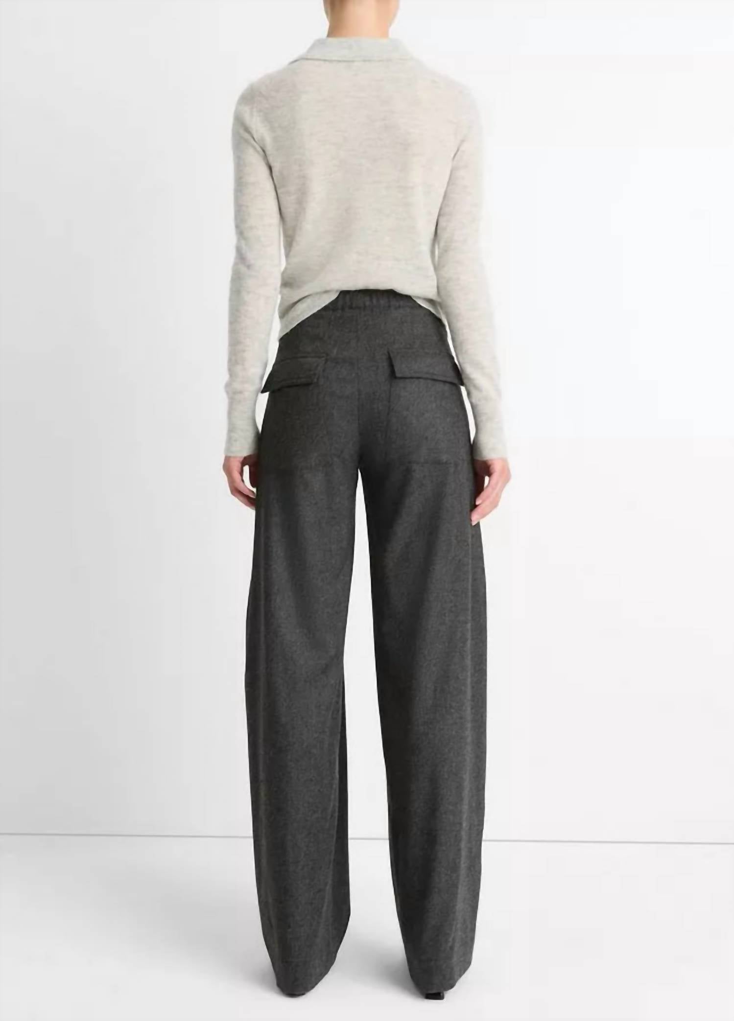 Introducing the Mid Rise Brushed Herringbone Flannel Pant by Vince, a blend of comfort and sophistication for evening events. These wide-leg pants feature a relaxed fit and an elasticized mid-rise waist, ensuring you look polished while feeling at ease. Crafted from a luxurious Italian wool-blend flannel, this piece is composed of 41% virgin wool, 29% viscose, 29% polyester, and 1% elastane for exceptional softness. Closure includes a zip fly and hook-and-bar; care instructions recommend hand washing.