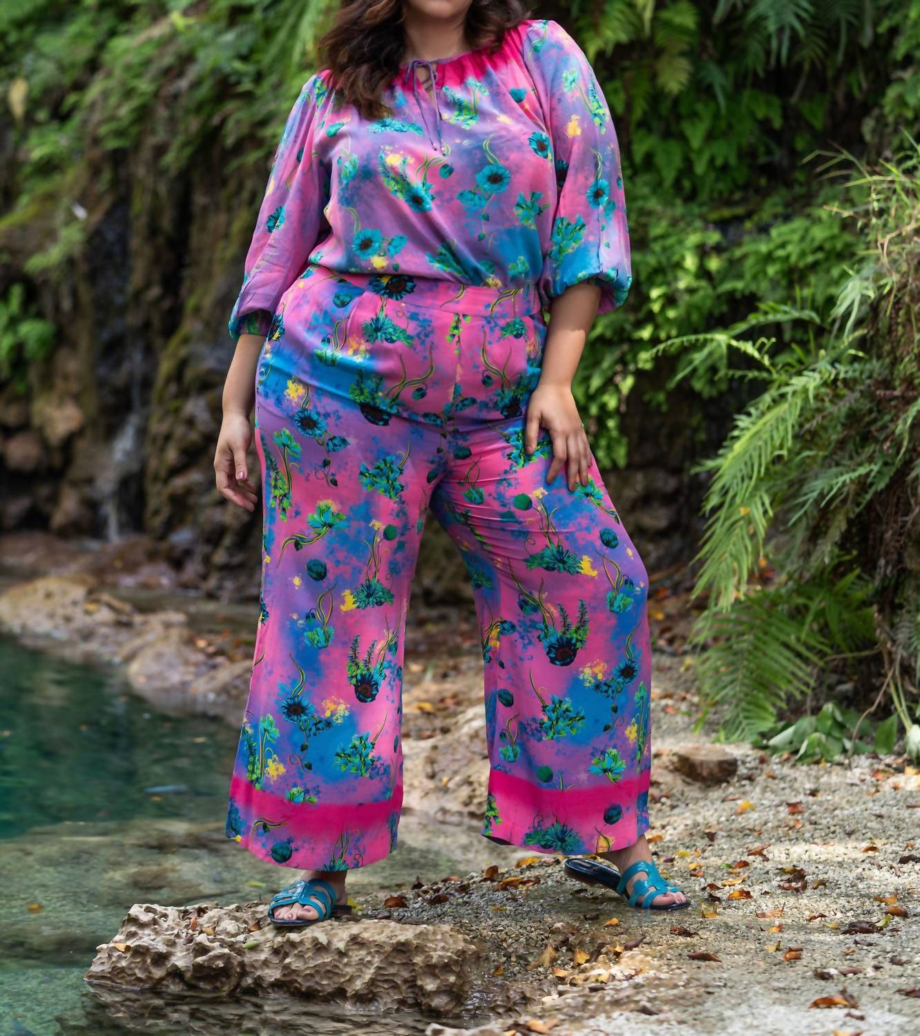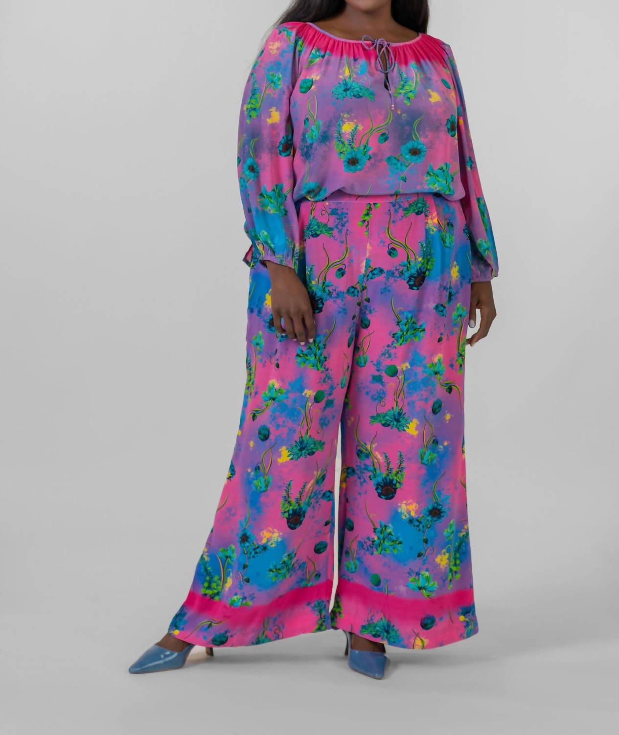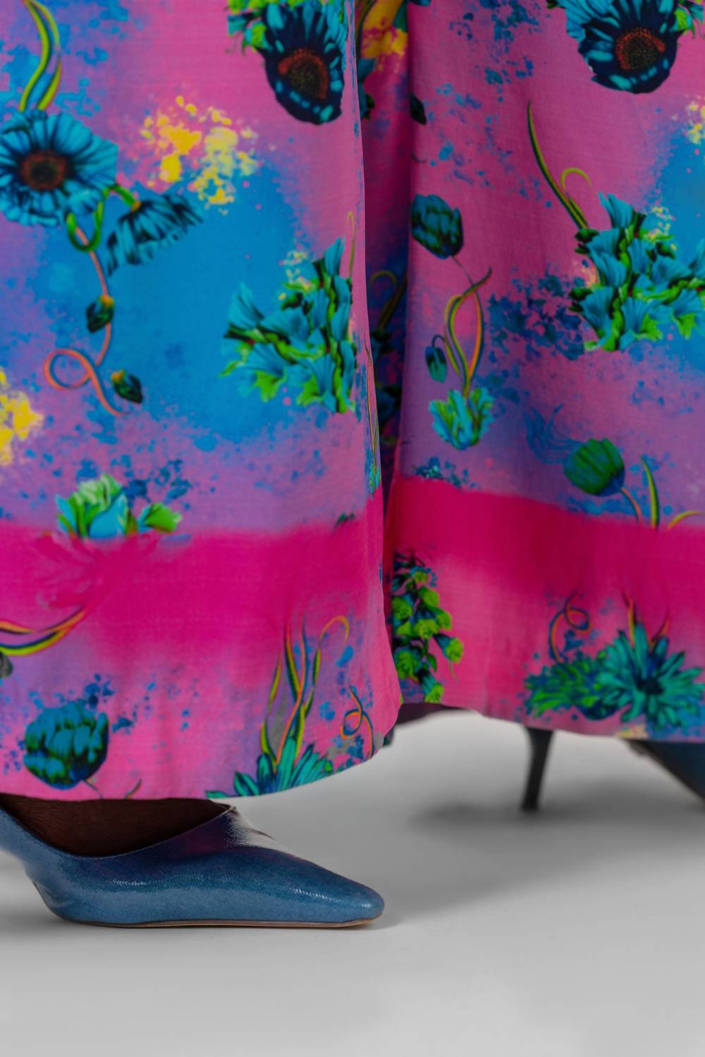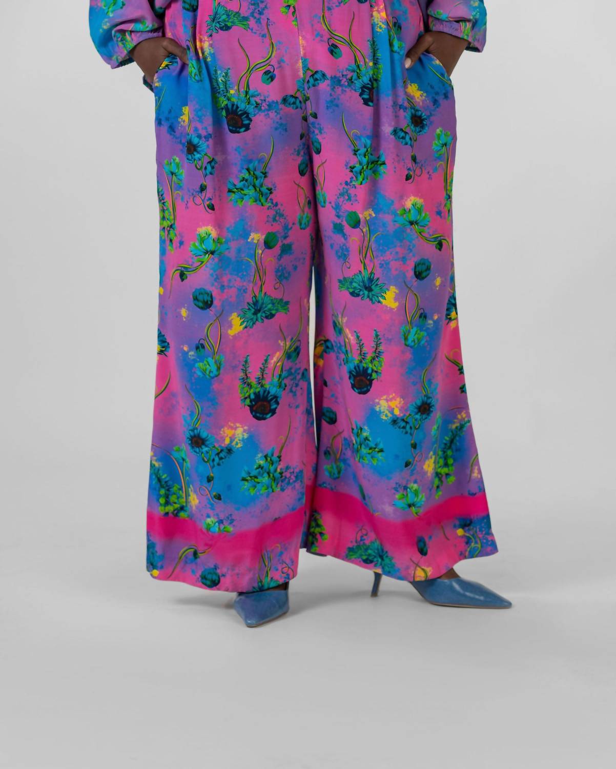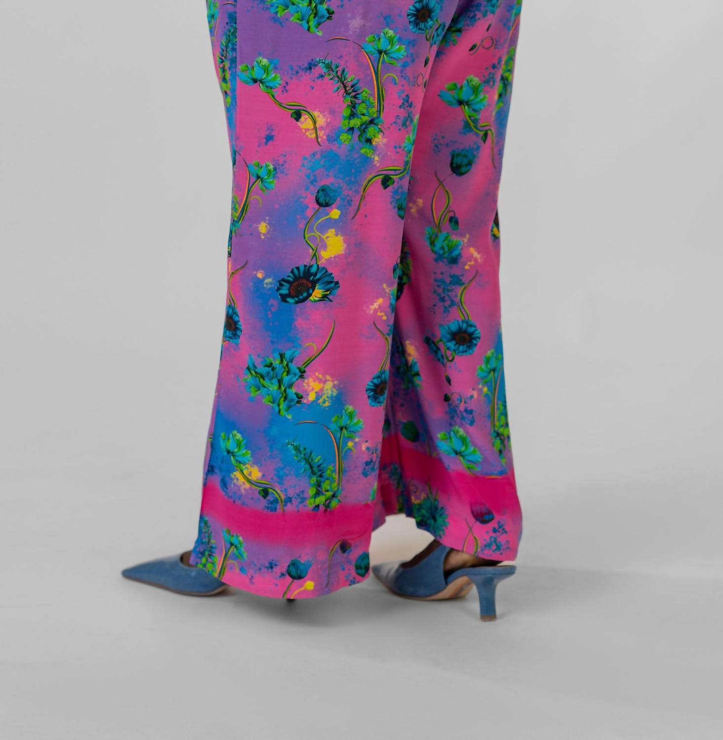 Discover the Floral Purple Pants by La Fuori, an elegant piece perfect for any occasion this spring and summer. Crafted from soft viscose, these wide-leg pants showcase a beautiful floral pattern in purple, offering a relaxed fit that effortlessly enhances your silhouette. With a convenient pull-on closure, they're both stylish and practical, fitting into workwear or holiday scenes with ease. Care instructions include hand wash and line dry to maintain their vibrant charm.