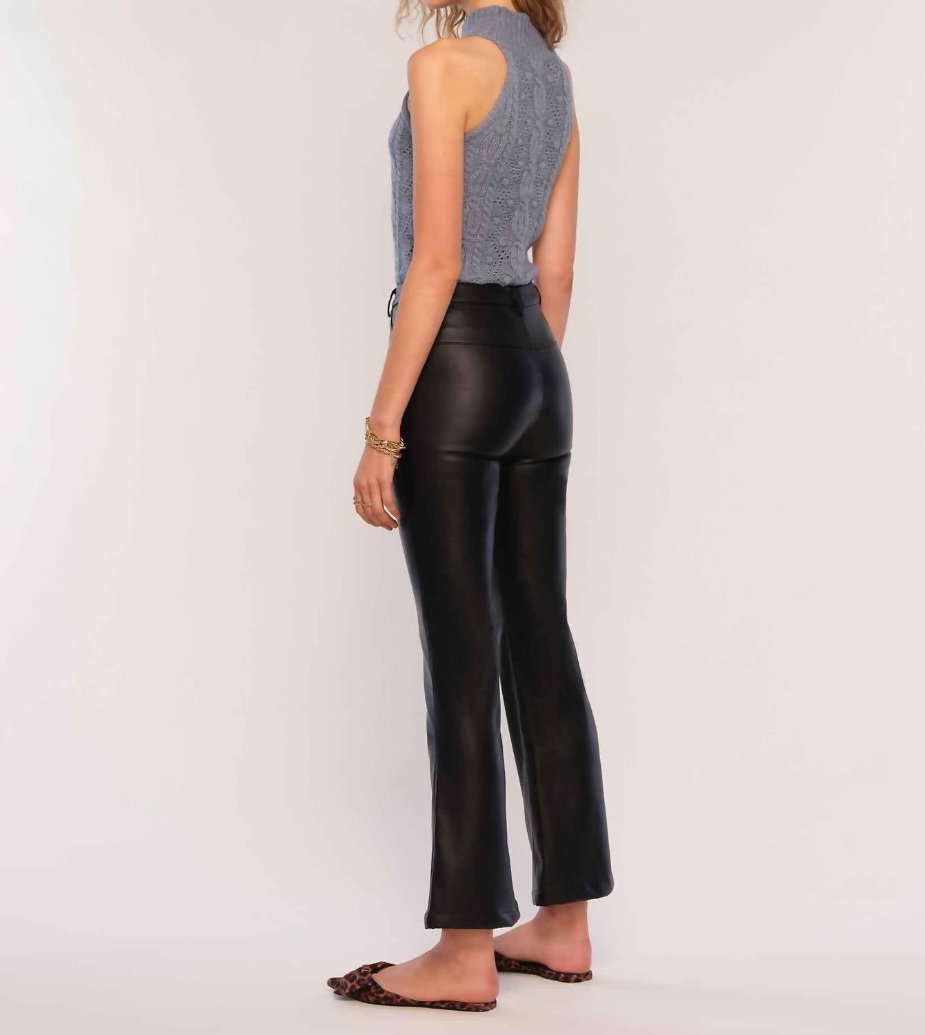 Introducing the Ariel Pant by Heartloom, crafted from luxurious faux leather in a chic black solid pattern. These mid-rise trousers boast a wide leg design with a cropped kick flare and faux pockets, offering a sophisticated yet contemporary look. Constructed from 55% Polyester and 45% Polyurethane, the pants have a total length of 38.5 inches with a 28.5-inch inseam, based on a size S. Closure: Button closure.