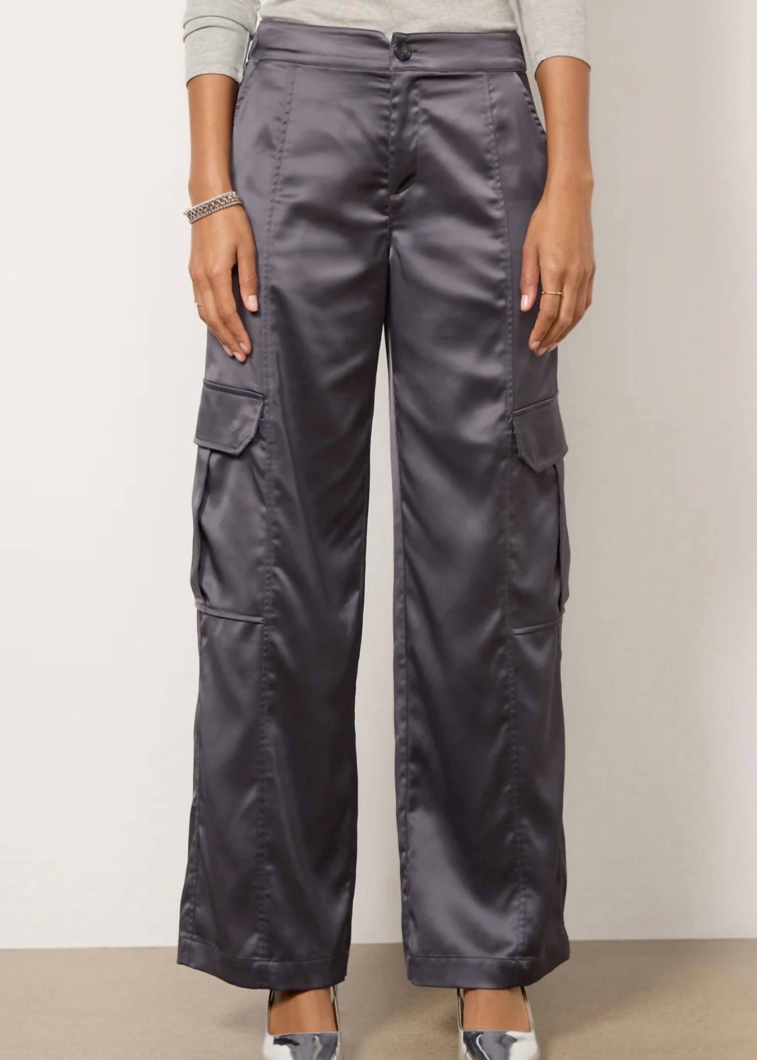 Upgrade your night-out ensemble with the Elite Cargo Pants by Sanctuary, crafted for comfort and style in a sophisticated gunmetal hue. These wide-leg satin pants, composed of 98% Polyester and 2% Spandex with contrast fabric of 96% Polyester and 4% Spandex, feature a flattering high-rise fit with full-length hems. Designed with utility-style pockets, a zip fly, and a button closure, they offer both function and flair. Care for these pants is easy with machine wash instructions; simply wash cold and hang to dry. Dimensions include an 11" front rise and a 33" inseam.