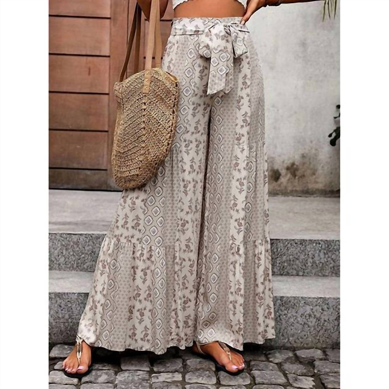 Discover the Flowy Wide Leg Pants With Tie Waist by Wholesalesir, offering effortless boho style in a patterned beige. These pants are crafted from 100% viscose, ensuring a lightweight and airy feel, and feature a relaxed fit with wide legs and a high-rise waist for a flattering silhouette. With a practical pull-on closure and convenient pockets, they are both stylish and functional at a garment length of 40 inches (size S). Care is simple with machine wash instructions, making them perfect for warm-weather wear. Imported.