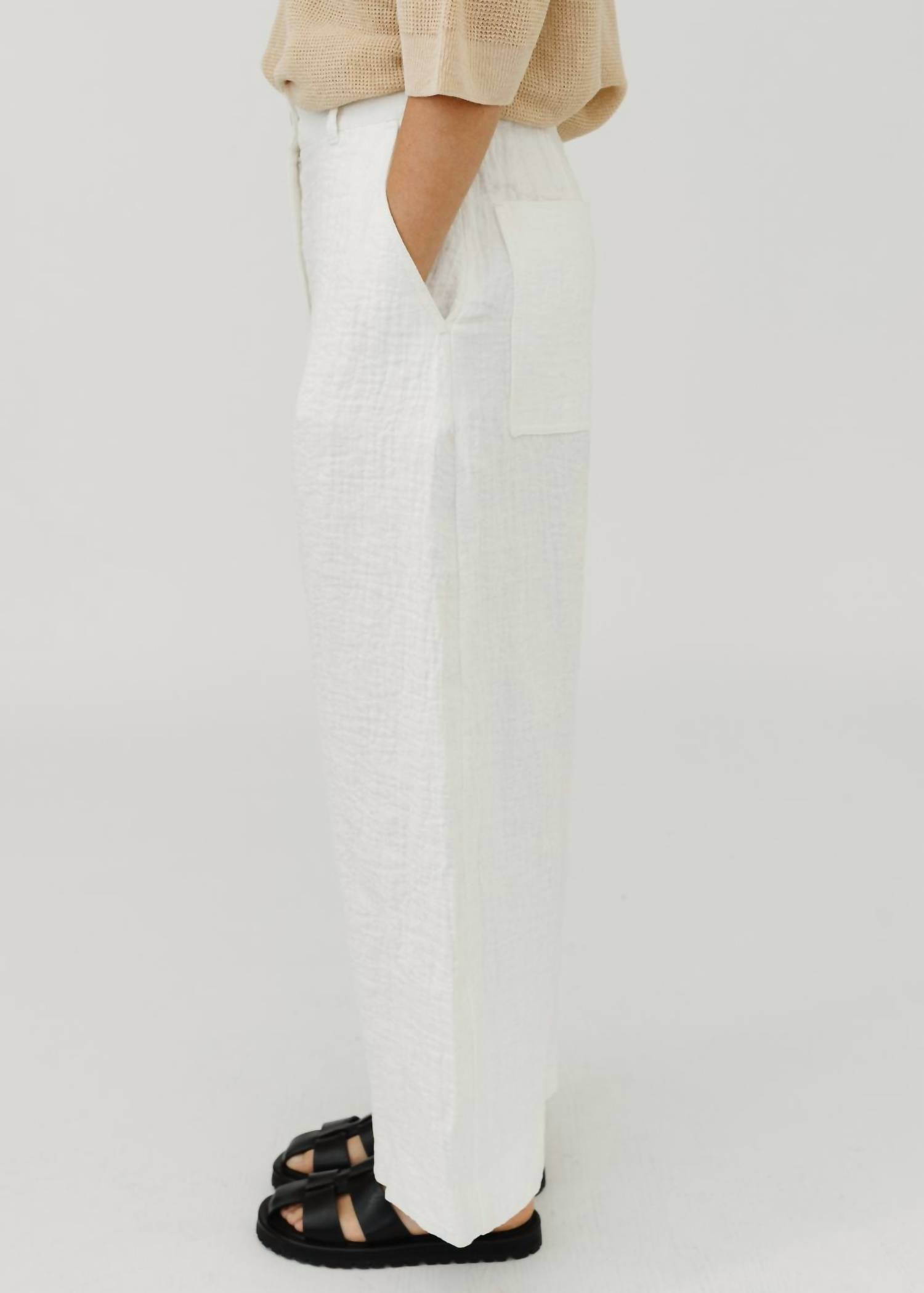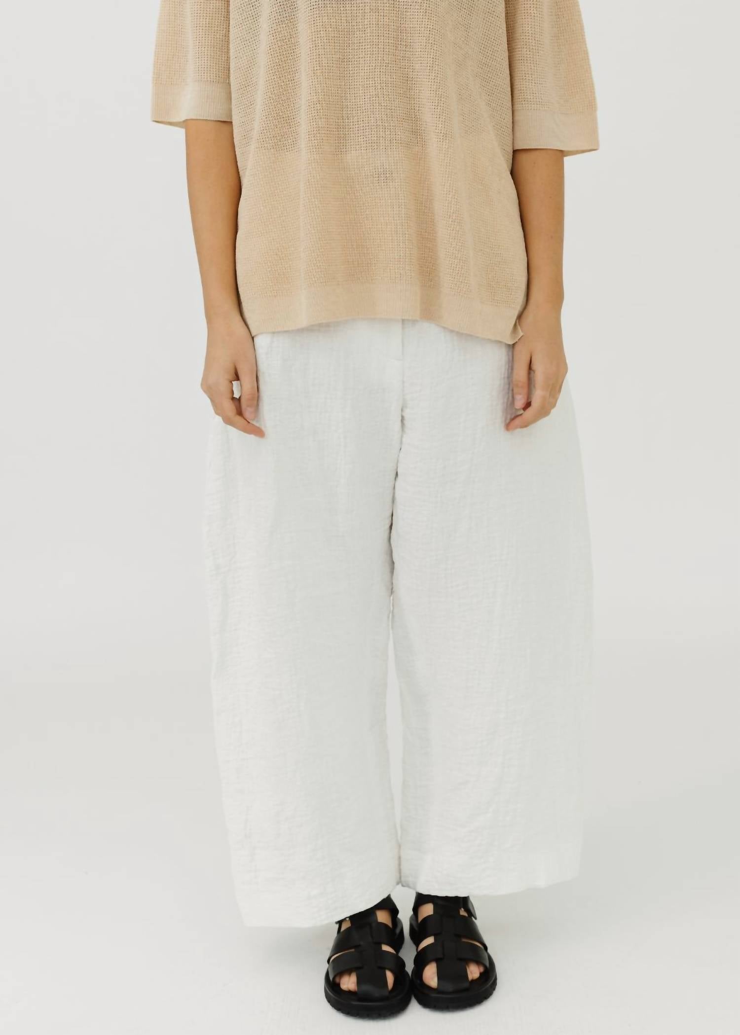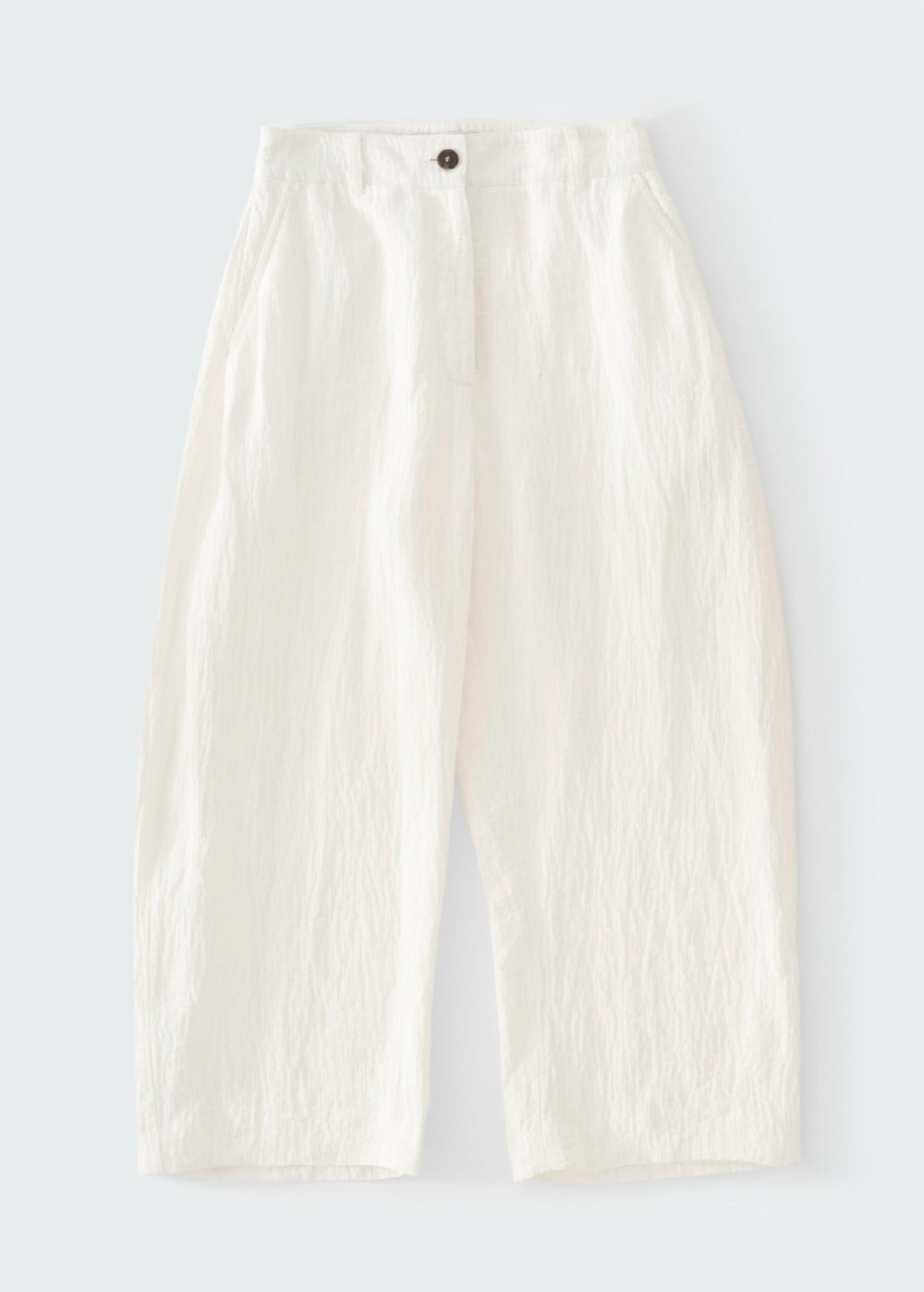 Discover the Chalco Wide Crop Pants by Studio Nicholson, a minimalist staple for your wardrobe this season. These high-rise women's pants feature a wide, cropped, and relaxed fit with an exaggerated curved leg and a dropped crotch. Crafted in a luxurious linen blend composed of 99% linen and 1% cotton, they showcase a solid parchment color and a washed-down look. Closure: Button and zip fastening. Pockets: Side slant and back patch pockets. Care: Hand wash or dry clean. Ideal for a music festival or 4th of July celebrations, these pants embody modern sophistication.