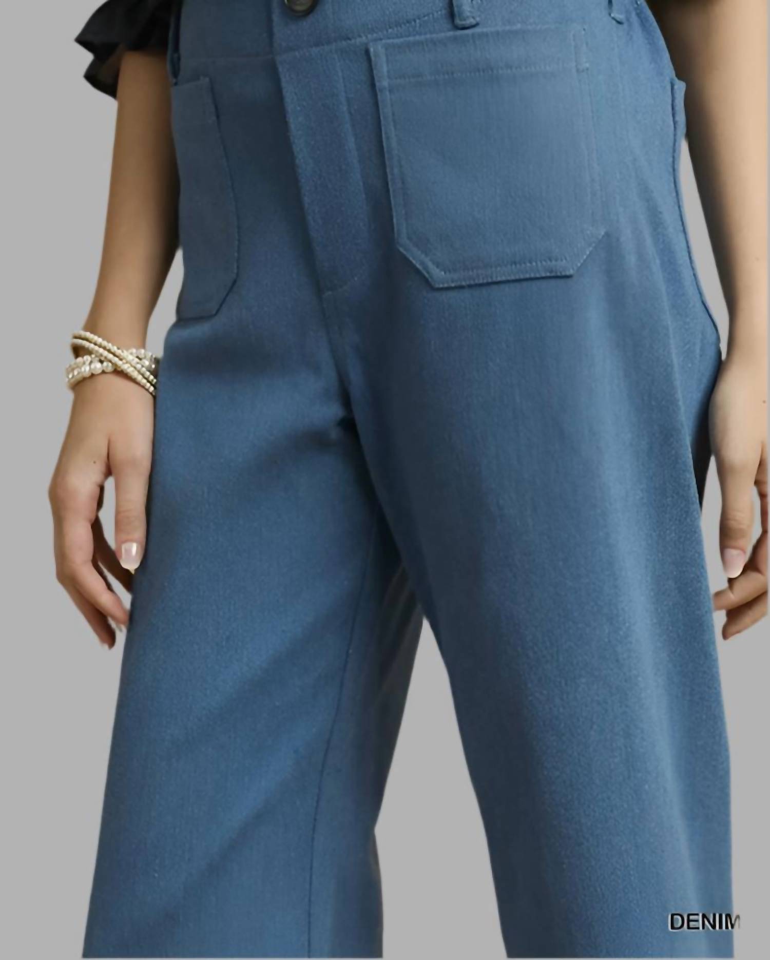 Elevate your summer wardrobe with Umgee's Women's Denim Wide Leg Pants in a classic medium wash blue. Featuring a wide leg silhouette and high-rise waist, these pants bring comfort and style to any dinner party or workwear outfit. The solid denim composition is complemented by practical front patch pockets and a convenient zip closure. With their regular fit, they are the perfect addition to your seasonal fashion rotation.