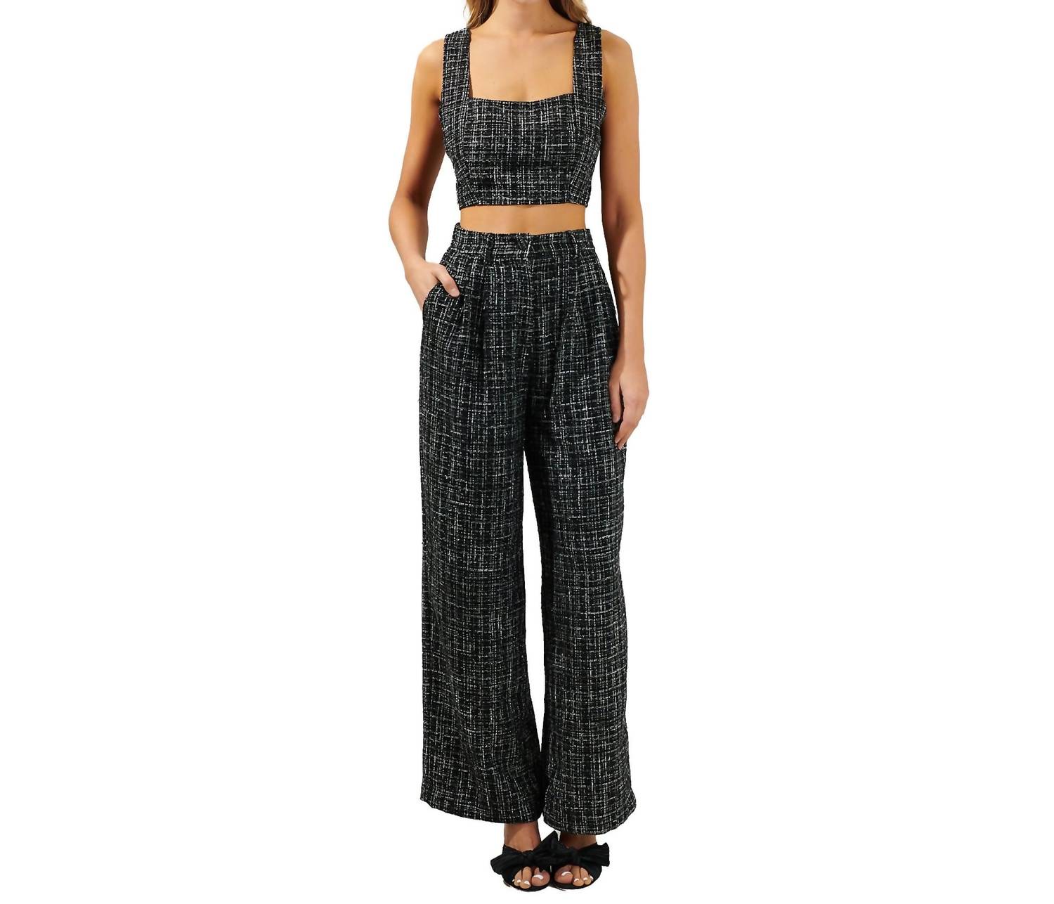 Introducing the Adriella Tweed Wide Pants by SUGARLIPS, an ultra-trendy addition to the modern wardrobe. These high-waisted pants in Black Multi feature a textured design with wide legs and convenient side pockets. They are crafted from 100% polyester and include a zip closure, complemented by stylish belt loops and pintuck details. Model is 5'8" wearing size XS, with a measured inseam of 30.5 inches.