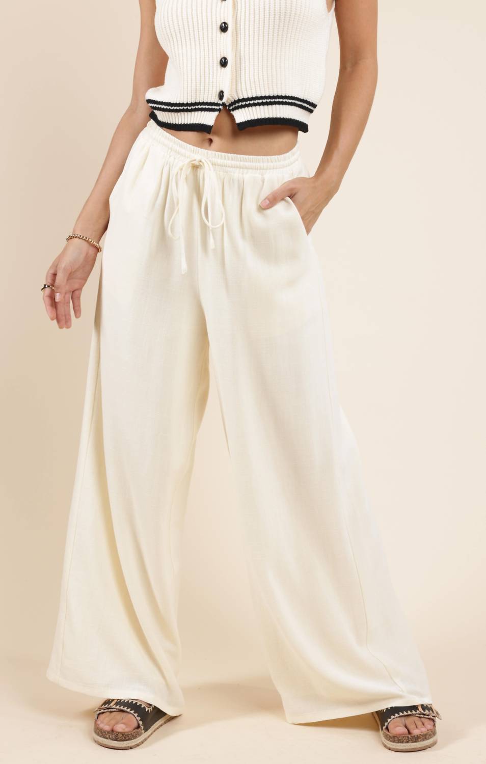 Elevate your style with the Sugarloaf Pants by Sadie & Sage, crafted from a sumptuous blend of 70% Rayon and 30% Linen for a breathable, relaxed fit. These ivory wide-leg pants feature a mid-rise elastic waist with a tie for personalized comfort and a pull-on closure. Perfect for minimalist spring ensembles or Thanksgiving gatherings, their fully lined design offers additional coverage and discreet pockets for functionality. Gender-specific for women, these versatile pants are ideal for both holiday parties or a casual day out, making them a staple in your wardrobe.