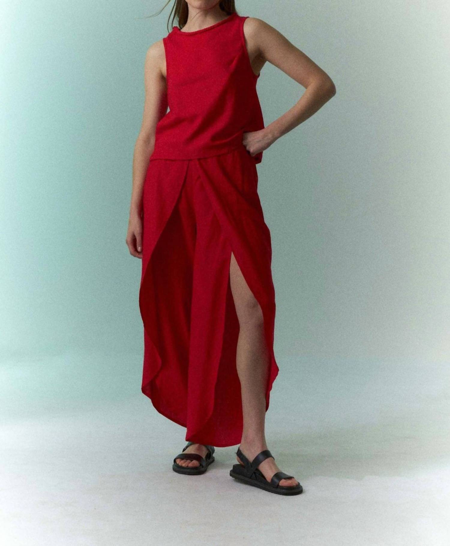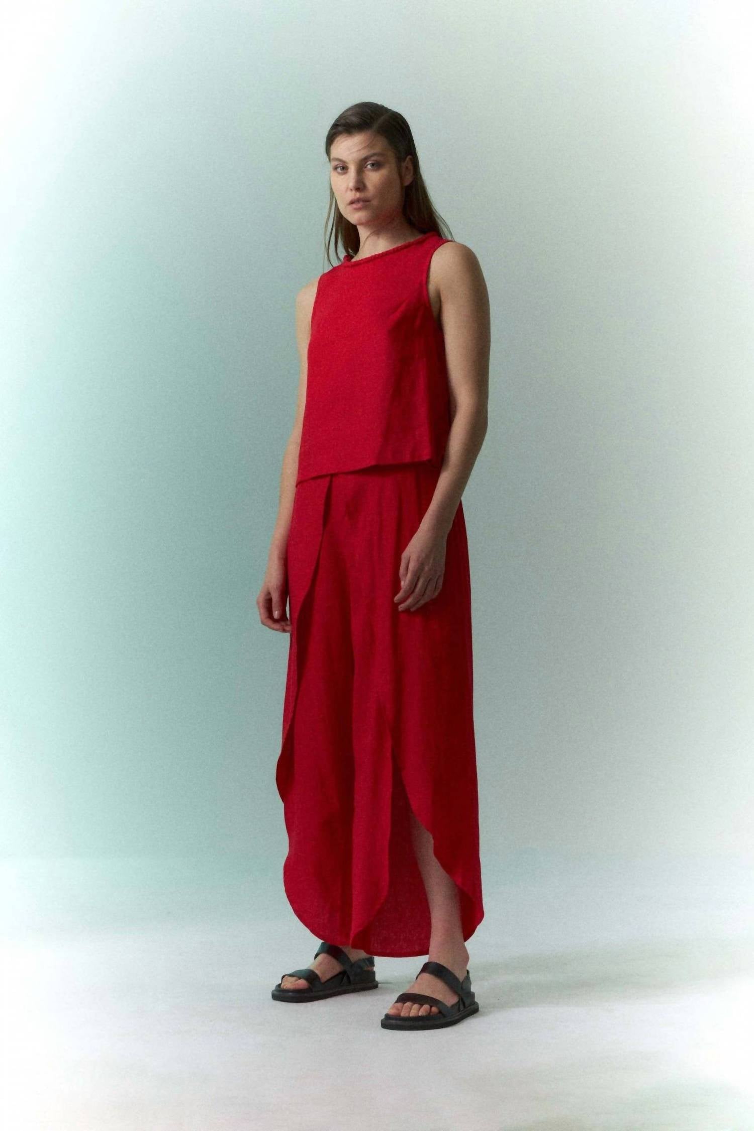 Discover the Linen Slit Cropped Pants by Lolita, a perfect combination of style and comfort for warm days. These women's wide-leg pants, crafted from a linen blend (55% Linen, 45% Viscose), feature a modern cropped length and subtle side slits for a relaxed yet chic look. The solid red design, with a pull-on elastic waistband, offers ease and elegance without pockets. Made in Uruguay, these pants require hand washing and line drying to maintain their breathable quality.