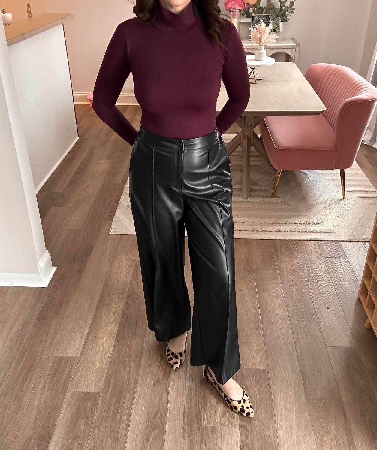 Introducing the Vegan Leather Wide-Leg Pants by In February, designed for a cool, western-inspired flair in sleek black. These pants feature a wide flare silhouette crafted from a vegan faux leather polyurethane fabrication, ensuring both style and sustainability. The design includes a front button-and-zipper closure with an elastic waist at the back for added comfort. Model is 5'10" and is wearing a size Small.