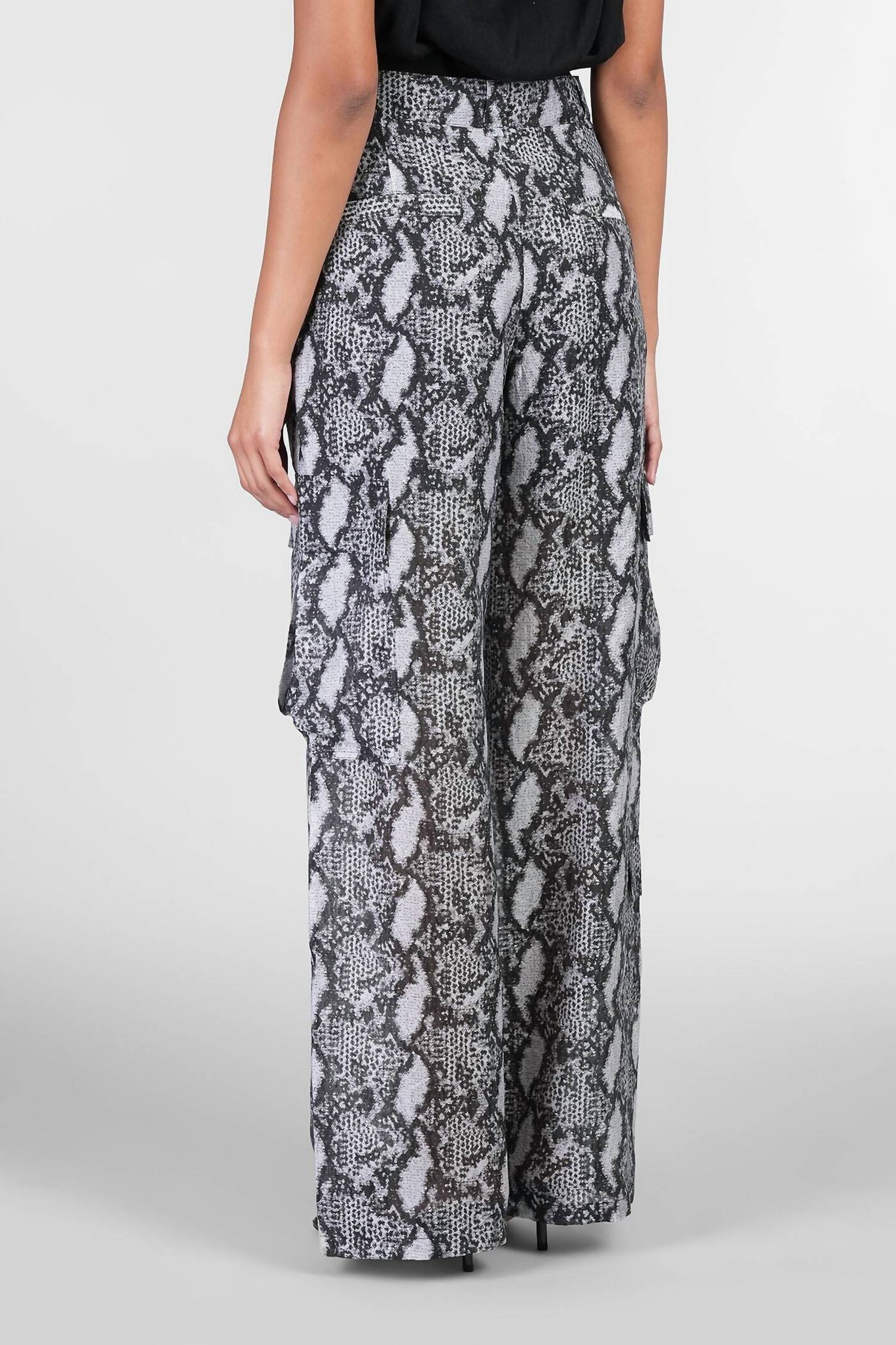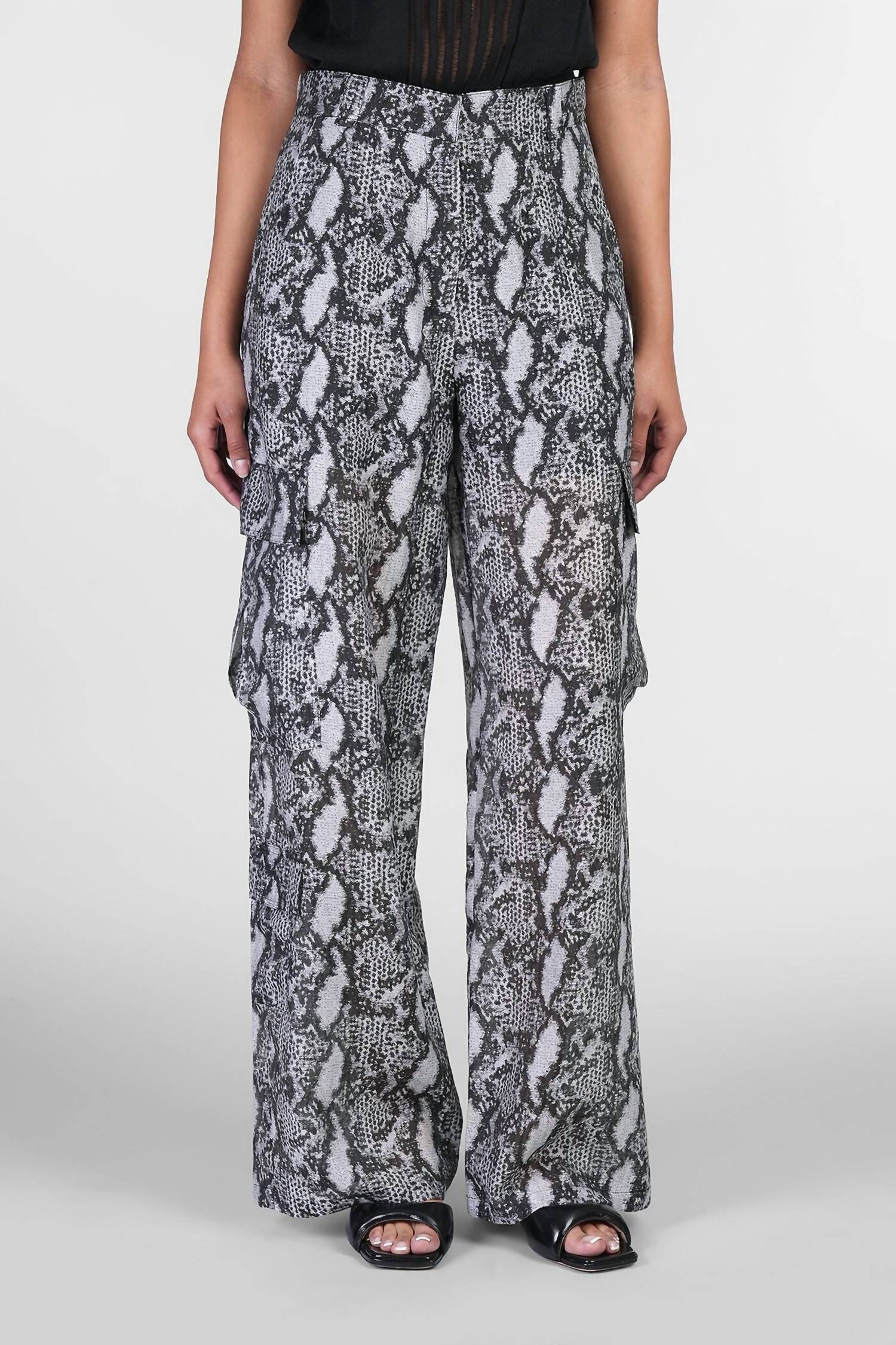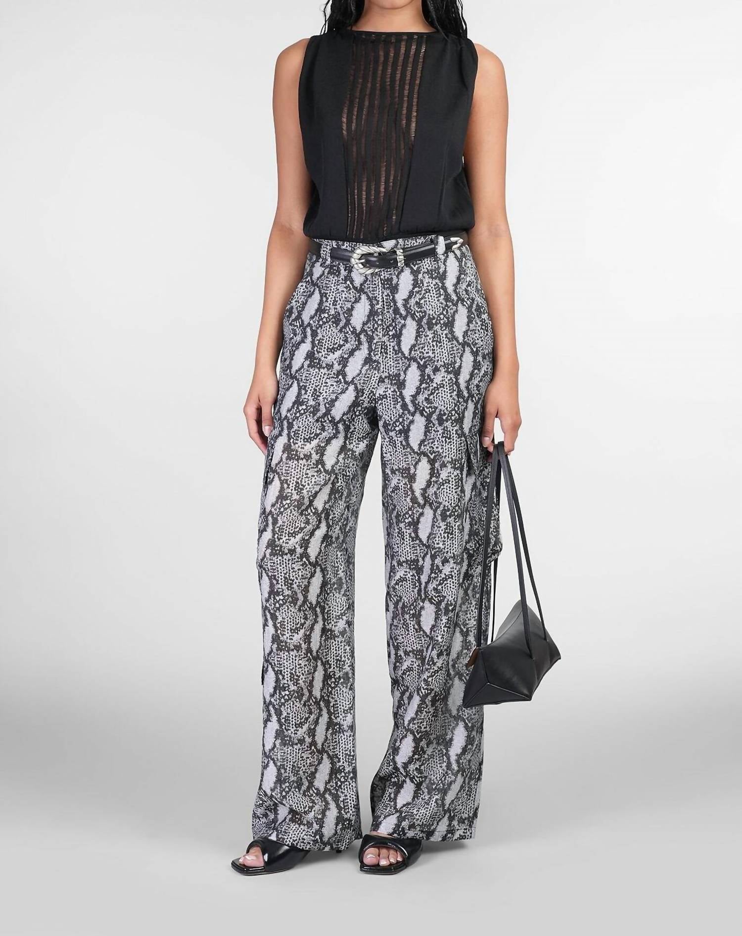 Introducing the Asona Trouser Pants by IRO, a statement piece in a luxurious silver shade that's perfect for any special occasion. These wide-leg, high-rise trousers are crafted from a premium wool blend featuring a bold animalier print with sequins, offering both comfort and style. Made in China, they include practical cargo and welt pockets with a secure concealed hook and eye closure. Embrace the quiet luxury trend with these patterned pants, ideal for a New Year's Eve dinner party.