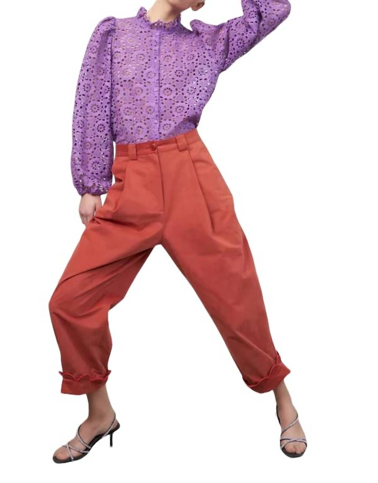 These Pants are made from 100% cotton and feature a high waist, wide leg silhouette, and intricate embroidered stars. They include practical front and back pockets and are designed for durability and breathability.