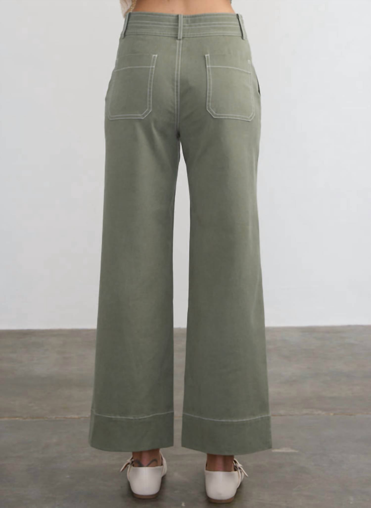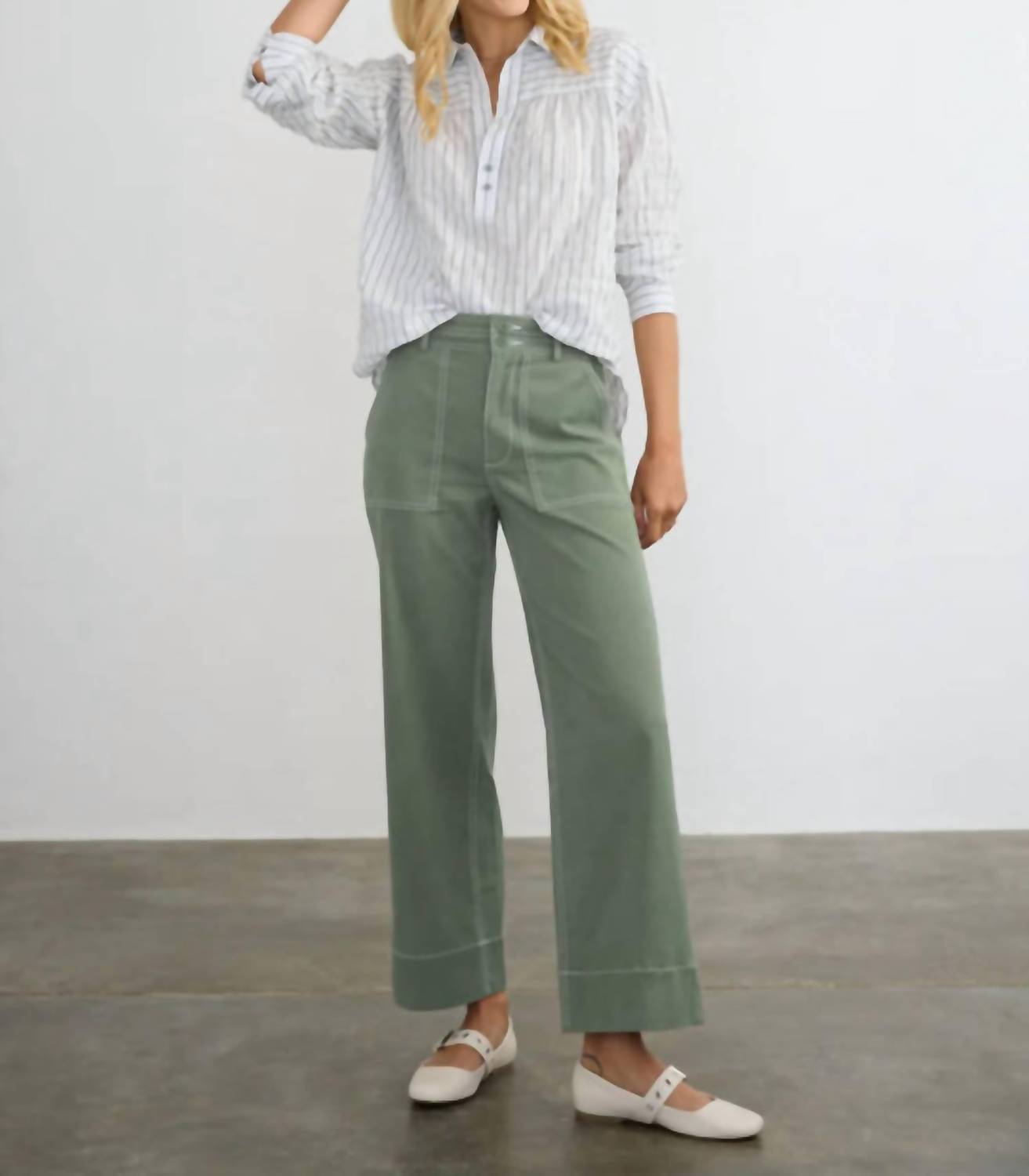 Introducing the Parker Pant by Margaret O'Leary, available in a fresh weed hue and designed for those who value both comfort and style. These women's wide-leg pants are crafted from a luxurious 53% Tencel, 44% Cotton, and 3% Spandex blend, ensuring a breathable and flexible fit. With a utilitarian appeal, they feature functional front pockets and a button closure. Mid-rise and true to size with an inseam of 29 inches, they are perfect for workwear-inspired summer travels. Care for them by machine washing cold and laying flat to dry.