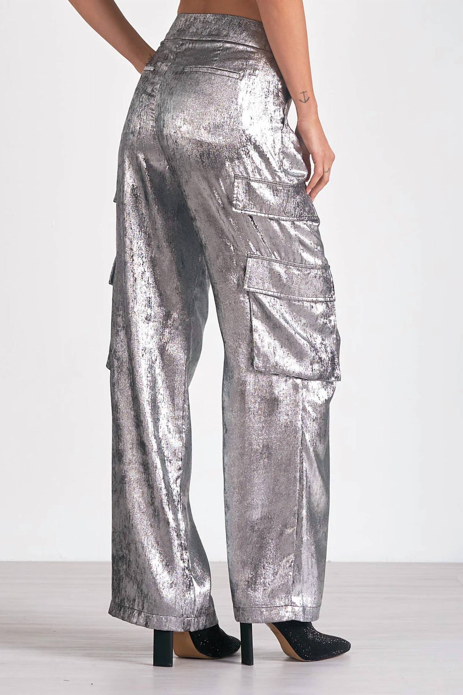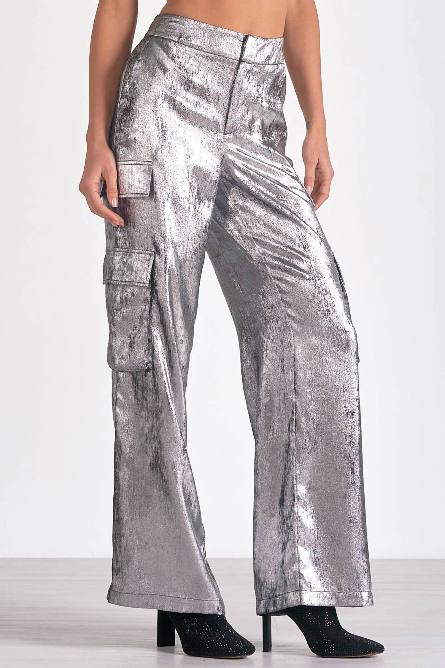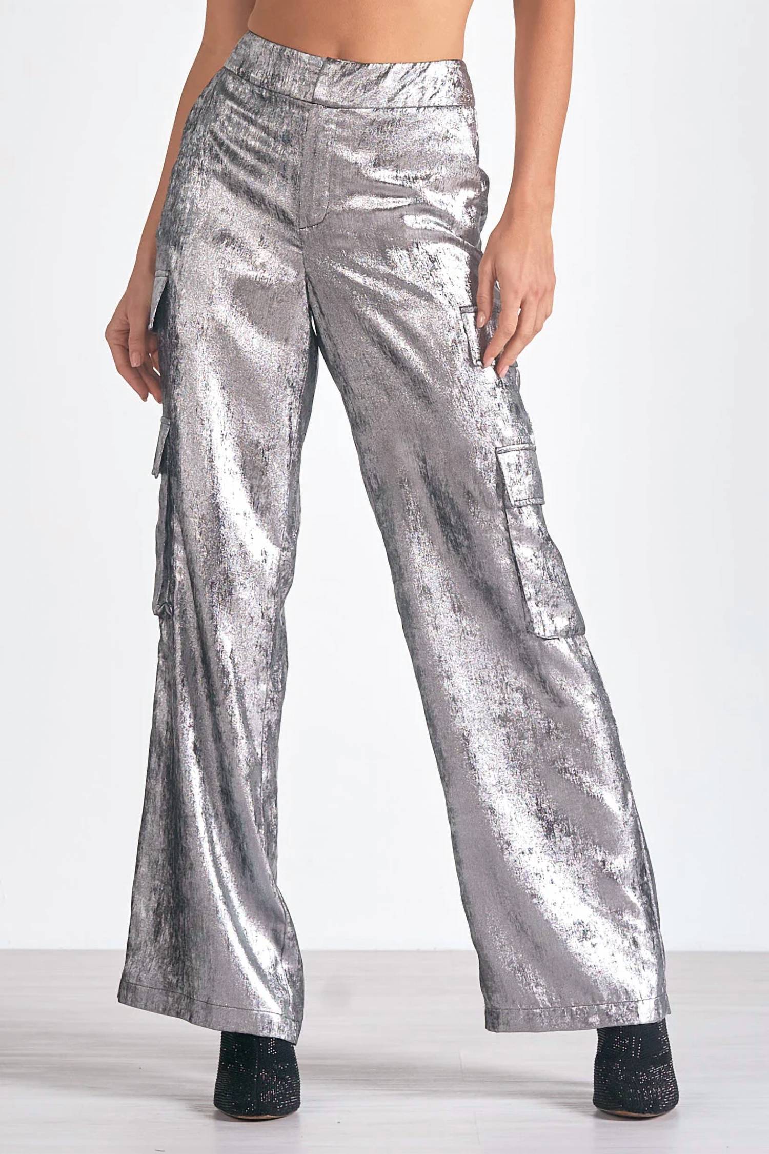 Meet the ELAN Cargo Pant in striking silver, perfect for the modern woman seeking both style and comfort. Crafted from high-quality satin metallic fabric, these wide-leg pants feature a high rise, textured pattern, and convenient pockets. Made with 100% Polyester, they are designed with a zip closure for a sleek look. Care instructions include hand washing and laying flat to dry, ensuring these pants maintain their chic appeal.