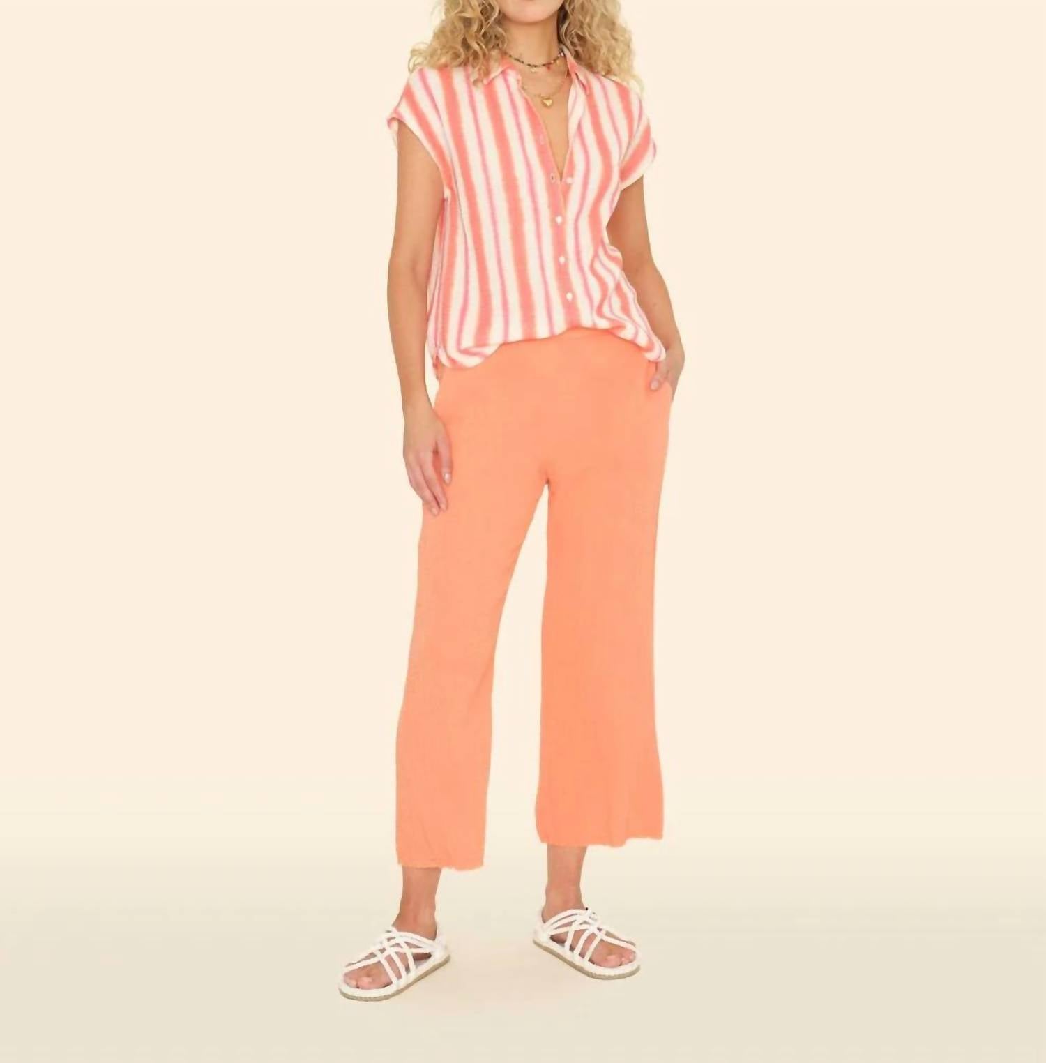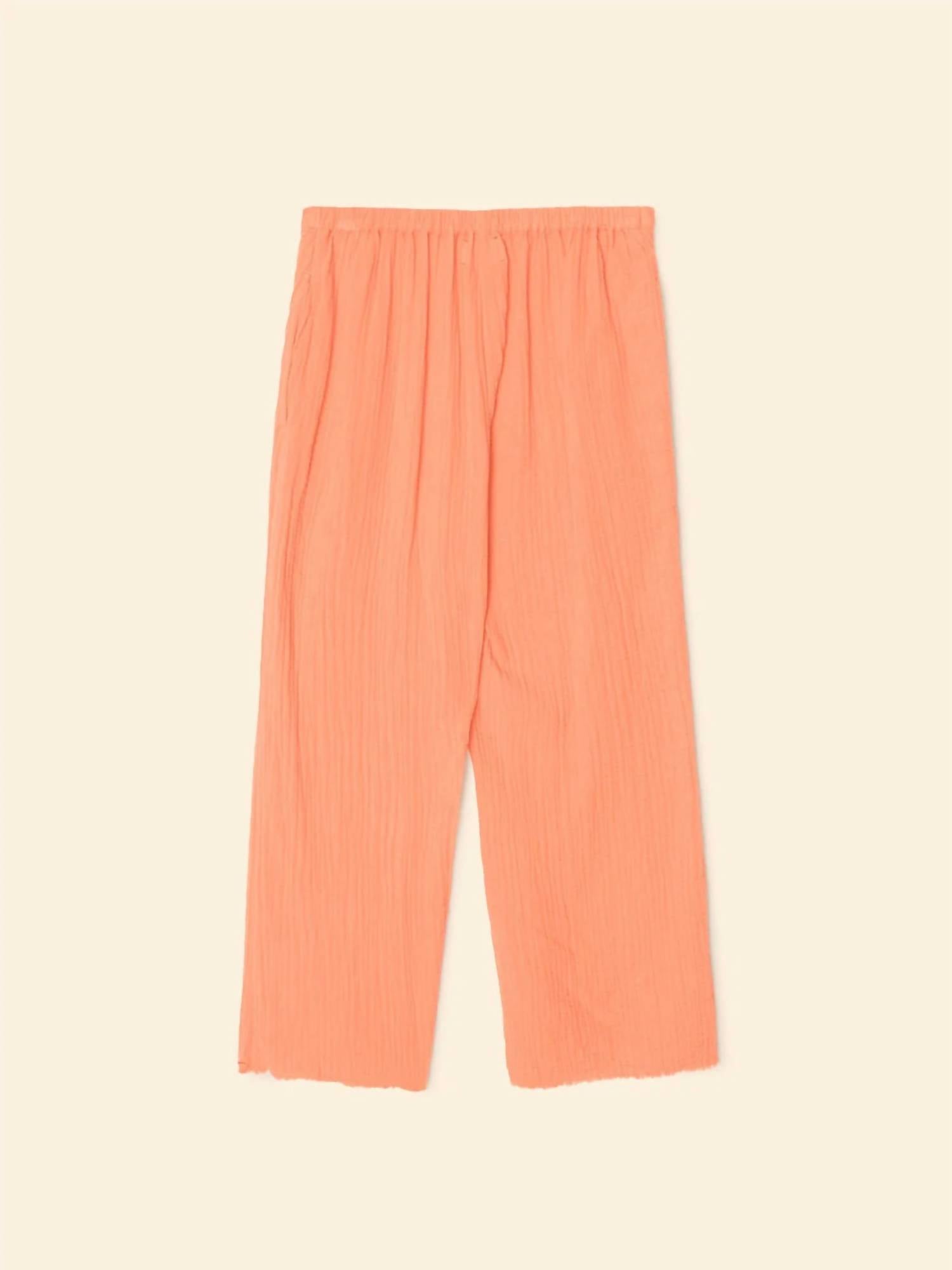 Discover the Jayde Pant by XIRENA, a Summer essential in Cantelope with a relaxed, boho chic style. These slightly cropped wide-leg pants offer a comfortable pull-on design with an elasticized back and side seam pockets, ensuring effortless charm and practicality. Made from 100% Cotton Chelsea Gauze, these pants come with a raw edge hem and a 25.5-inch inseam. Crafted in Los Angeles for women, they require machine washing on a gentle cycle and should be laid flat to dry. Model is 5'10" and wears a size Small.