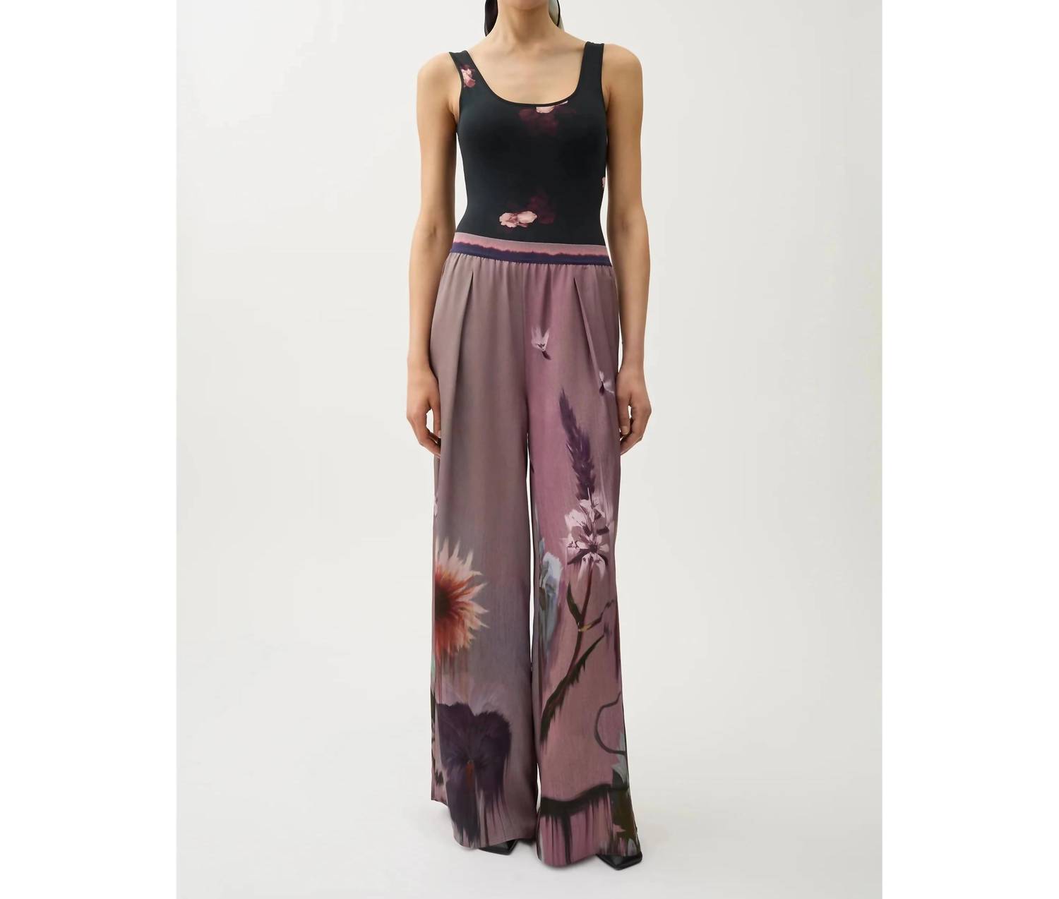 The Berta Flower Pants by Rodebjer offer a truly unique style with each pair hand dip-dyed, ensuring individuality. Made from 100% Viscose crêpe de chine, these wide-leg pants feature a relaxed fit and a beautiful Flower Bed print on a Moonscape Purple base. The pull-on design enhances comfort and ease for any occasion, perfect for a vacation getaway or adding a boho chic touch to your spring wardrobe. Care instructions include dry cleaning only to maintain their exquisite appearance.