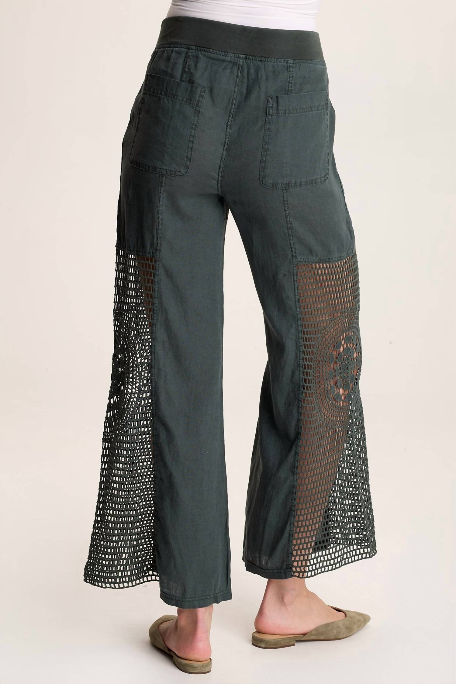 Discover the Tangent Crochet Wide Leg Pants by XCVI, offering a relaxed fit in a striking deep teal that exudes 90s fashion. Crafted entirely from linen, these high-rise pants feature a comfortable pull-on elastic waistband, complemented by intricate circular crochet leg panels and functional front and back pockets. Perfect for spring getaways or Thanksgiving gatherings, the preshrunk fabric ensures durability and ease, requiring only a simple machine wash for care. Enhance your vacation wardrobe with these stylish, patterned wide-leg pants.