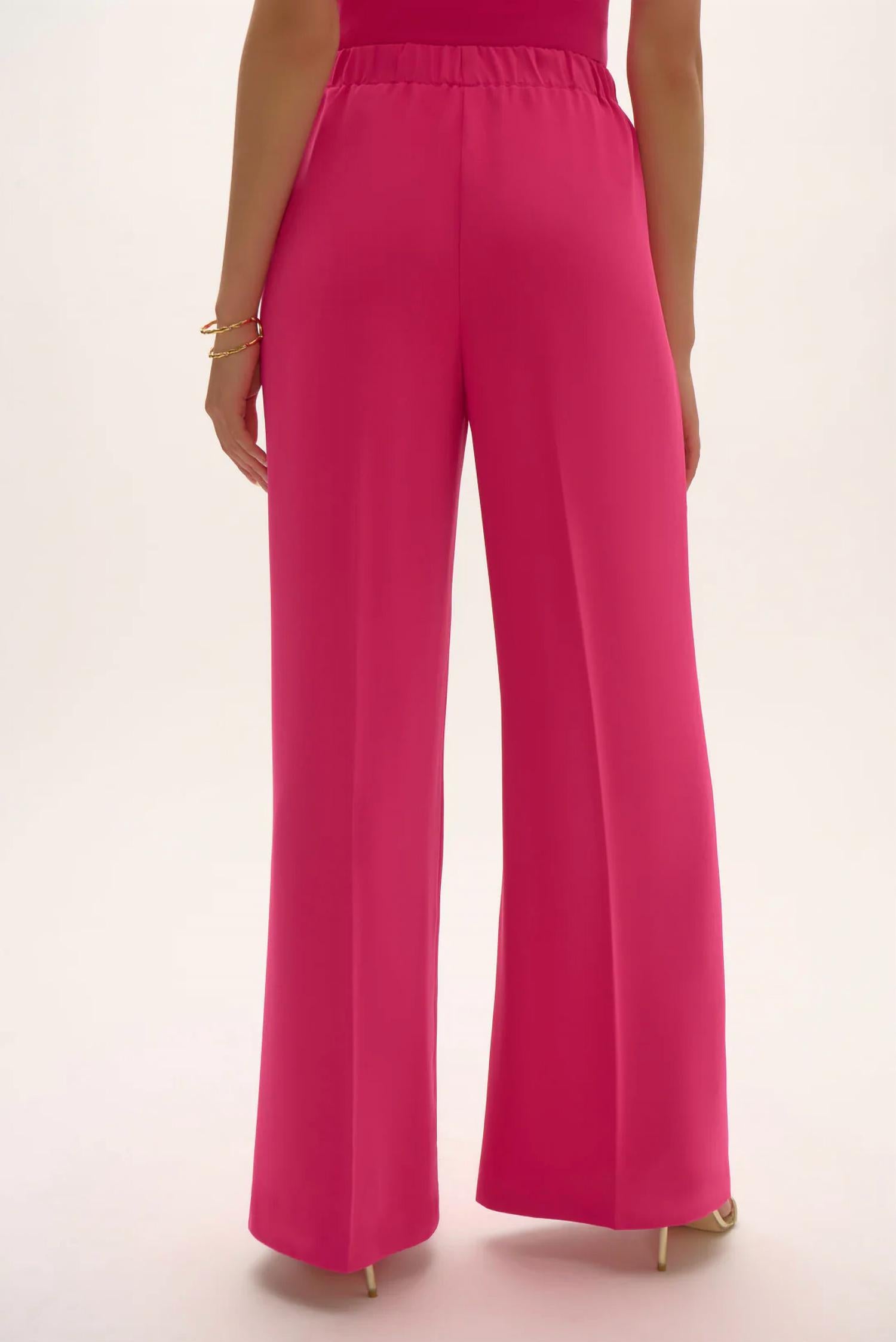 Embrace style and comfort with the Joseph Ribkoff Wide Leg Pull-On Pants in vibrant Geranium. Constructed from 100% Polyester, these pants feature a pull-on closure and a back elastic waistband for all-day ease. With a polished crease at the center front and back, they effortlessly transition from casual to dressier occasions. Made in Canada, they require hand washing in cold water, line drying in the shade, and are best worn without ironing or dry cleaning.