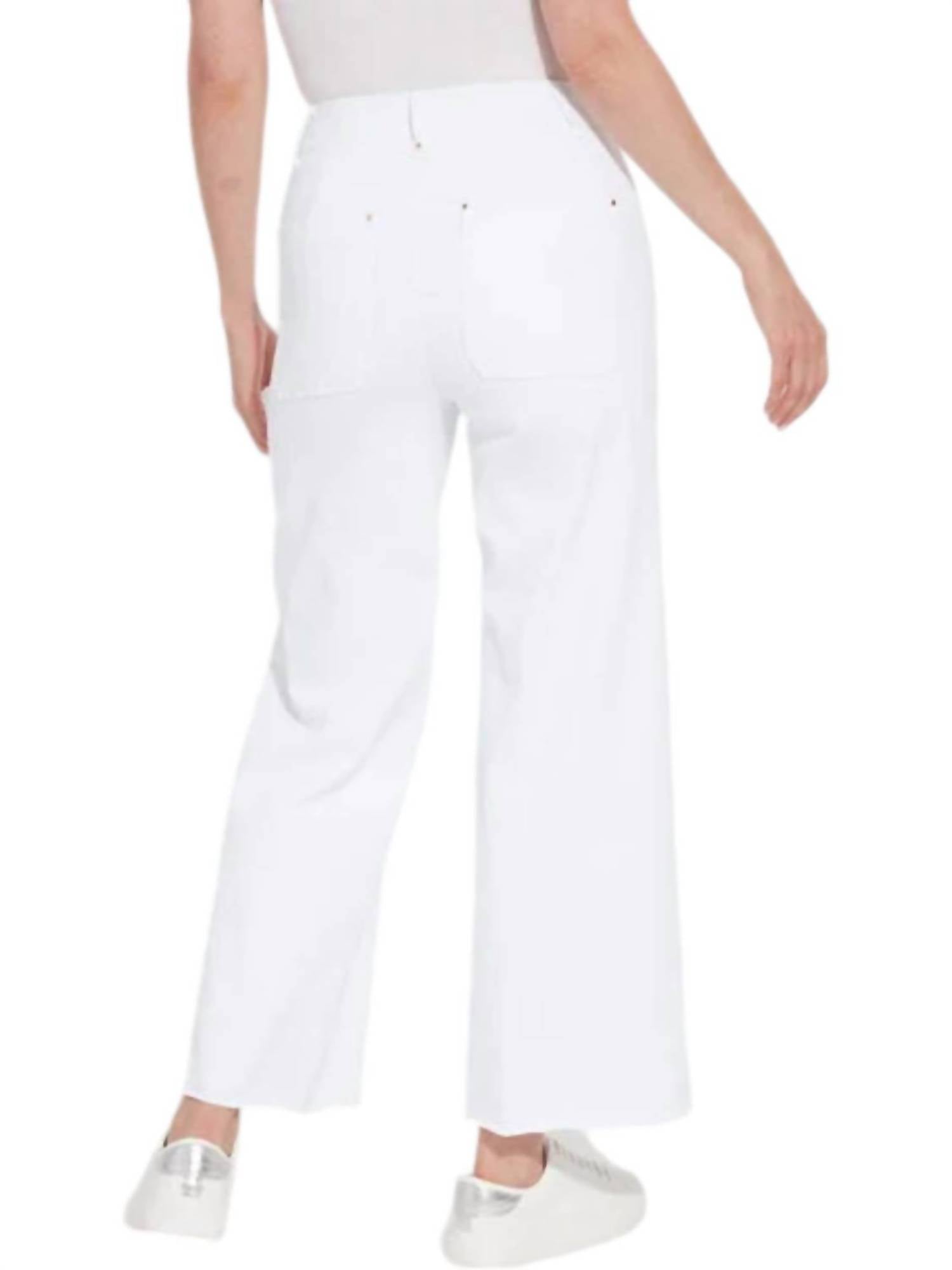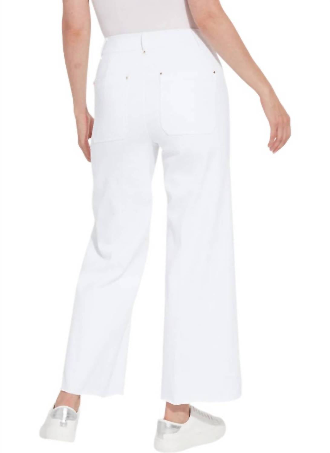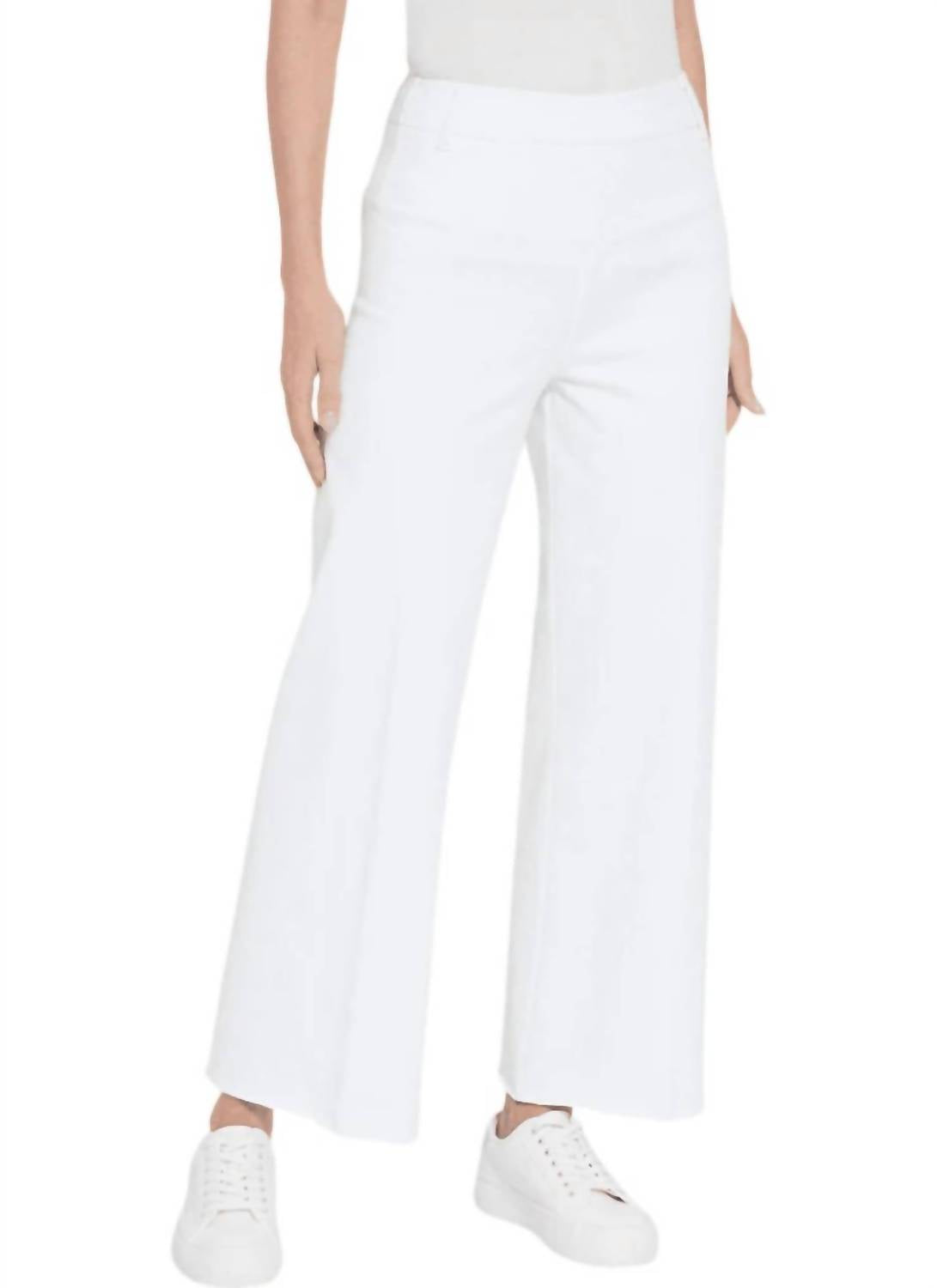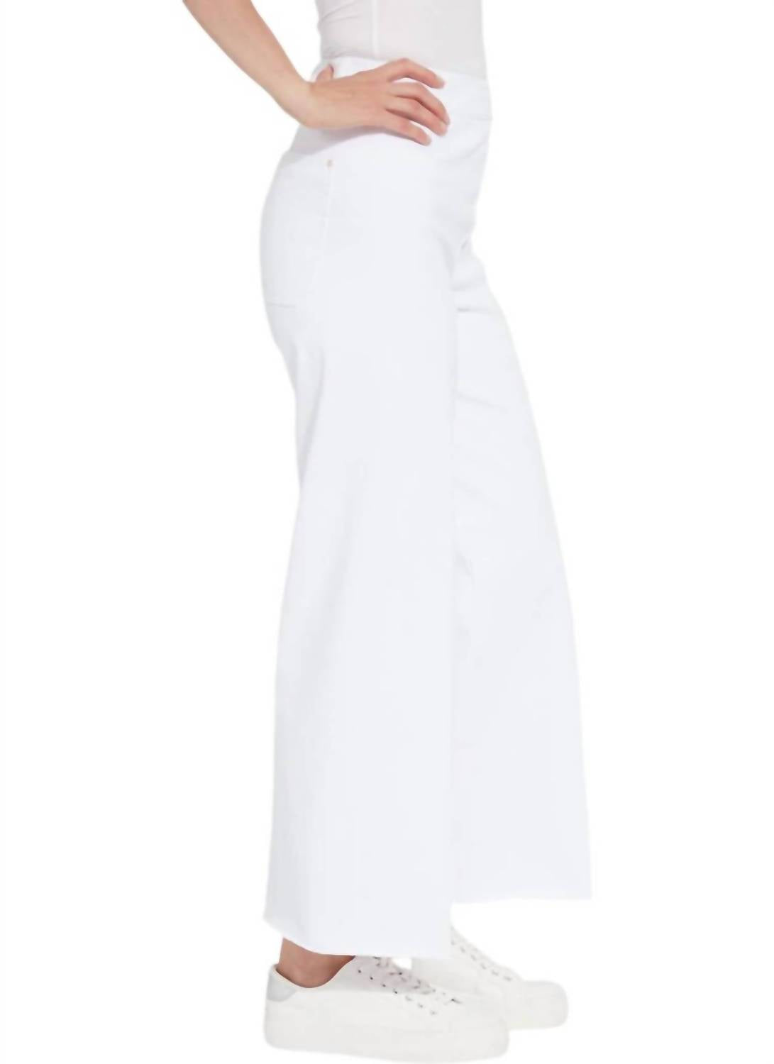 These high-waisted trousers are crafted from luxurious 4-way stretch knit denim, offering unmatched comfort and style. They feature a concealed patented waistband, back patch pockets, and a chic center back gunmetal stud. The extra-wide, seamless leg creates a fluid silhouette, cropped at the ankle with a raw-edge hem for a contemporary, customizable touch.