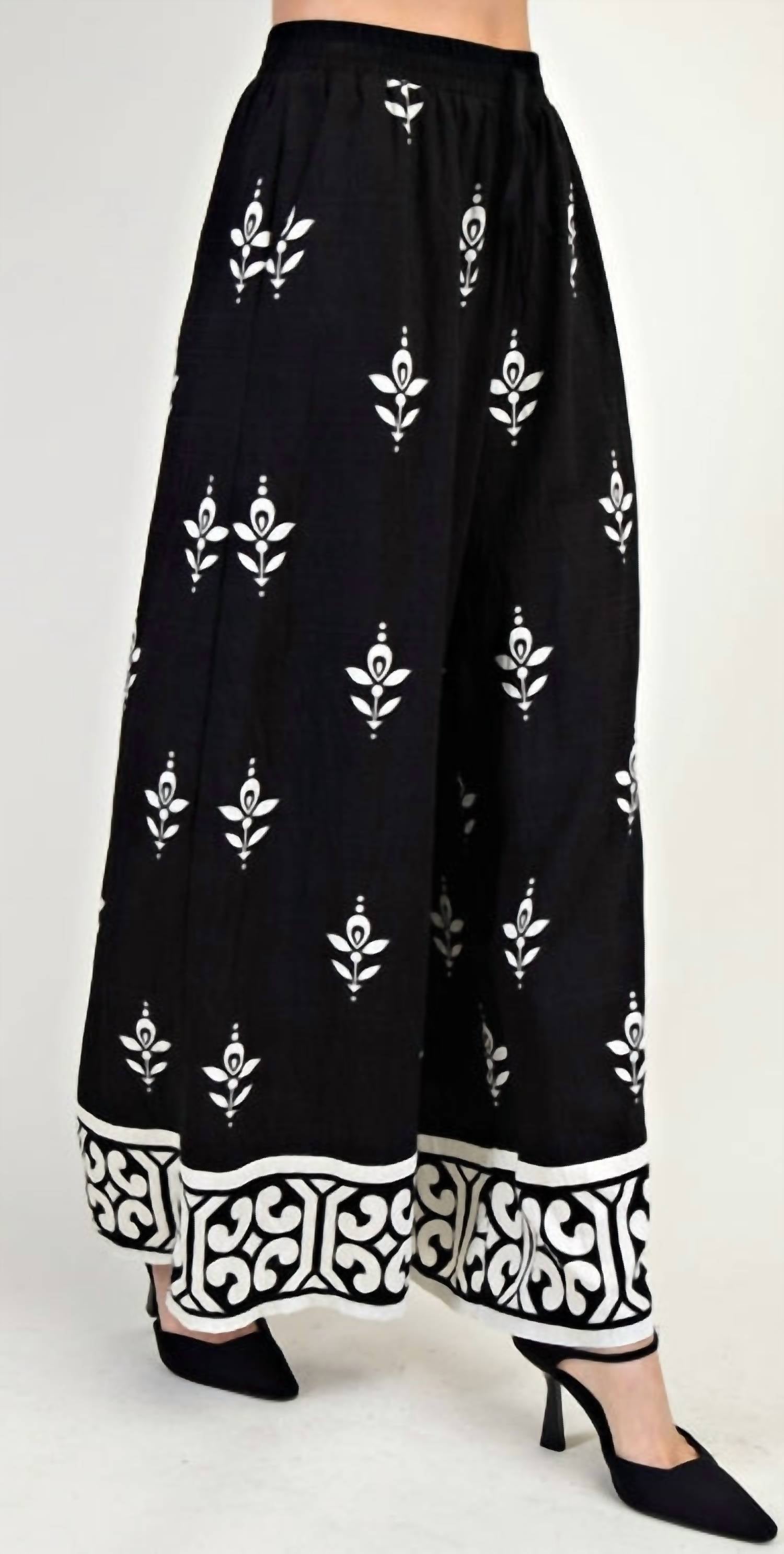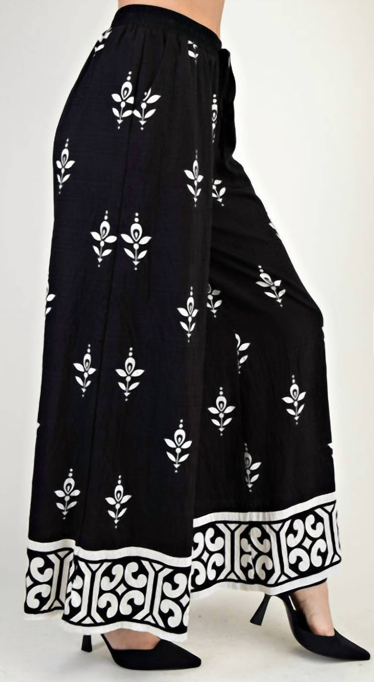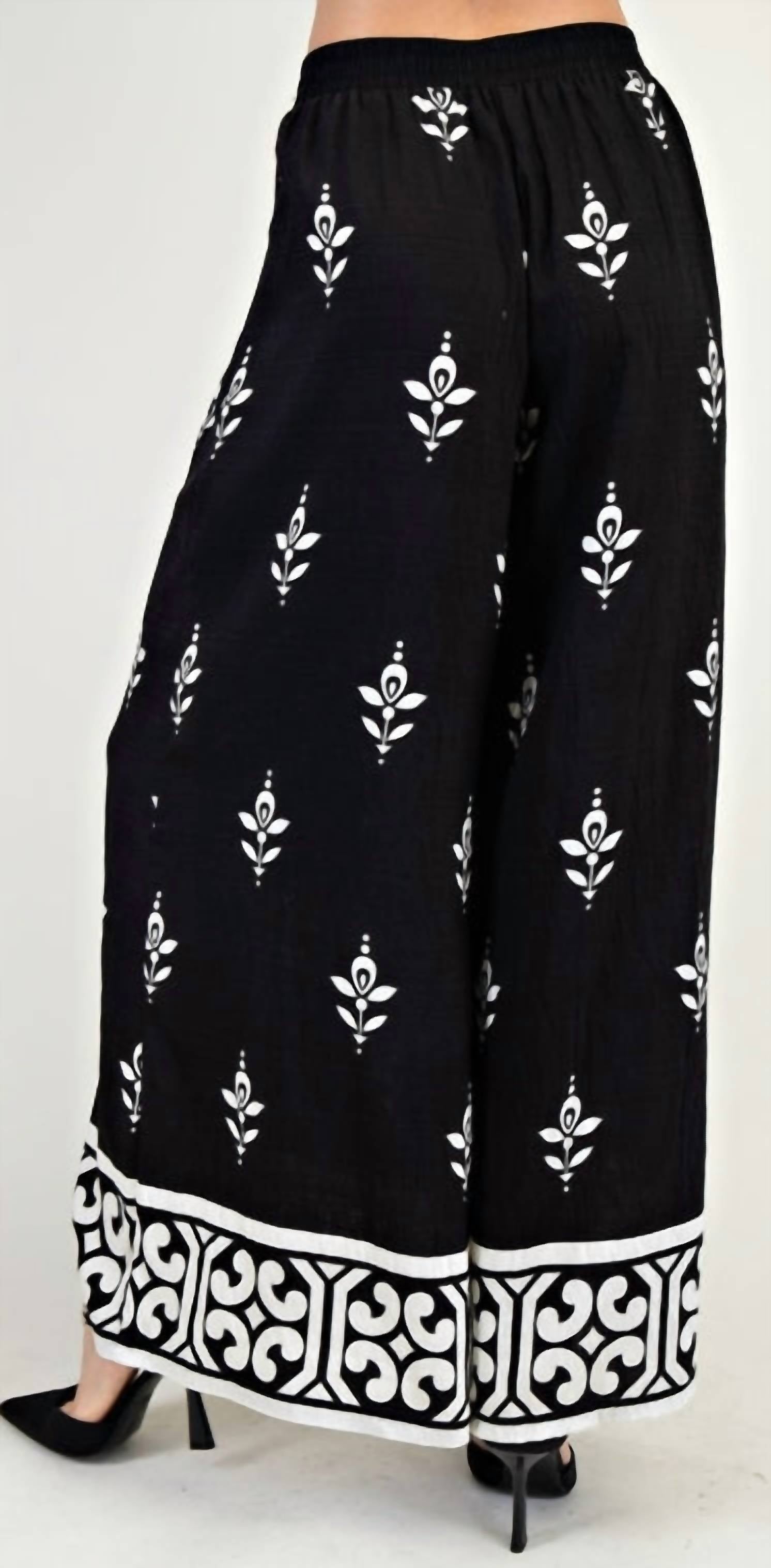 Make a bold and elegant statement with the Lulu Wide Leg Pants, combining effortless comfort with sophisticated style. Featuring a striking black-and-white print with delicate white floral embroidery, these pants offer a flowy wide-leg silhouette and an elastic waistband for a relaxed yet polished fit. The decorative hem border adds a boho-inspired touch, while the lightweight, breathable fabric keeps you comfortable all day. Crafted from 100% polyester with a 100% cotton contrast, they’re a versatile must-have for every modern wardrobe.