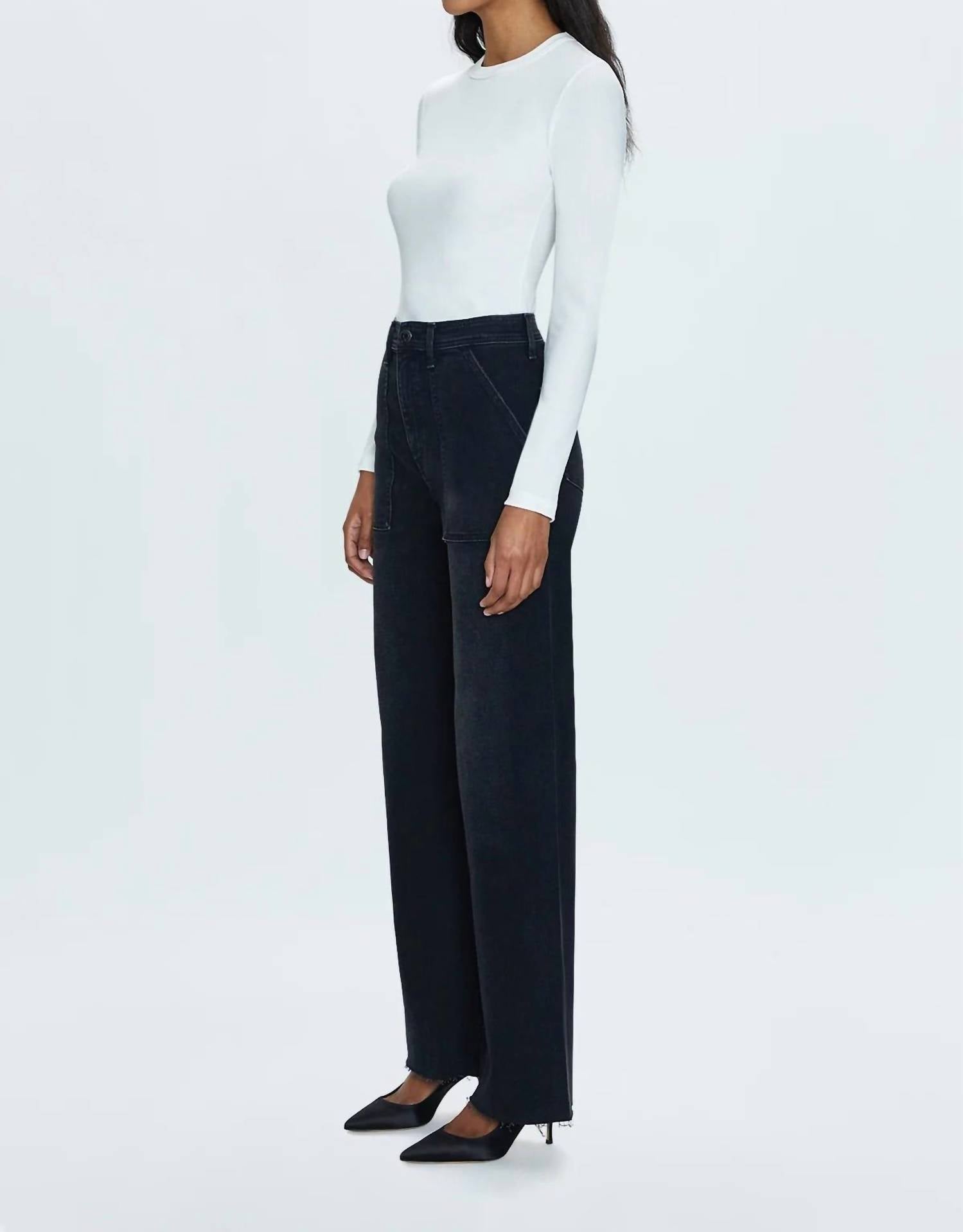 Discover the Pistola Women's Penny Utility High Rise Wide Leg Pant, perfect for streetwear-inspired summer outings or vacation adventures. These pants feature a high-rise waist and a classic wide-leg design with utility-style patch pockets, providing both function and style. Made from Pistola's signature comfort stretch denim in a washed black hue, they ensure a flattering and comfortable fit. Closure: Zip Closure.