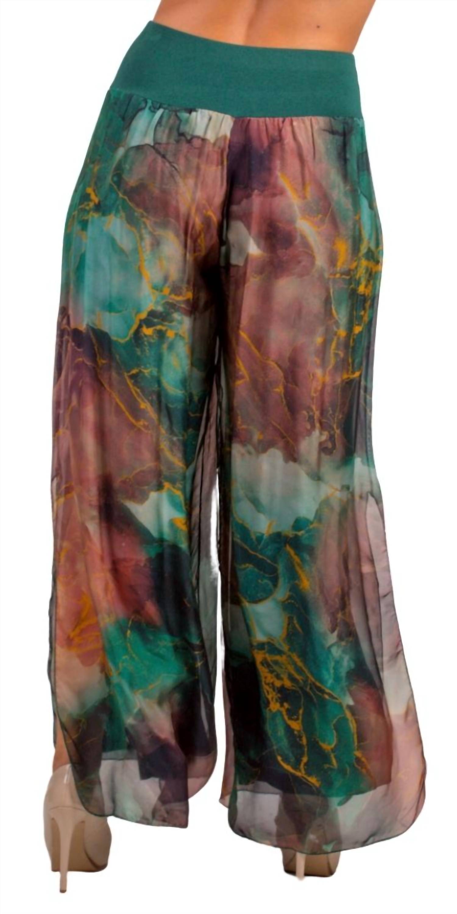 Experience effortless elegance with the Jasmin Tempesta Slit Wide Leg Pants by GIGI MODA in striking Forrest Green. Featuring a relaxed, wide leg fit and high-rise, these pants are made from 100% silk, ensuring a luxurious feel against your skin. They originate from Italy and offer a convenient pull-on closure, enhanced with a stylish stormy print and side slit in the hem for added flair. Care for this exquisite piece by dry cleaning it to maintain its luxurious quality.