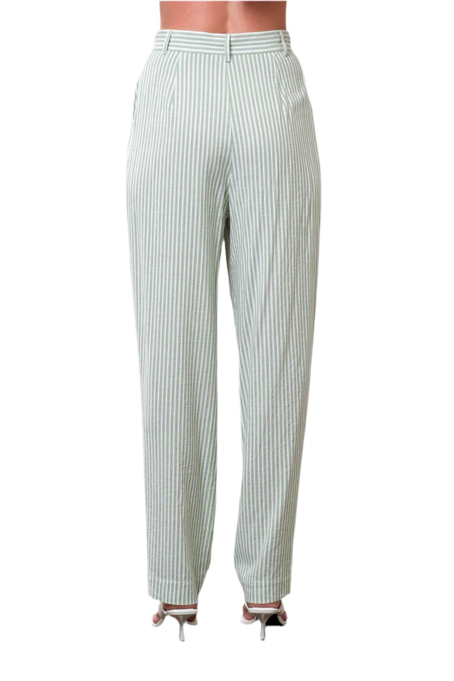 Elevate your summer style with the Adjustable Stripe Pants by MOON RIVER, crafted in a chic sage green and white. These high rise pants feature a relaxed, wide leg fit with an adjustable button bottom for versatility. The stripe pattern and pockets enhance its minimalist and vacation-ready appeal. Care: Hand wash and line dry.