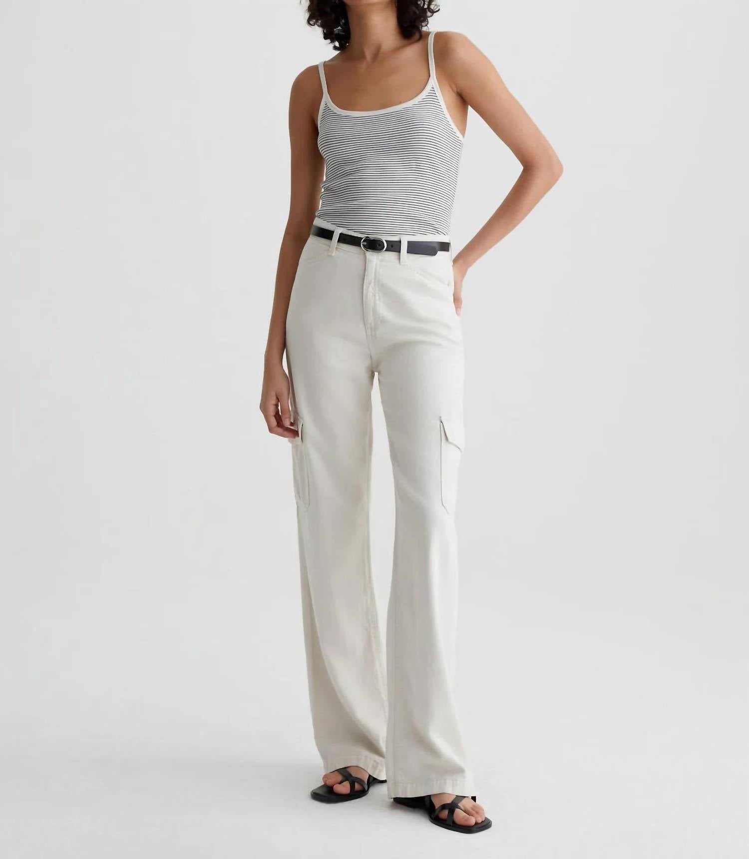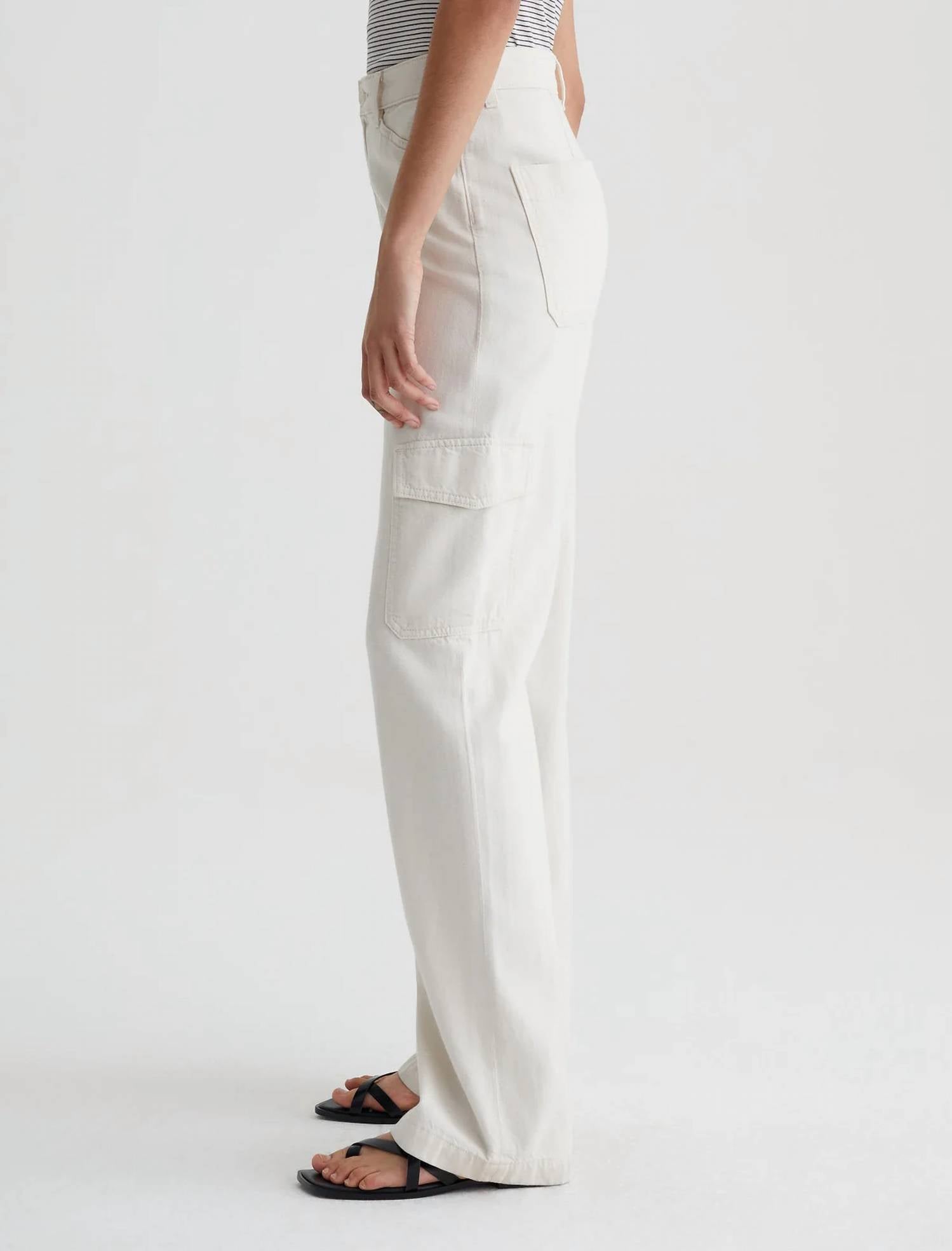 Embrace utilitarian chic with the AG Jeans Gatina Cargo Pants in Opal Stone, crafted from 9.25 oz. Hazy Silk Denim, a luxurious blend of silk, modal, and cotton. These high-rise cargo pants boast long, wide legs and practical flap pockets on the sides, complemented by angled hip pockets and patch pockets at the back for ample storage. Designed with a button closure, these pants are a minimalist staple for your fall travel wardrobe.