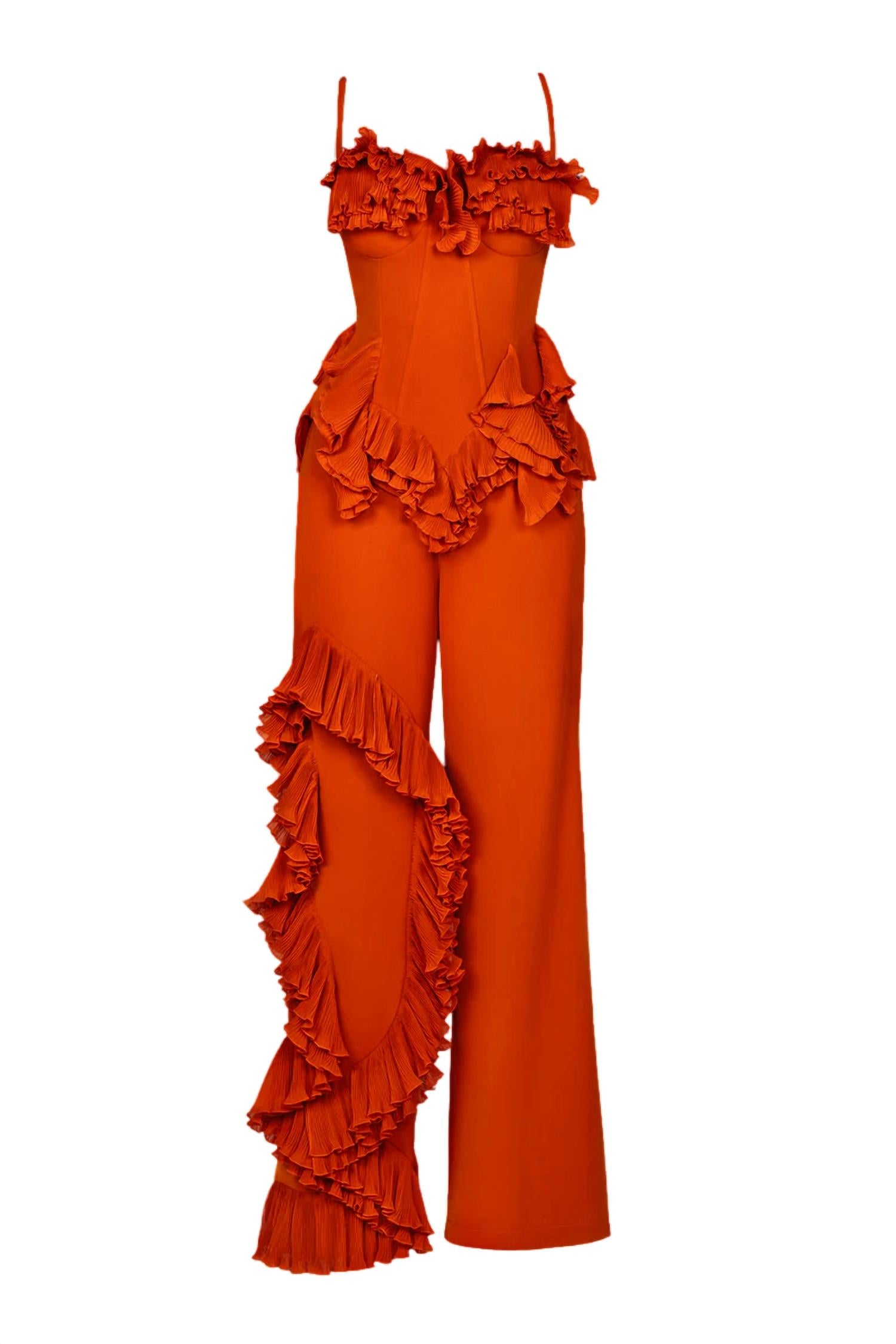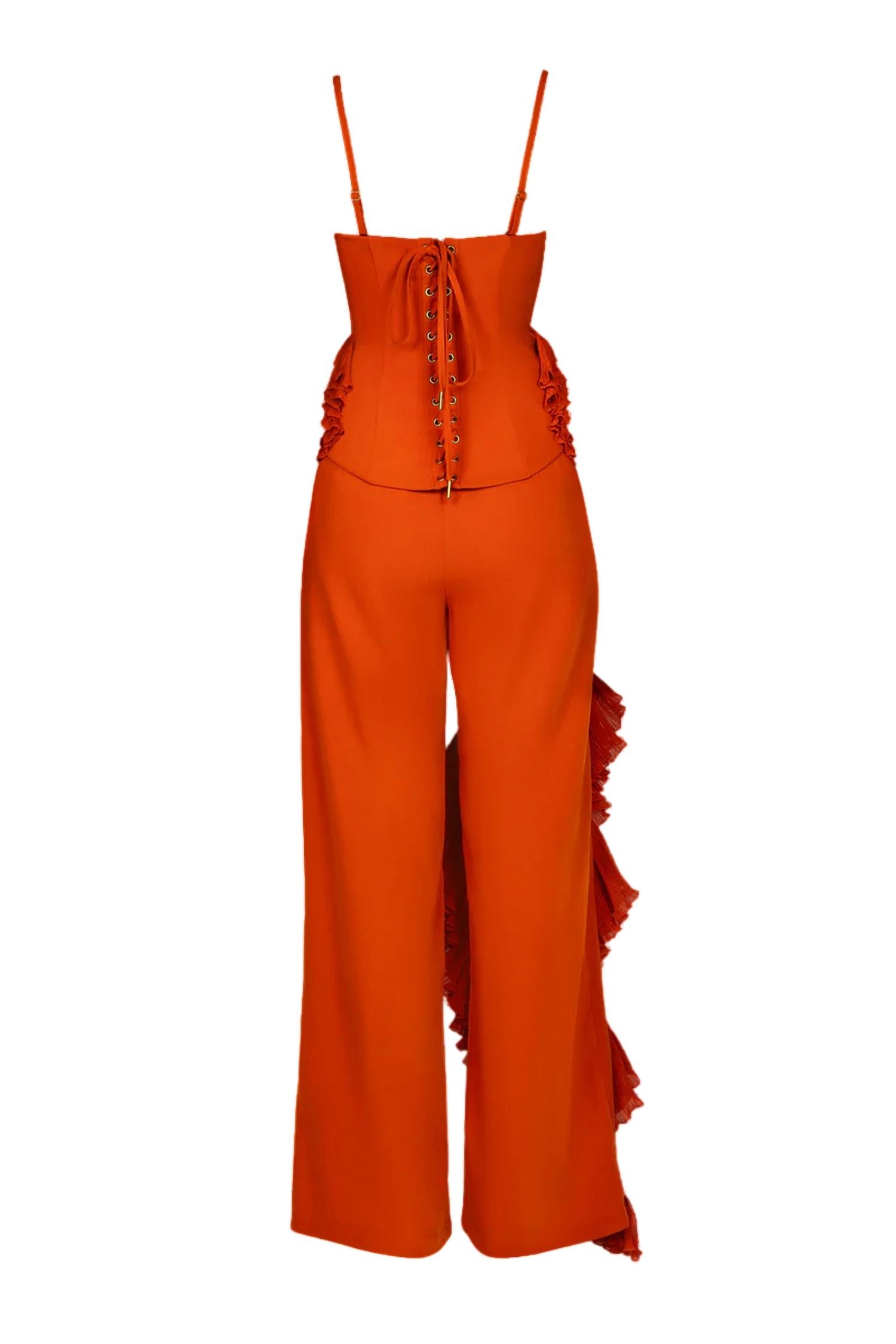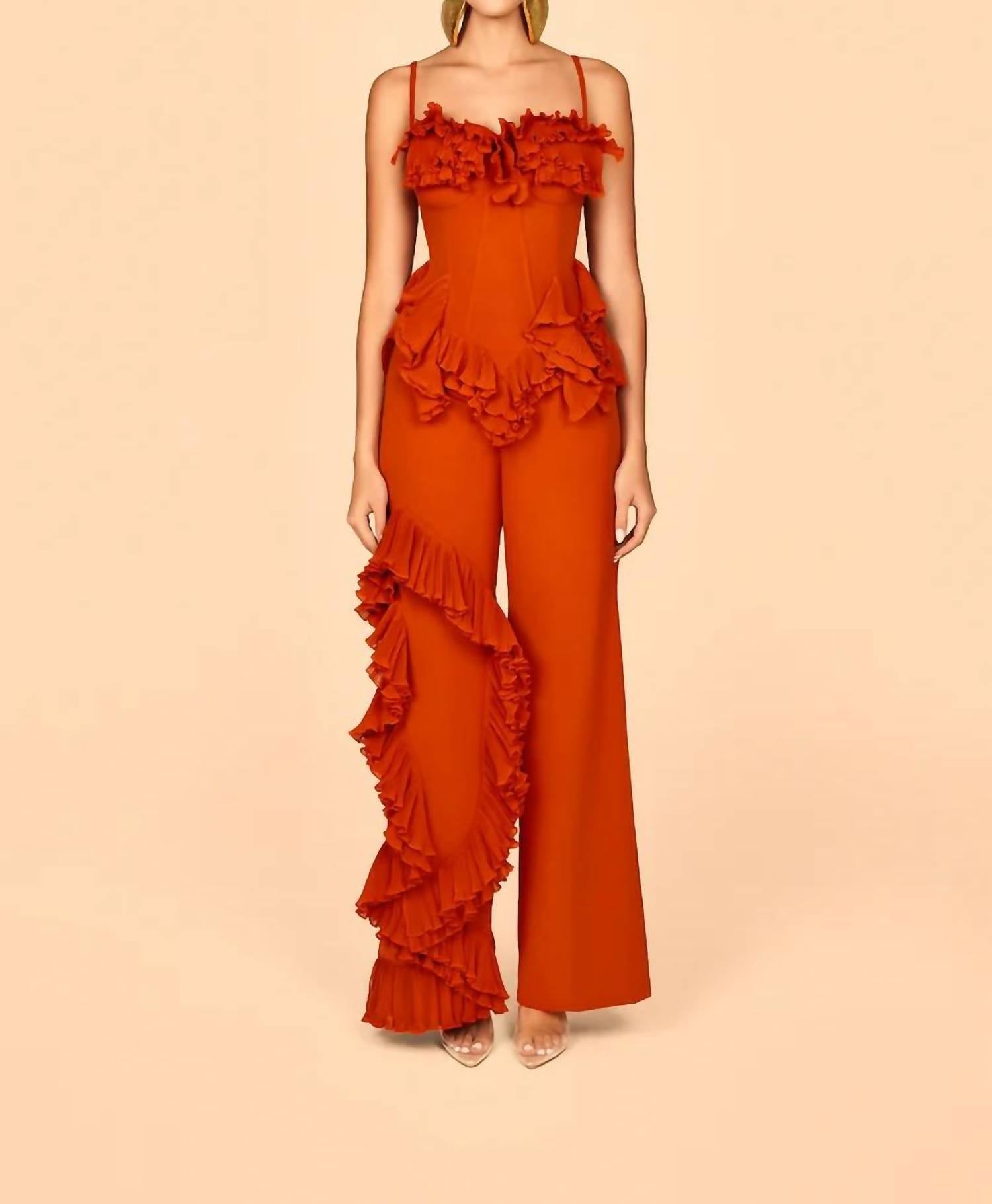 B FYNE presents the Asha Ruffle Pants, a statement piece perfect for any evening event. These wide-leg pants feature a high-waisted fit with pleated ruffle trim for added flair. The design boasts a classic fit tailored for women, in a stunning burnt orange solid hue. Closure: Side zipper. Ideal for fall, they capture the essence of 90s fashion.