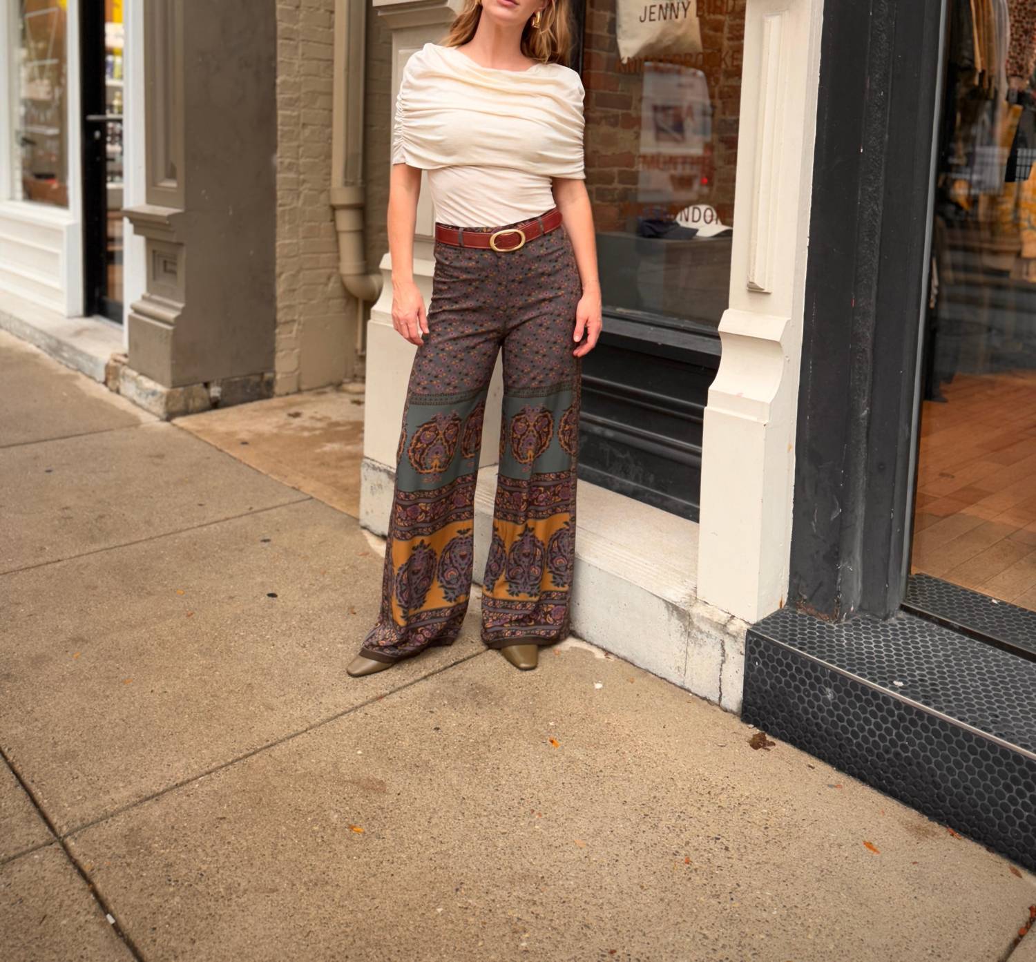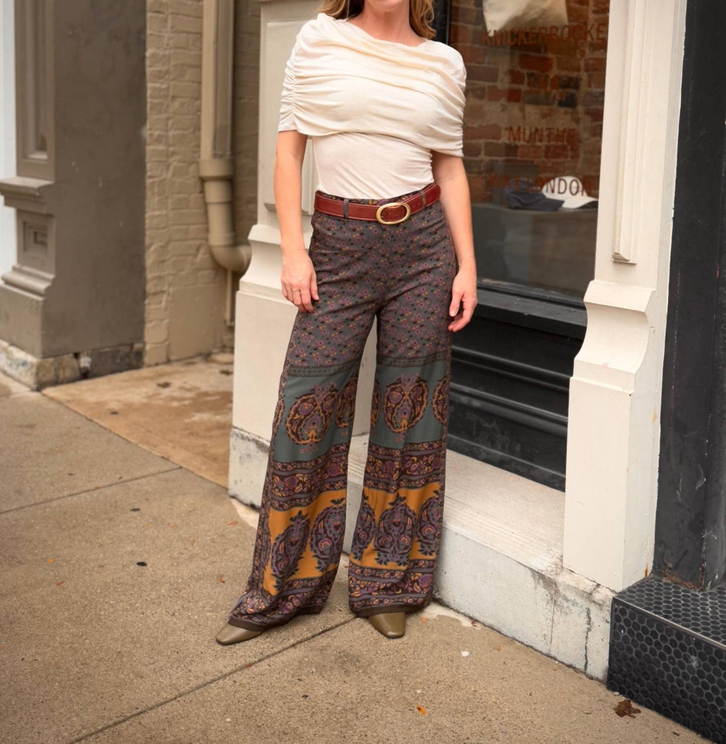 Elevate your summer wardrobe with the Ba&sh Paris Brany Pants in rich Chocolat, perfect for a dinner party or a 4th of July celebration. Crafted from a luxurious viscose blend, these high-rise, wide leg pants feature a patterned design that exudes Parisian refinement. The pull-on closure offers a comfortable fit without pockets for a sleek silhouette. Care is easy with machine wash and tumble dry instructions, ensuring these maximalist pants maintain their effortless elegance.