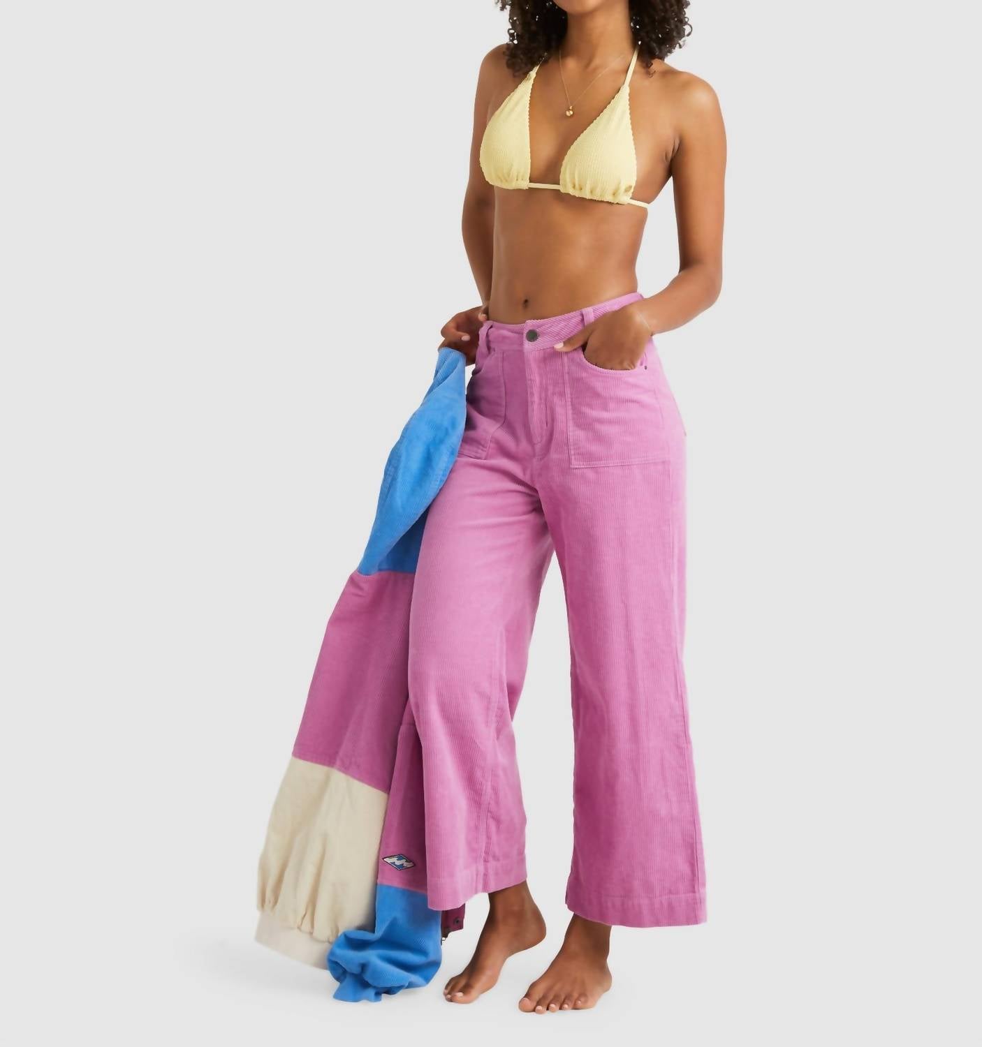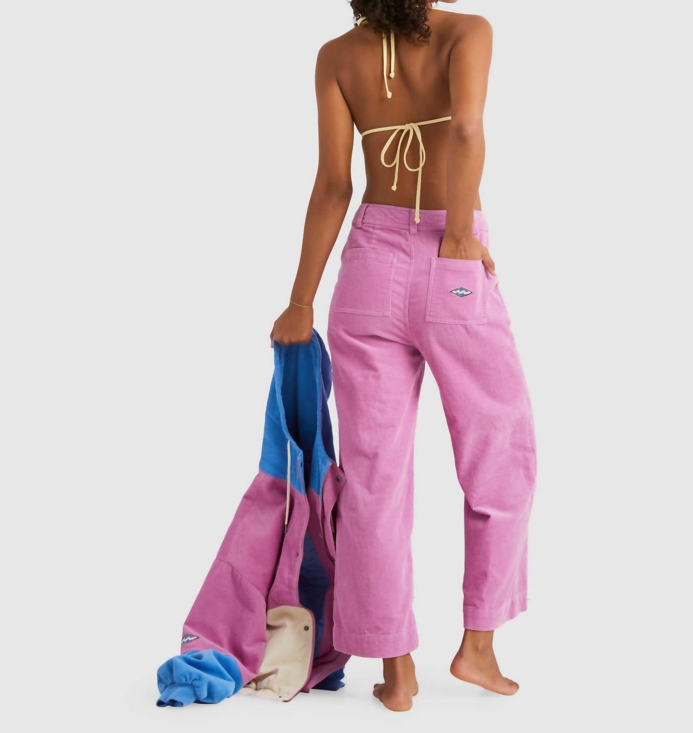 Introducing the Sea Tone Pants by Billabong, a chic addition to any wardrobe with a textured cotton corduroy fabric in a dusty rose hue. Designed with a fitted waist and wide legs, these pants offer a flattering silhouette. The button fly closure and practical front patch and back pockets enhance its functionality. Finished with an embroidered logo on the back pocket, these pants perfectly blend style and practicality.