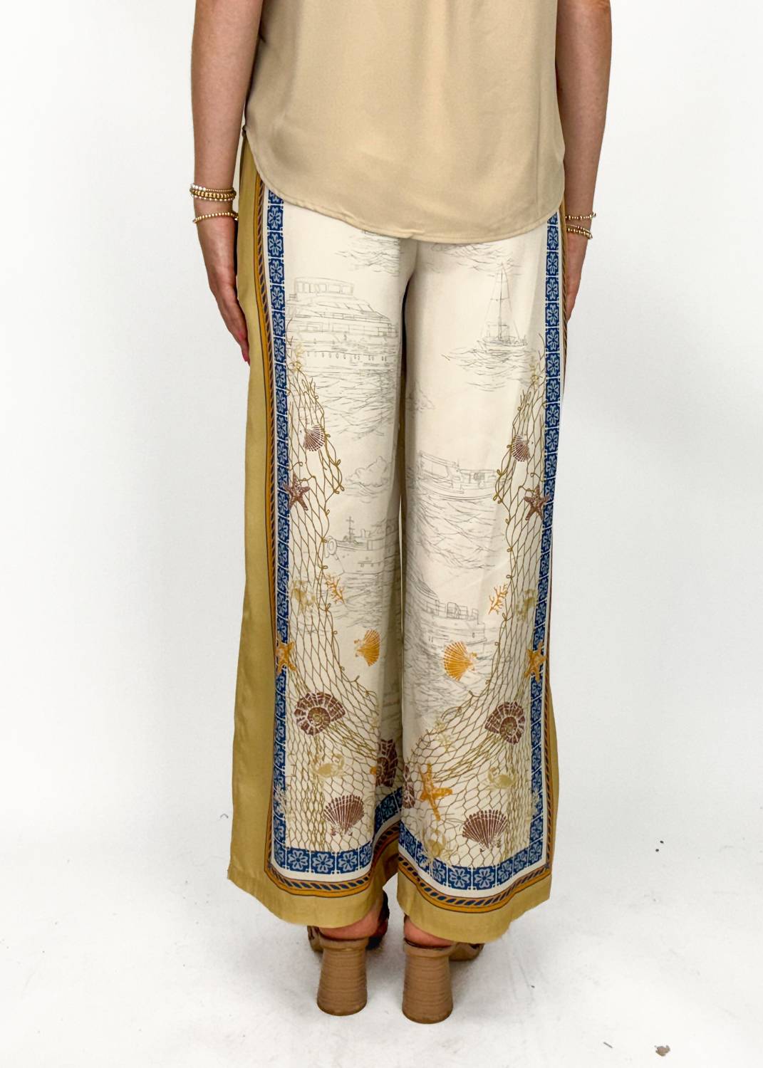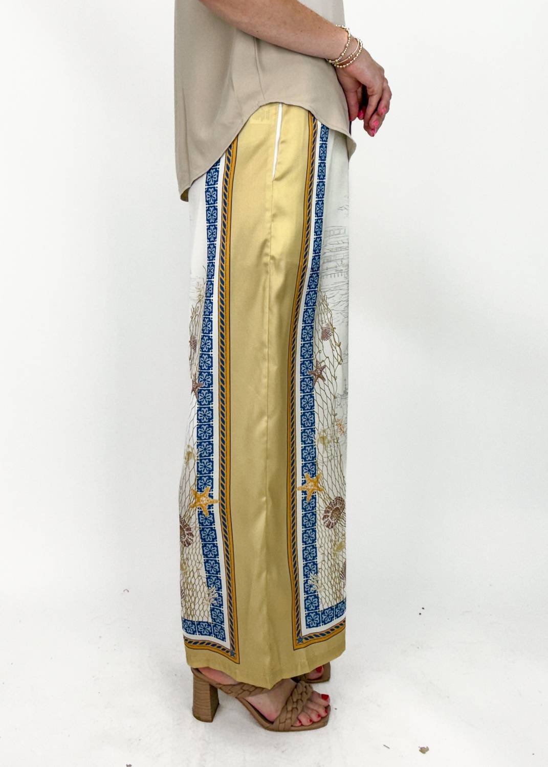 Embrace summer vibes with the Brielle Wide Leg Pants from Current Air, featuring a relaxed fit and mid-rise waist for all-day comfort. These light taupe multicolor pants are crafted from luxurious linen and feature a stylish patterned trim. Designed in a wide leg style with convenient pockets, they ensure ease of movement and flattering silhouettes. Closure: Pull on. Care: Machine wash and line dry, perfect for travel and your next boho chic occasion.